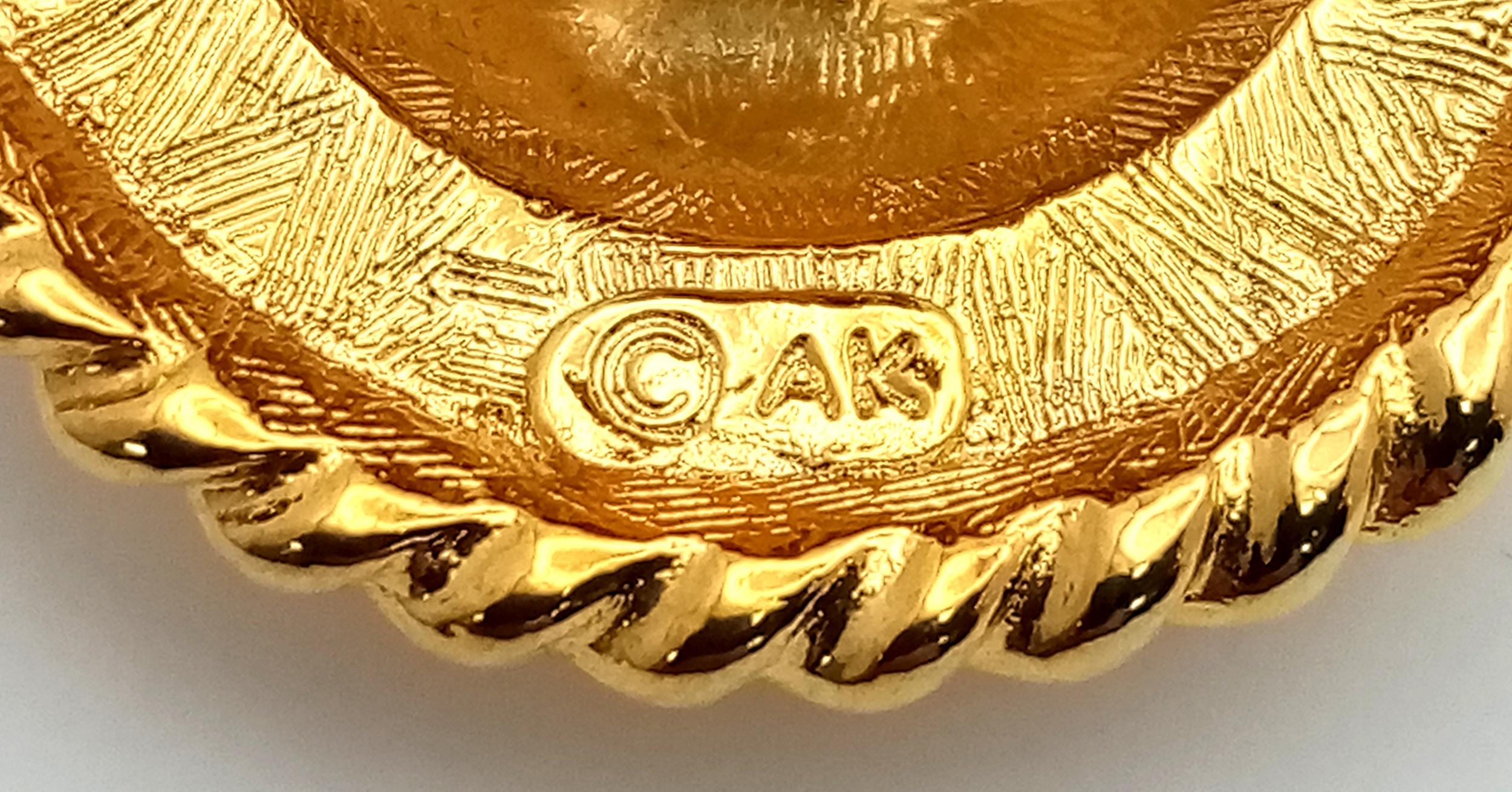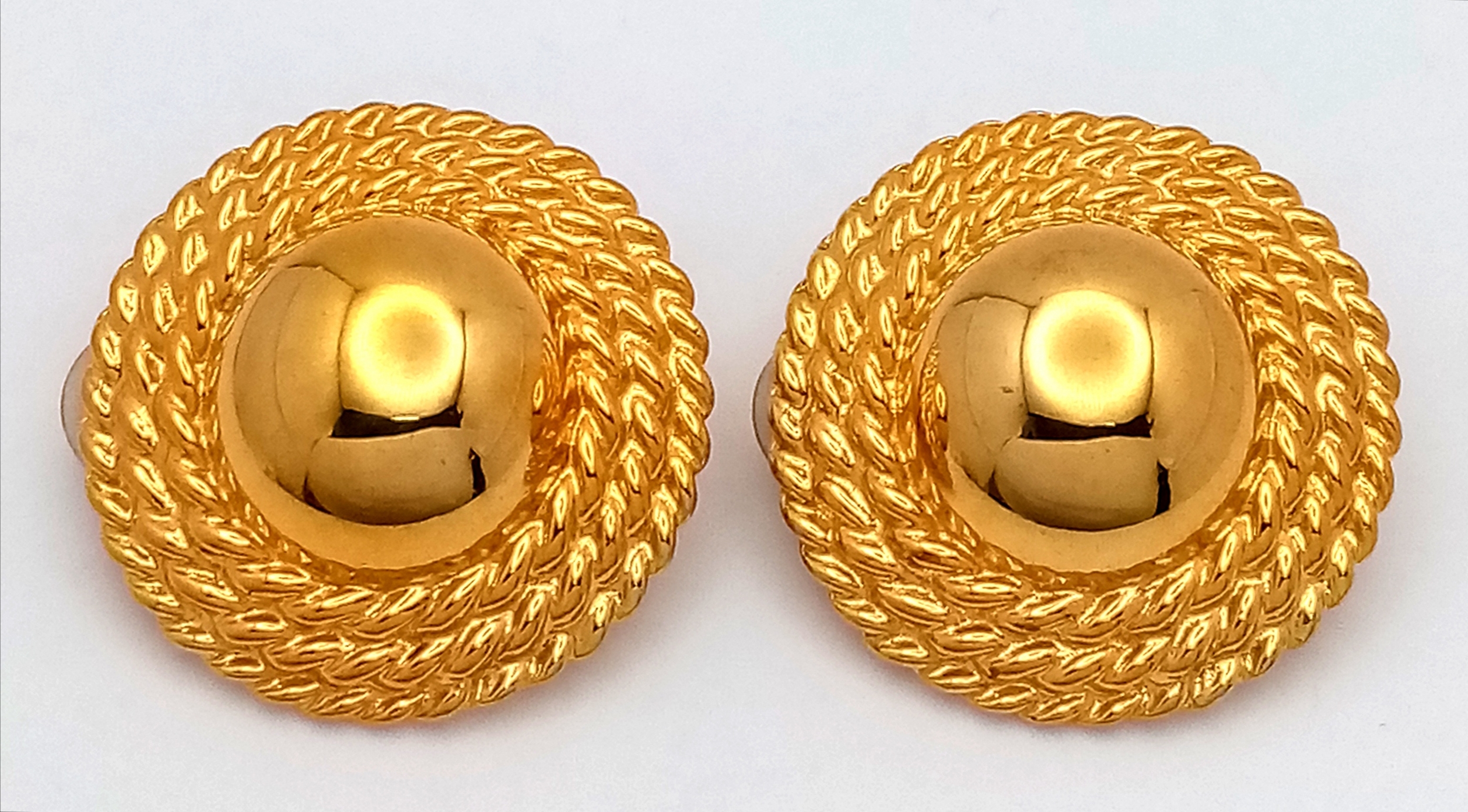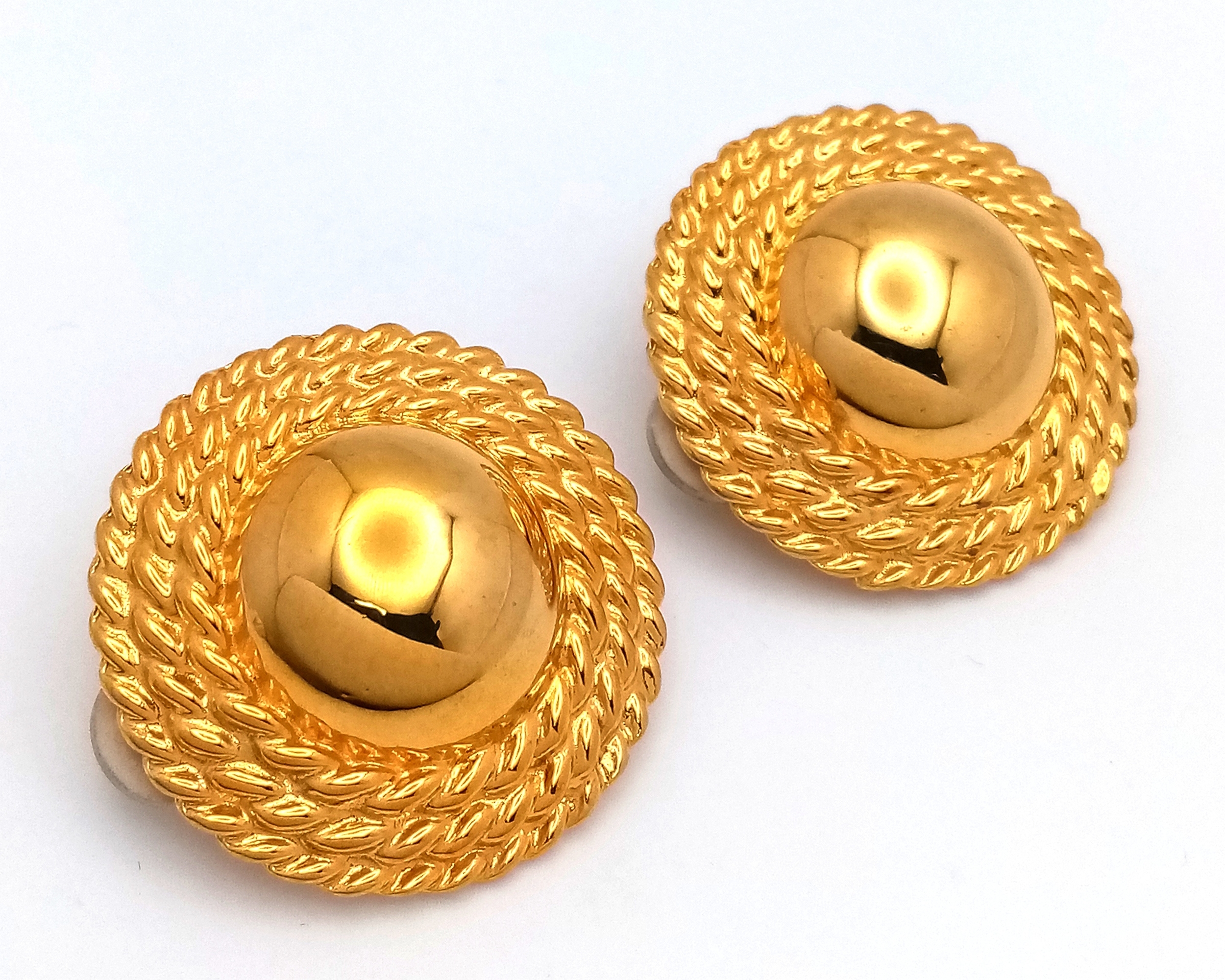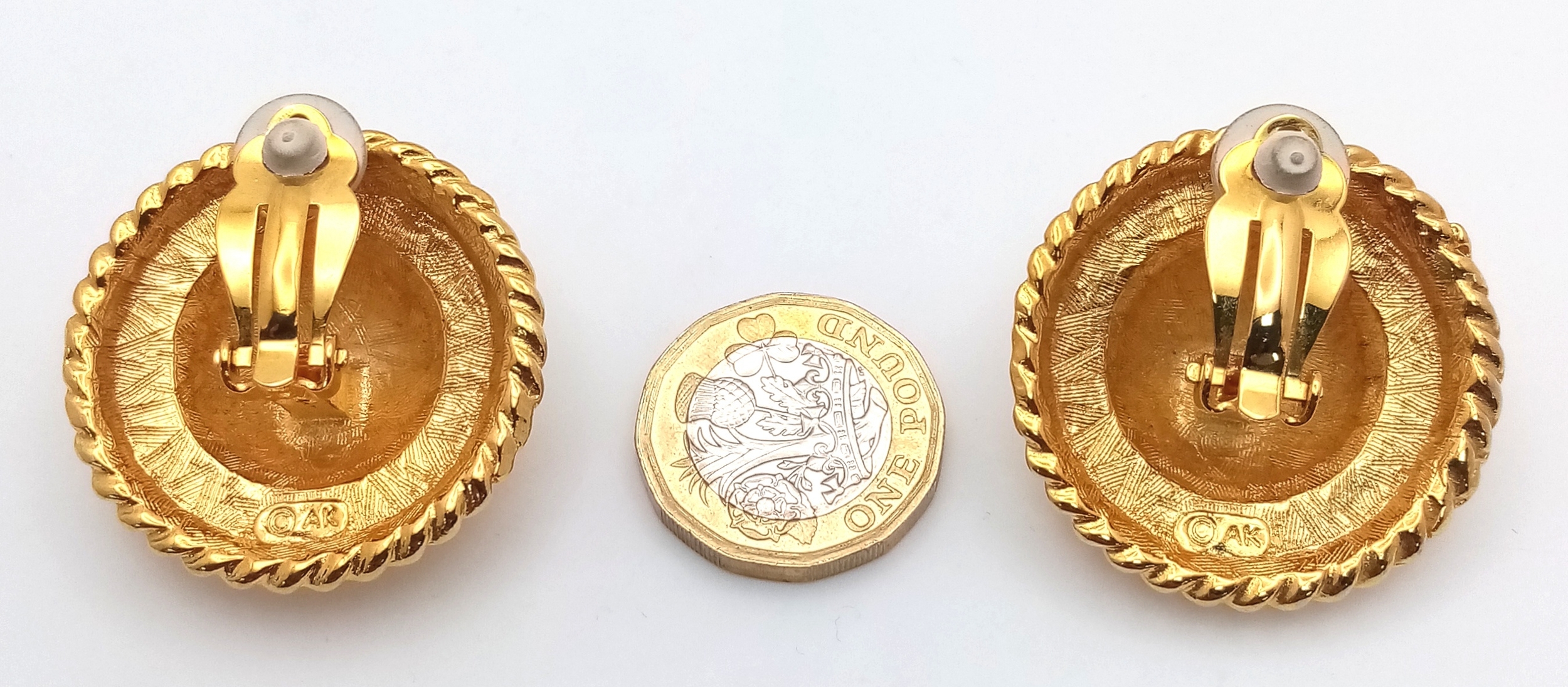 A vintage 1980s pair of gilded designer Anne Klein clip-earrings. New old stock. Diameter approx 4cm.