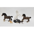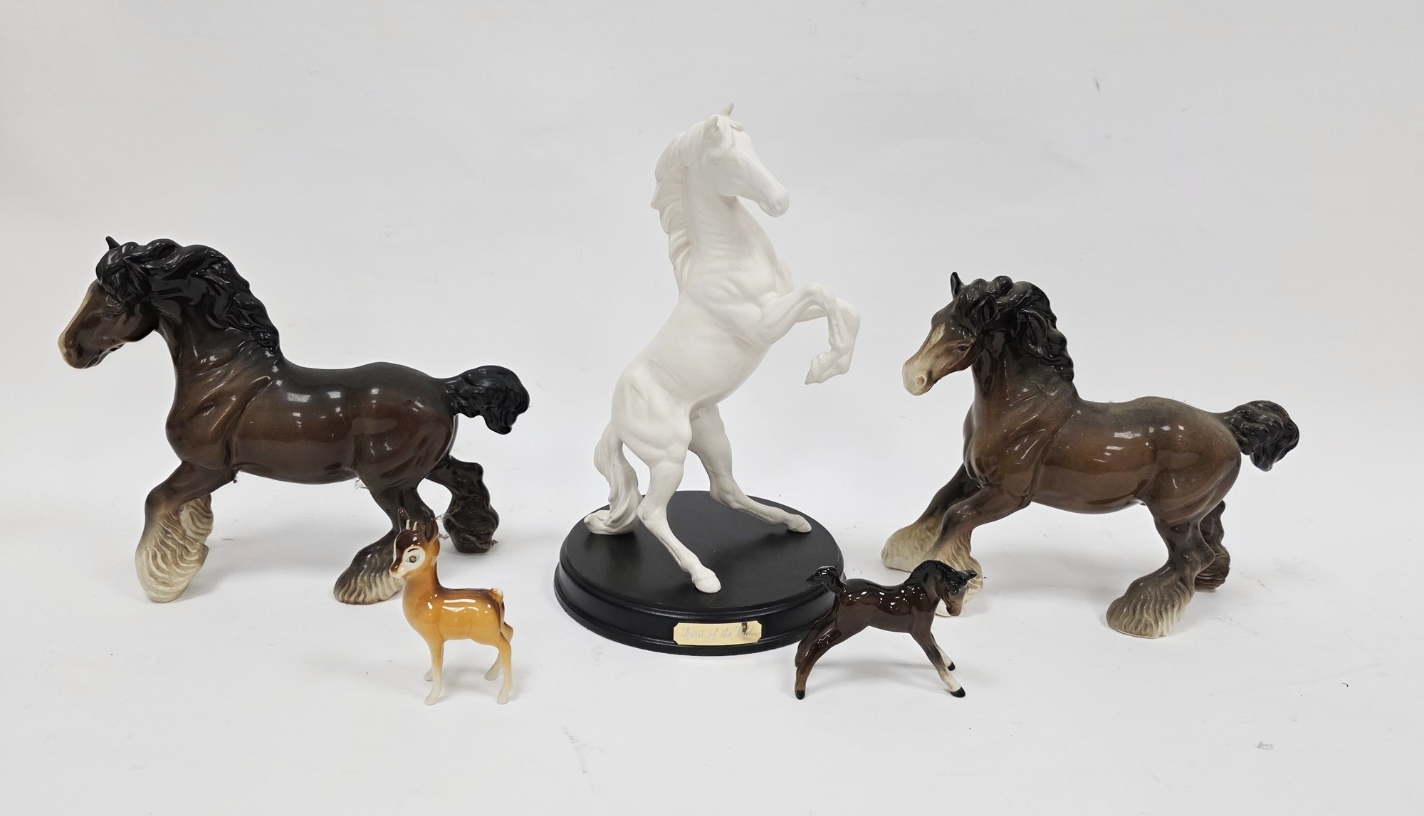 Royal Doulton Spirit of the Wild white model of a rearing stallion, on circular wooden base, applied with Royal Doulton label, 32.5cm high, two Beswick models of chestnut shire horses, a model of a foal and a Chamois (5)