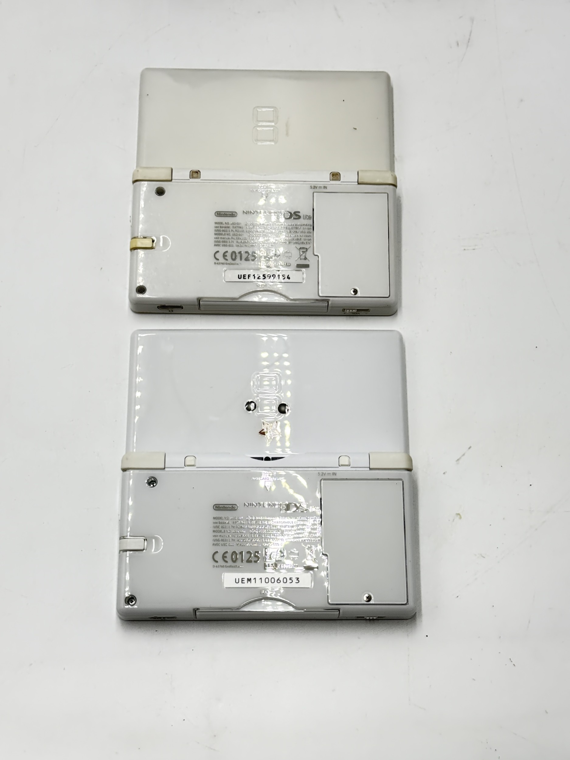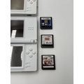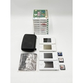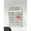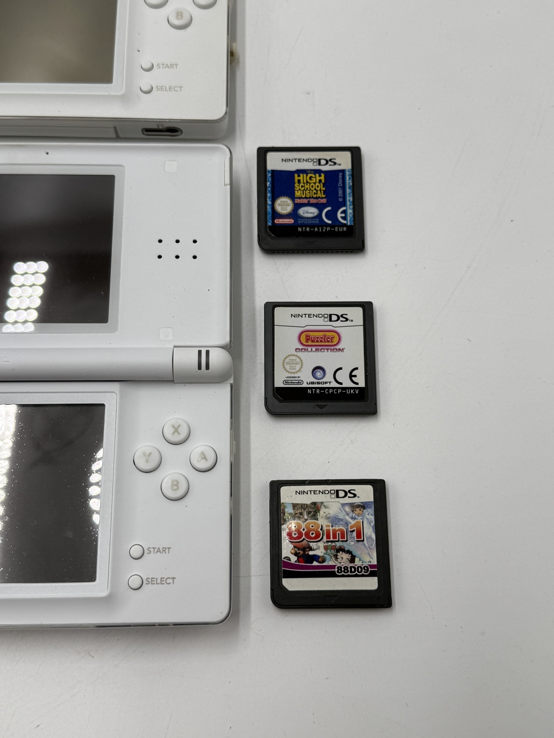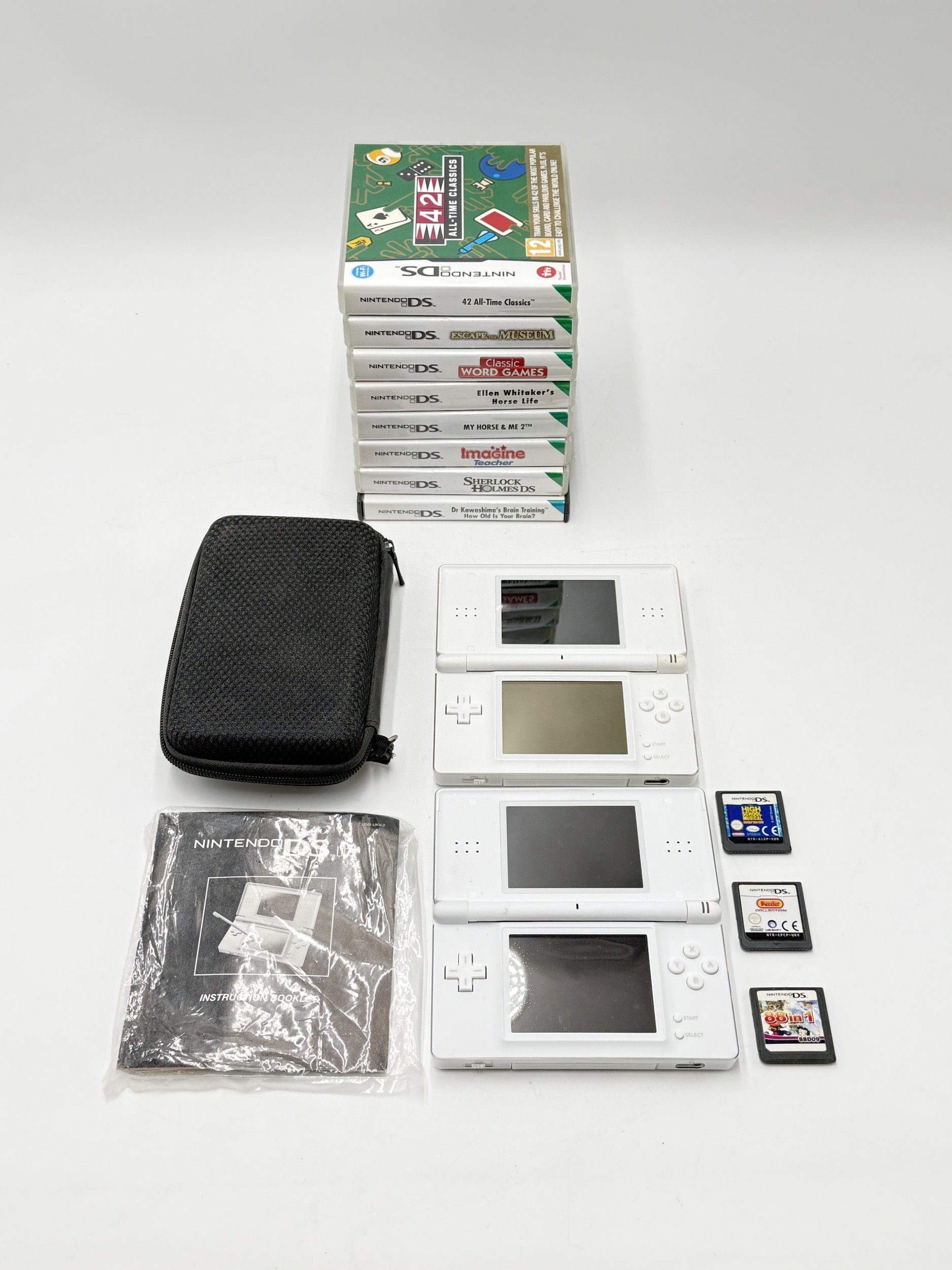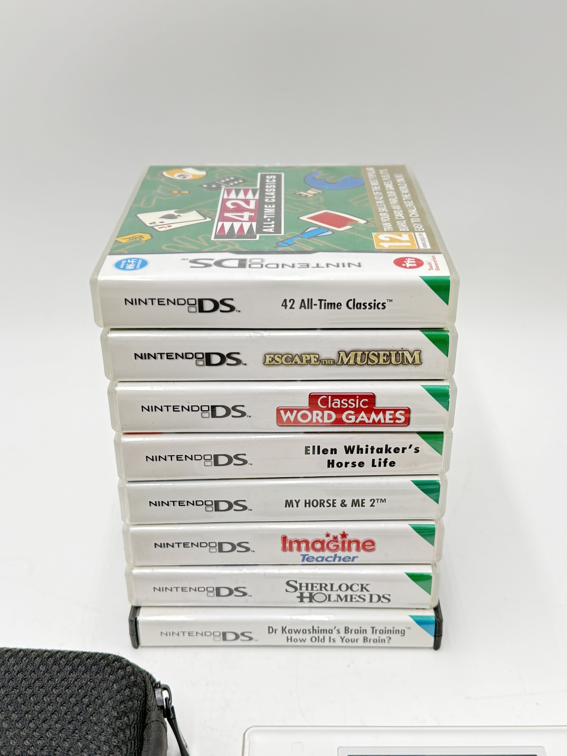 Two Nintendo DS lite handheld game consoles together with eight game to include Sherlock Holmes DS, 42 All-time Classics, Escape The Museum etc.