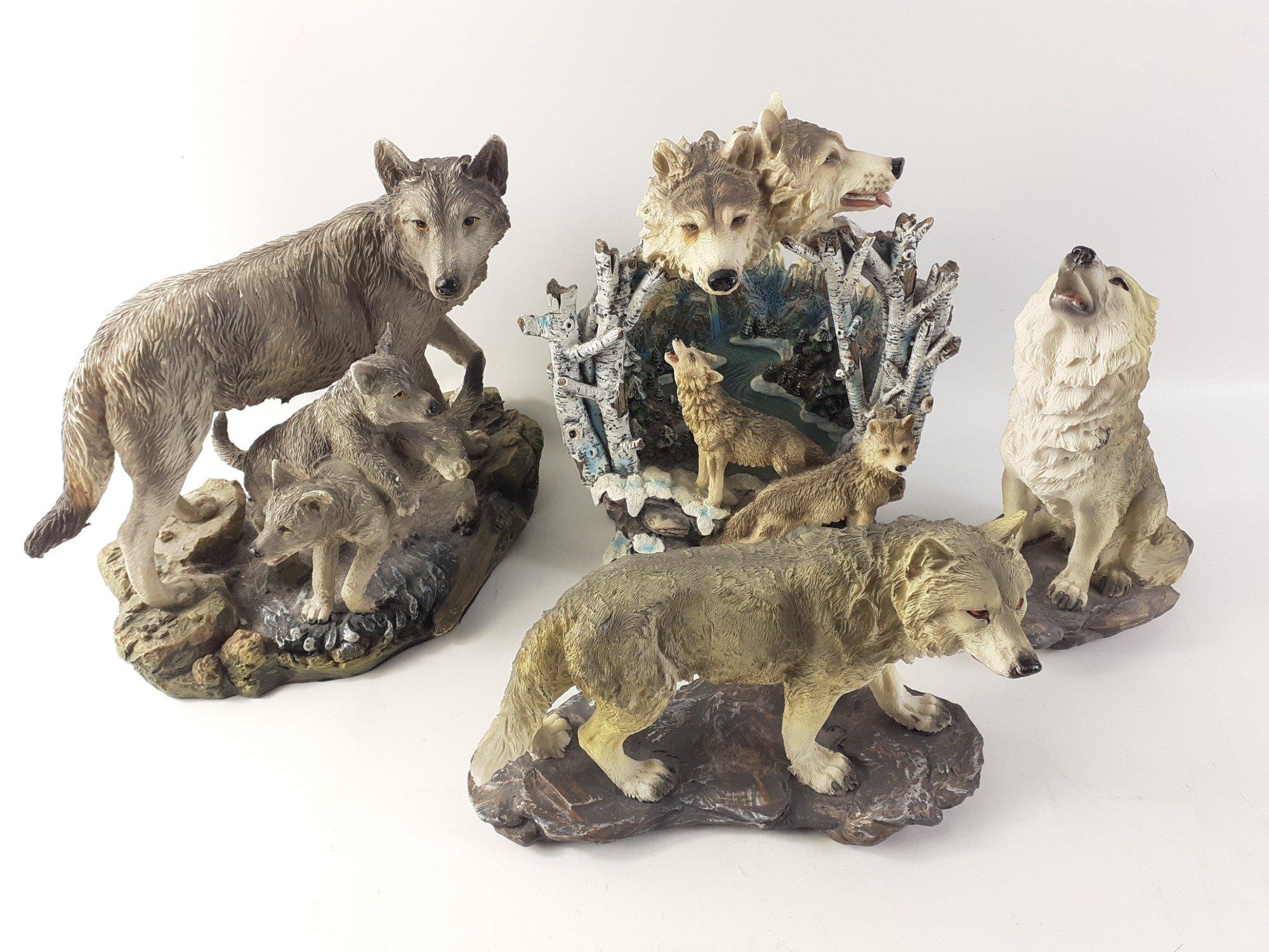 A collection of WOLF FIGURES to include a rather impressive mountain diorama (23cm high approx), A CROSA Mother Wolf with Cubs and two others.
