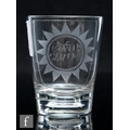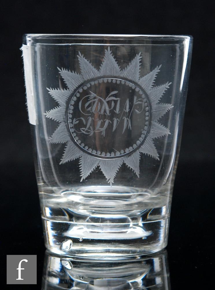 A late Georgian clear crystal glass tumbler, circa 1810, the slightly tapered cylindrical body with an internal sediment collector to the base, the body engraved with an oval sunburst cartouche with monogram, height 10.5cm.