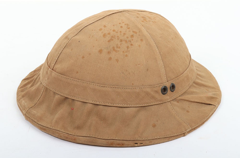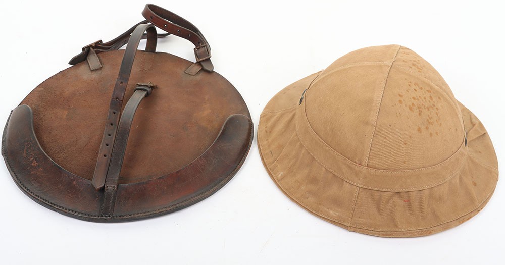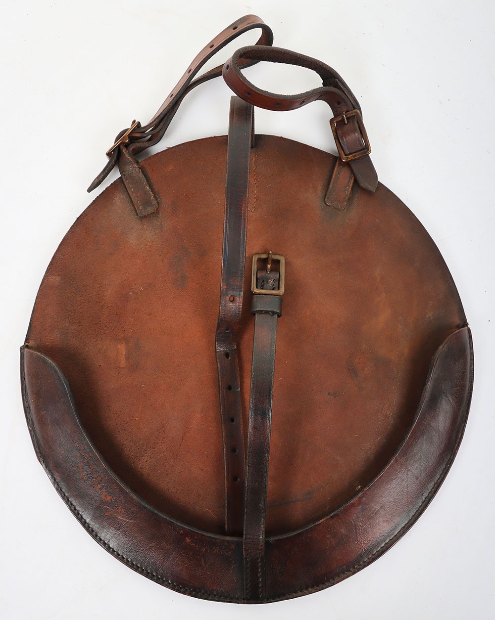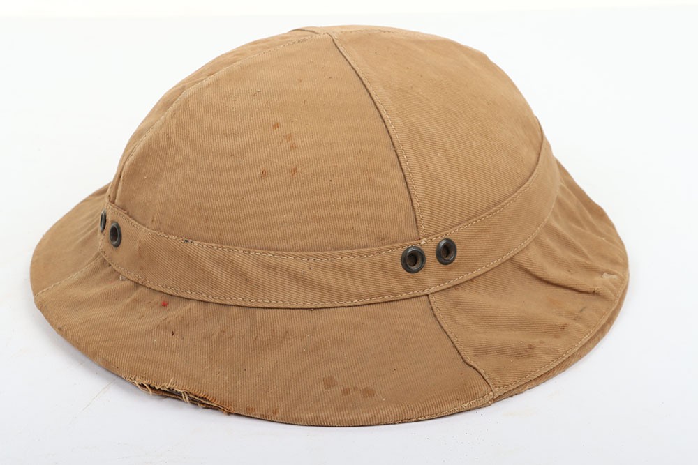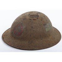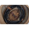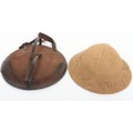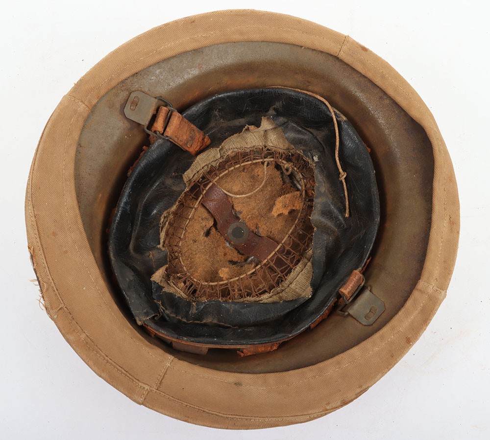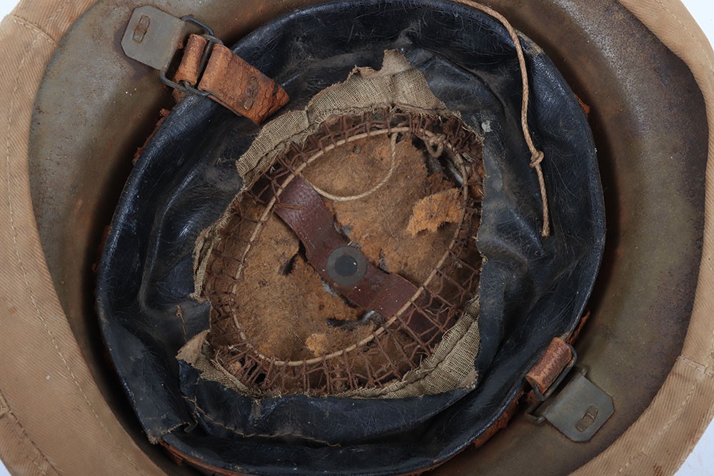 WW1 British Steel Combat Helmet with Trench Cover, good example of a standard 2nd model brodie steel helmet with cover to the brim. Complete with its oilskin liner system which has pink brodie stamp to the underside. The helmet has an original issue type khaki cloth four panel trench cover with eyelets. Also accompanied by a later made leather helmet harness / carrier. (2 items)