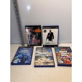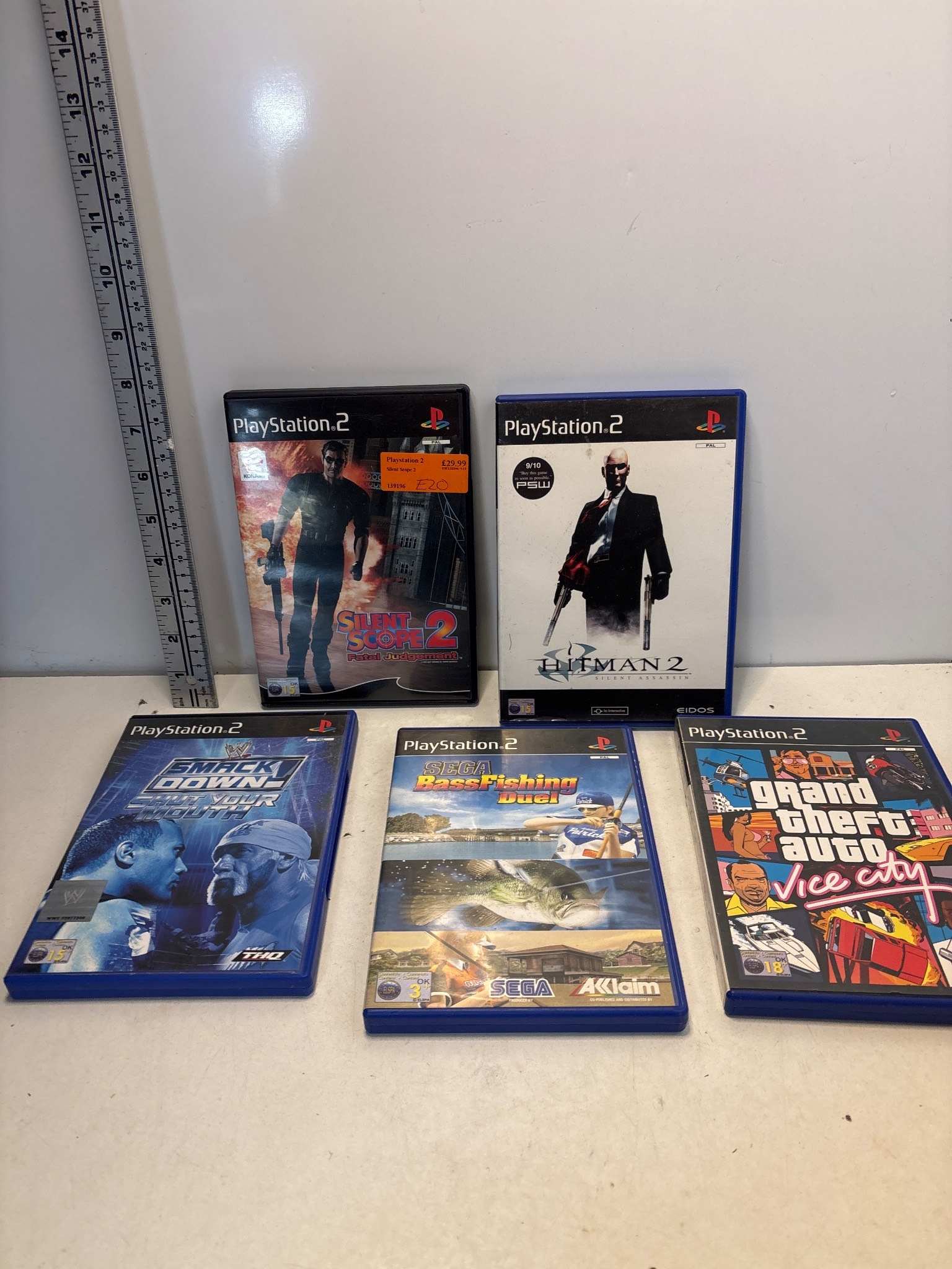Five PlayStation 2 games including titles such as 'Silent Hill 2,' 'Hitman 2,' 'Grand Theft Auto: Vice City,' 'Ace Combat 5,' and 'Ratchet & Clank: Up Your Arsenal.' All games are in original cases; condition of discs and manuals is unspecified.