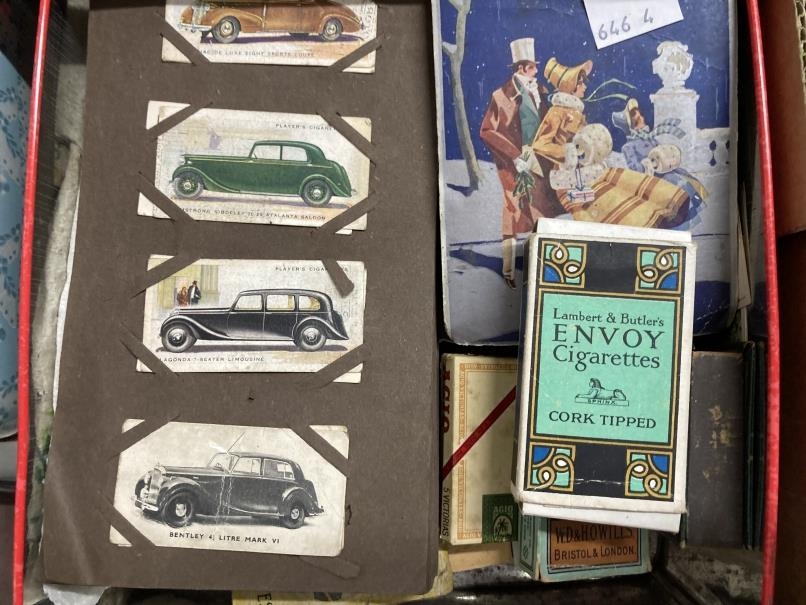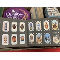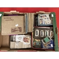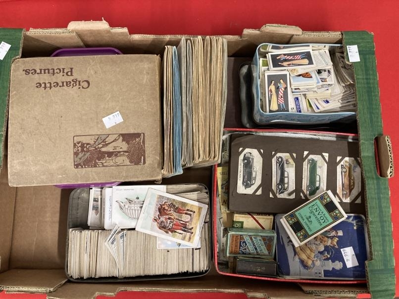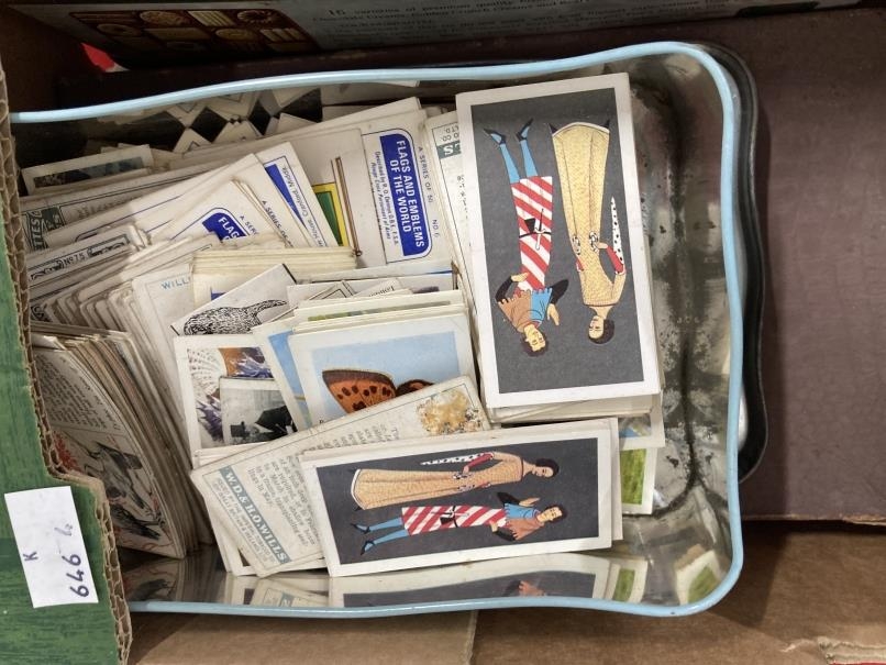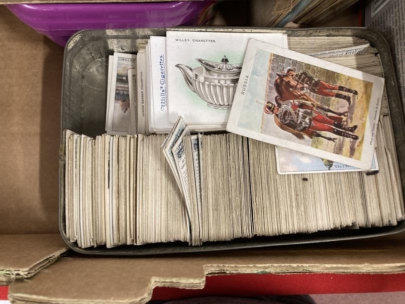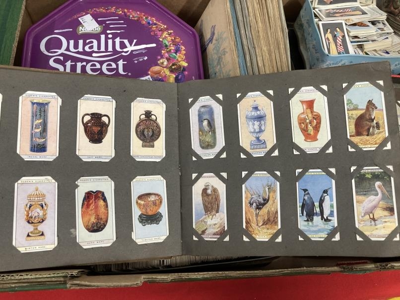 Cigarette Cards: Thousands of loose cards, some rare issues, two fully populated loose albums, ten manufacturer produced albums. Plus a Quality Street tin of miscellaneous copper and white metal world coins.