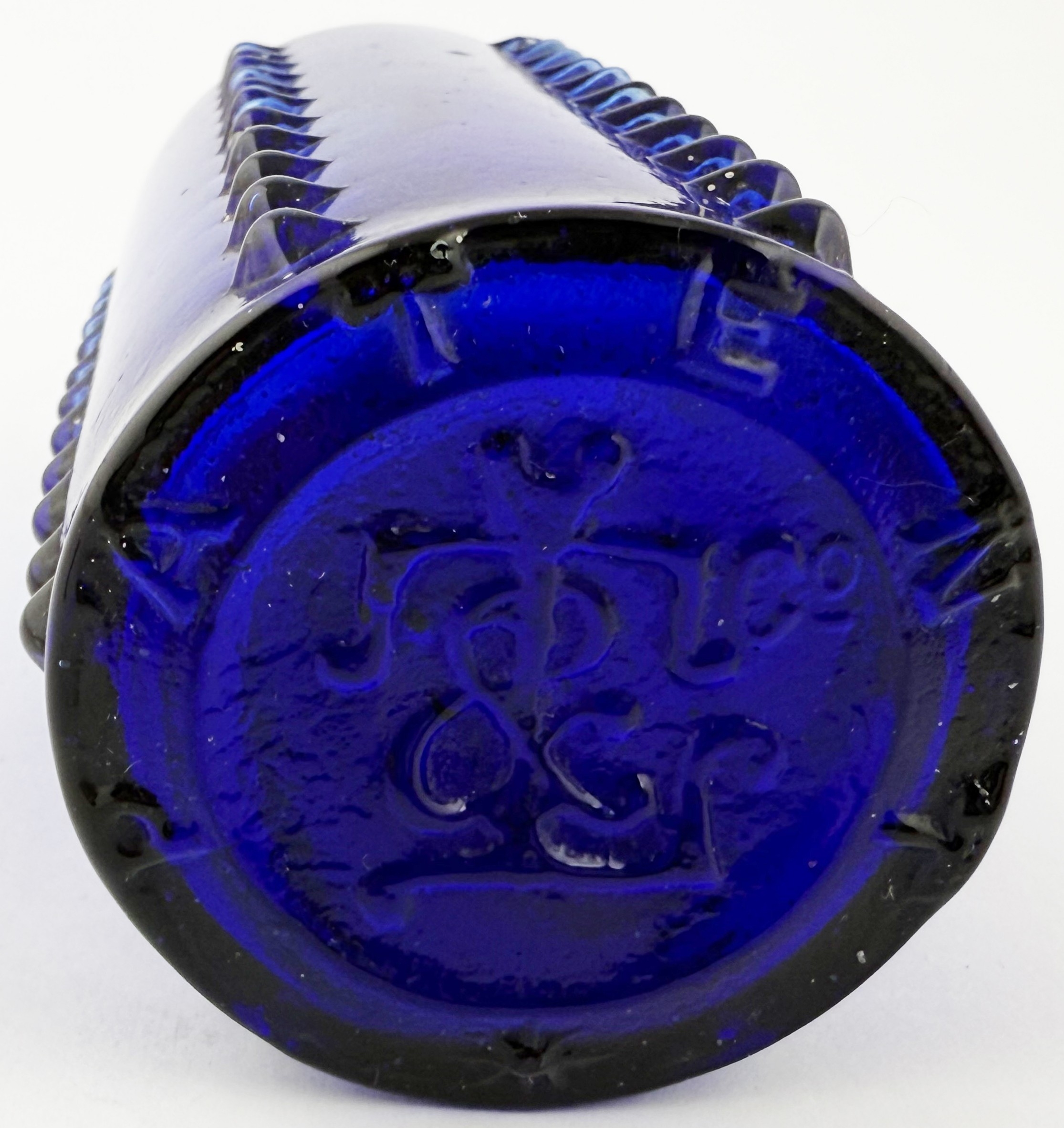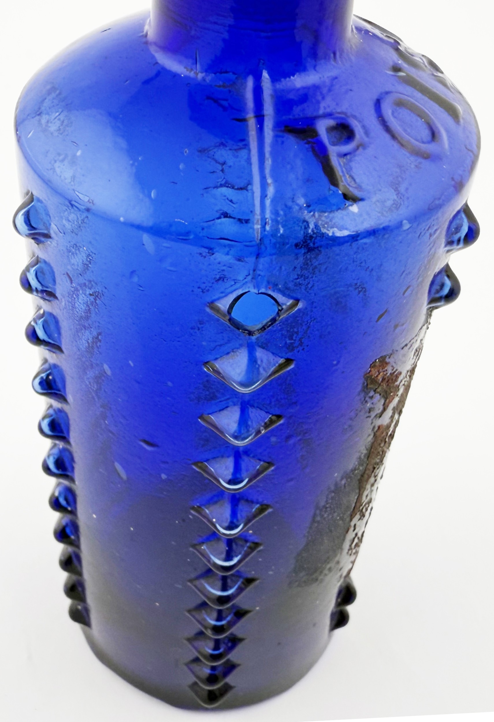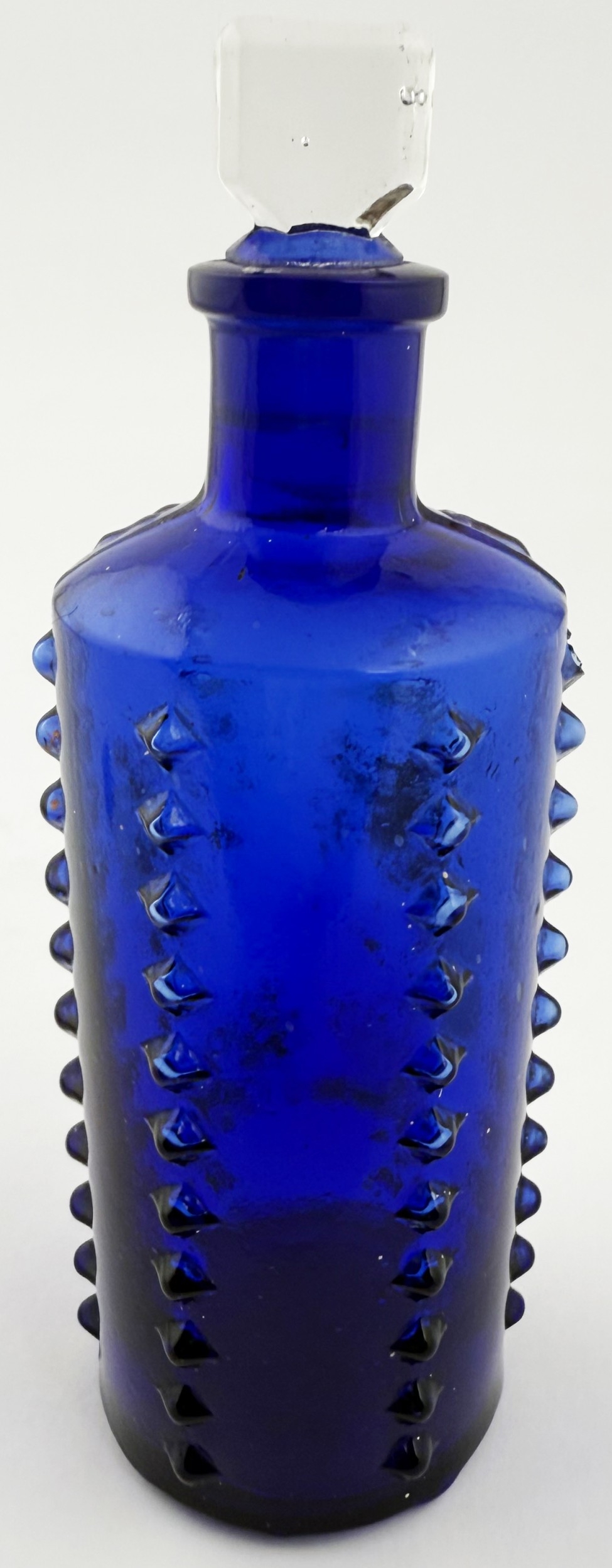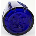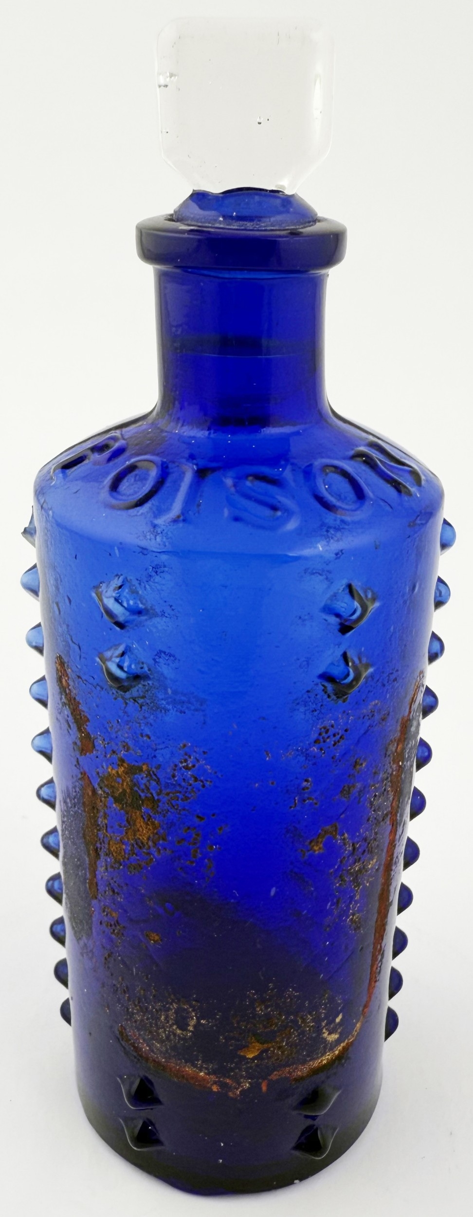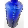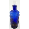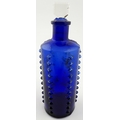 LYNCH/ L & T PATENT POISON BOTTLE. DP p50. 6.25ins tall. Cylindrical cobalt blue glass with six vertical rows of projecting moulded knobs (one burst). POISON circled on the shoulder, initials to base with PATENT round edge,stopper. Remnants of original painted label to rear.