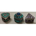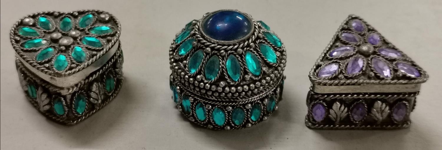 3 x retro Traidcraft (fair trade) white metal and jewelled pill boxes