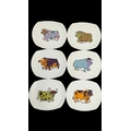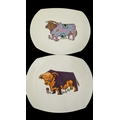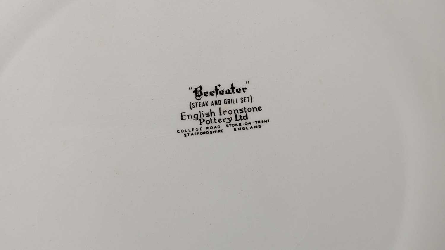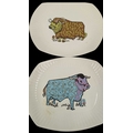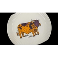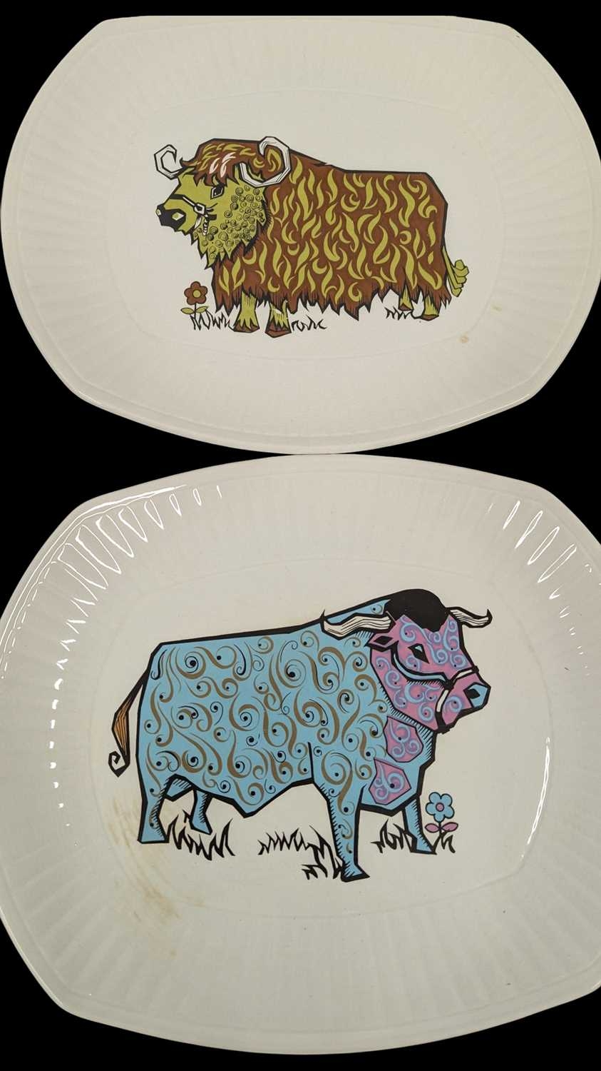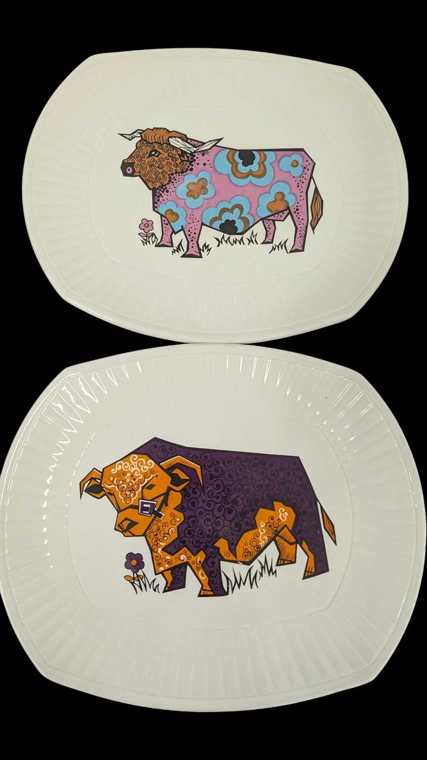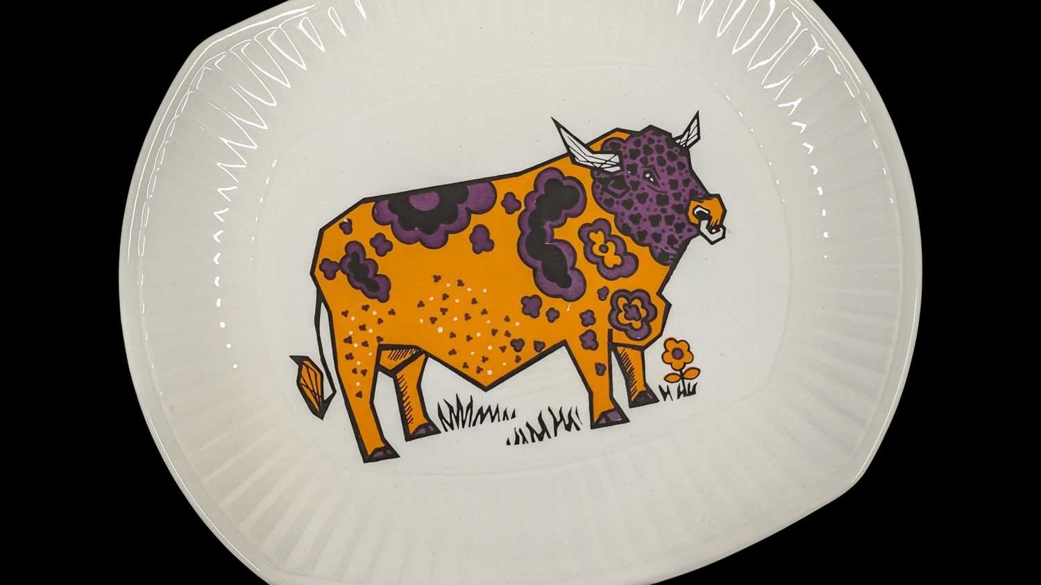 English Ironstone Pottery Limited - A set of six retro Beefeater steak and grill dinner plates. Depicting images of woolly bulls / cows in psychedelic colours. 24cm x 28cm approx.