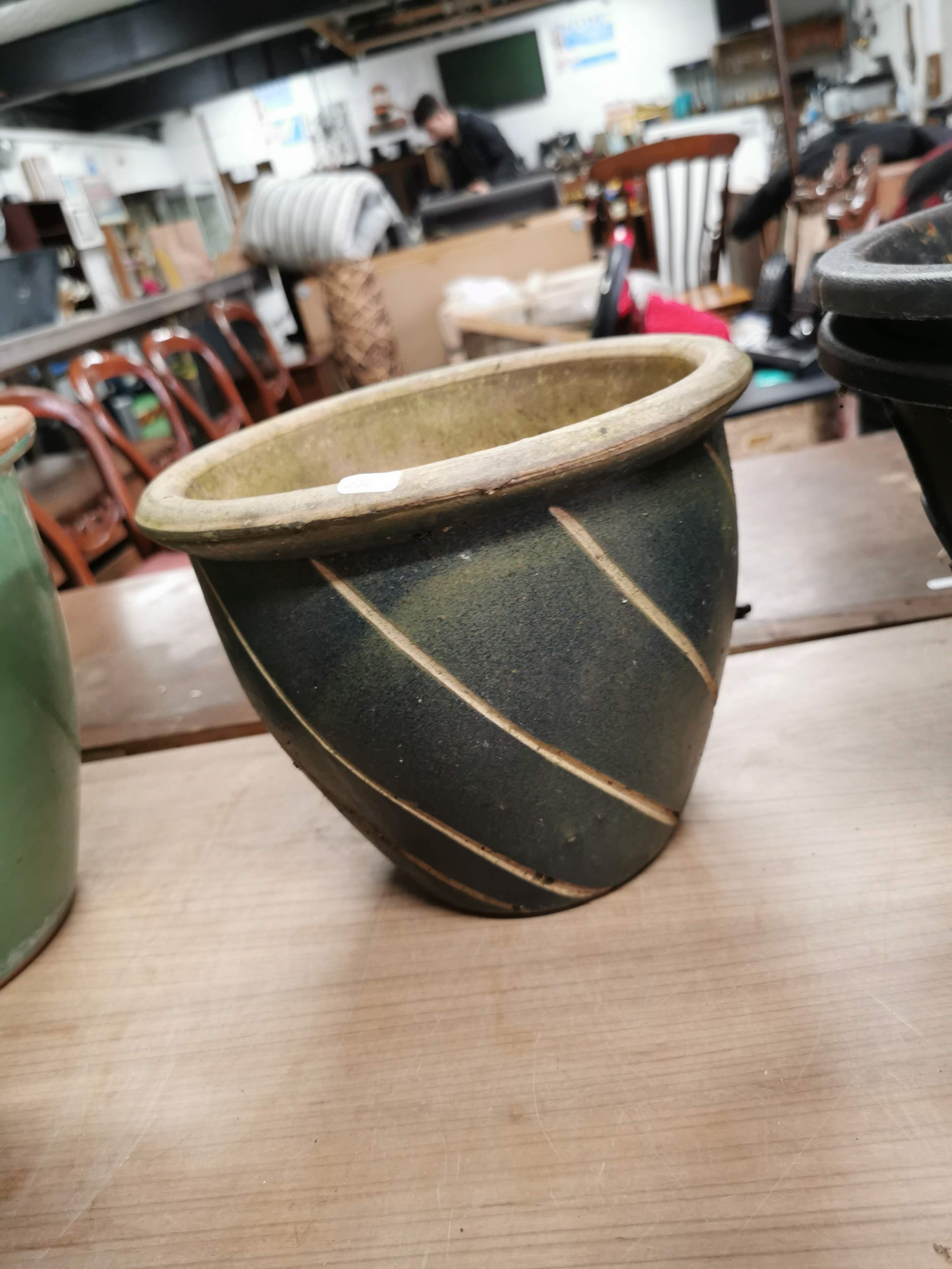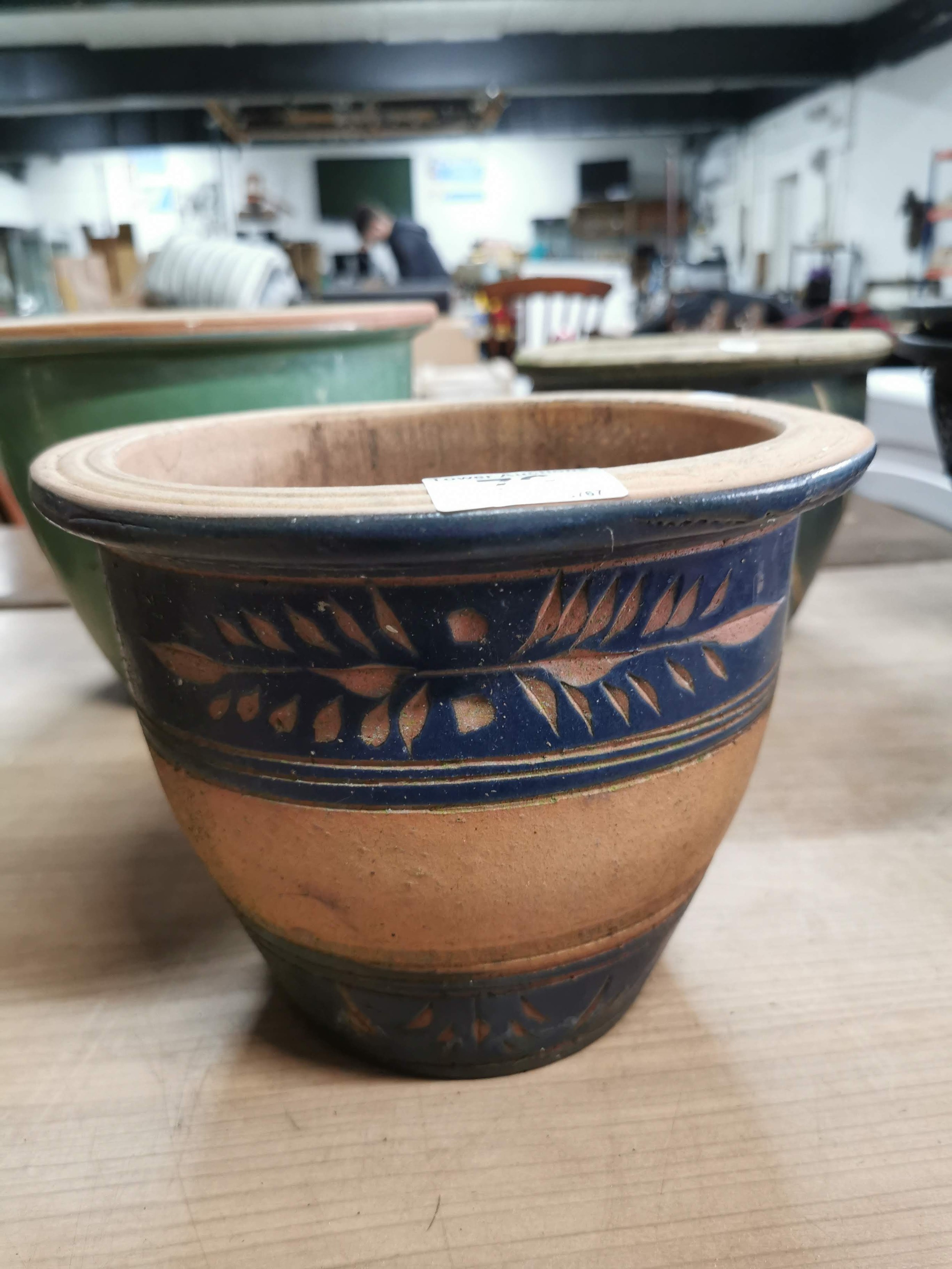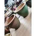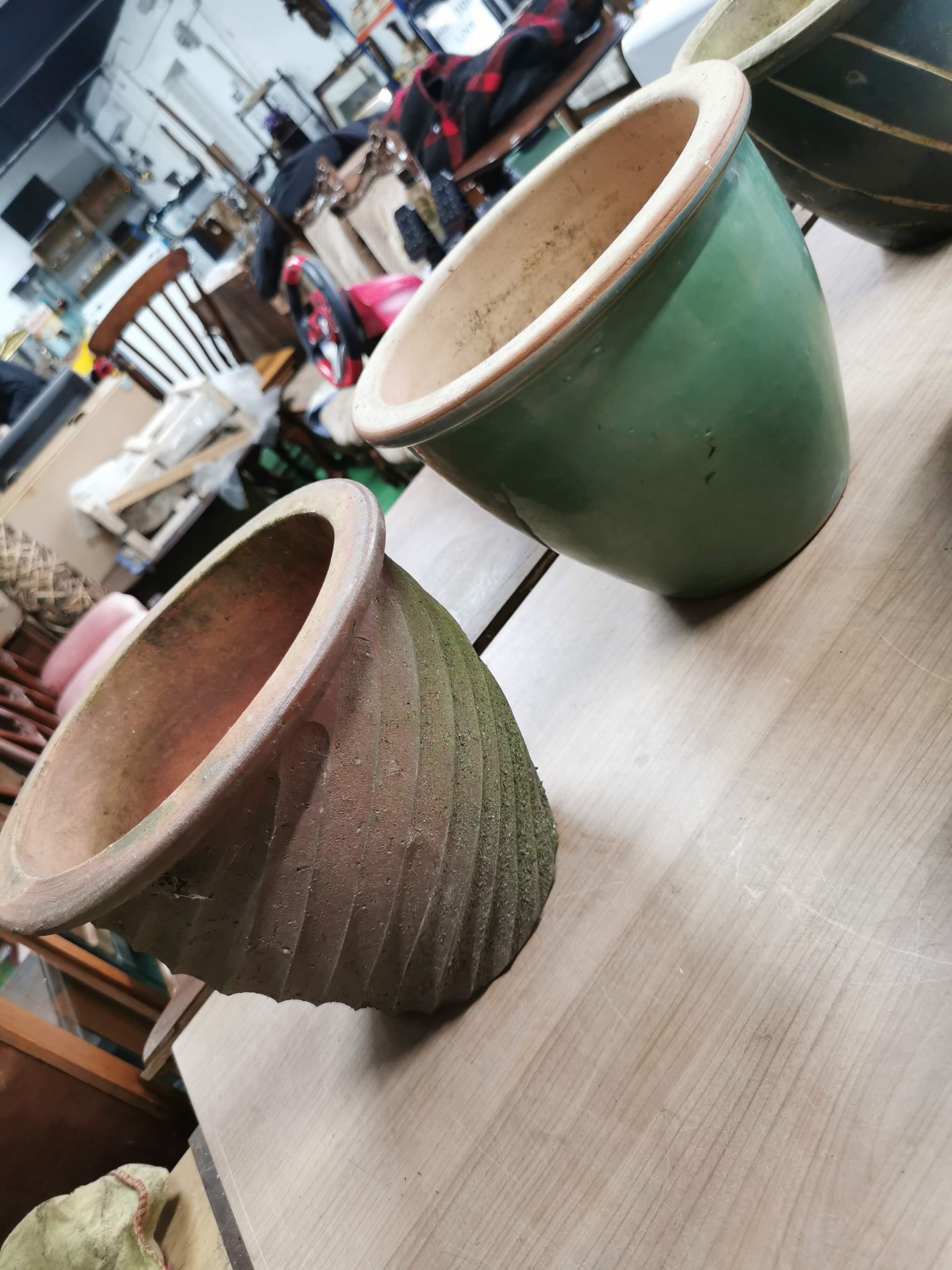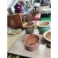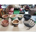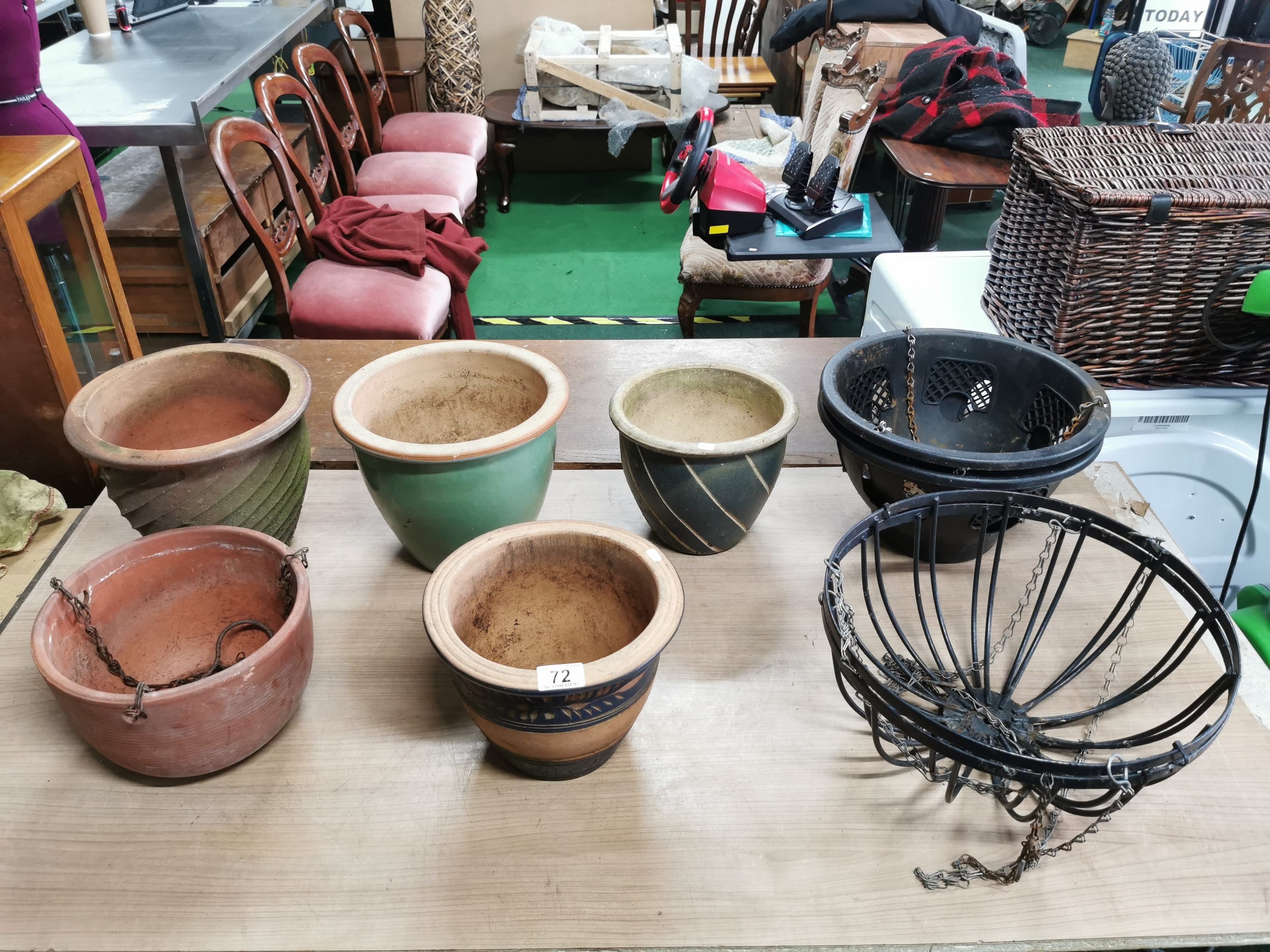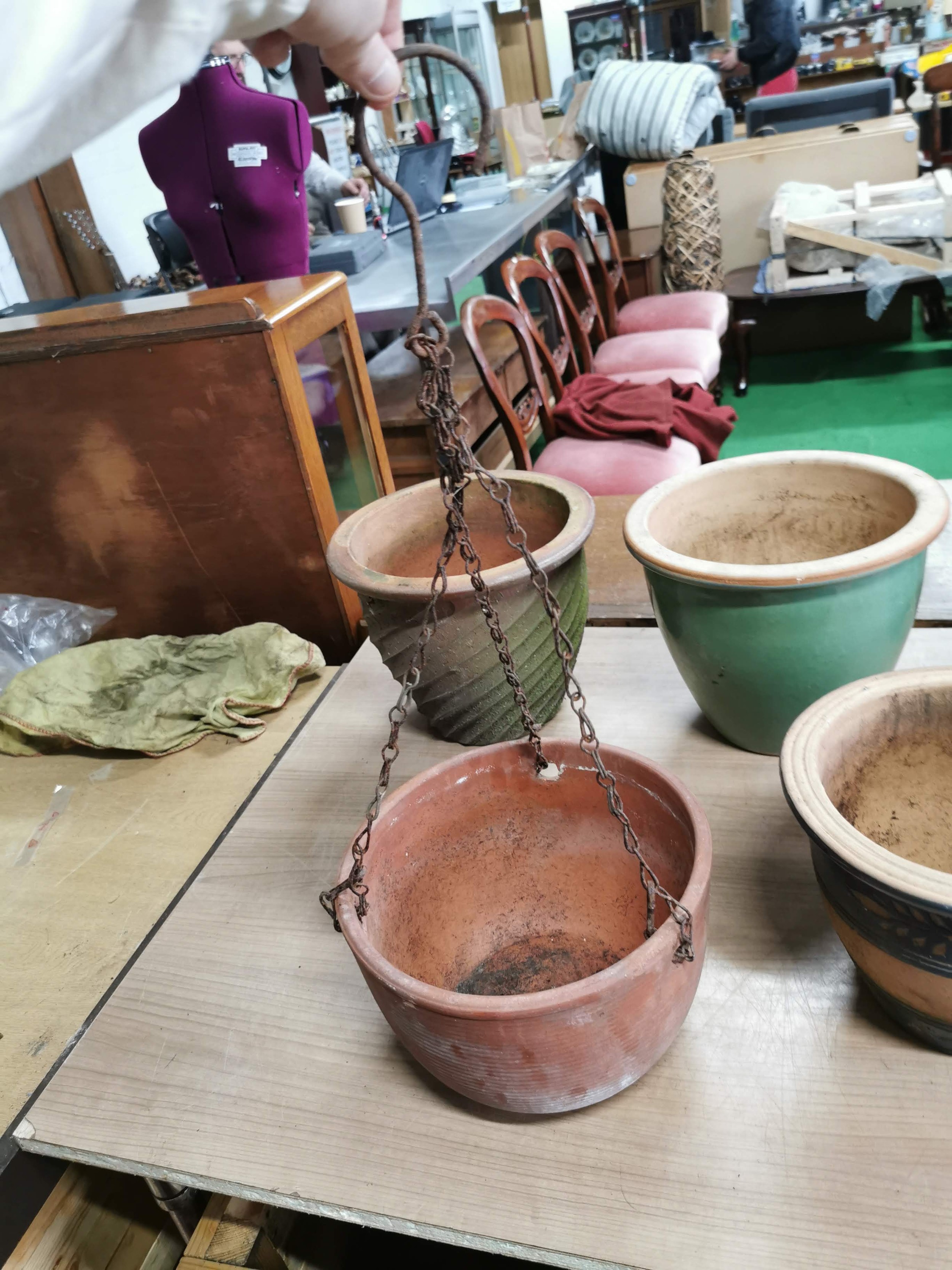 Collection of 5x terracota planters along with a collection of plastic wall hangers, all in good order largest pot measures 21cm high x 28cm diameter