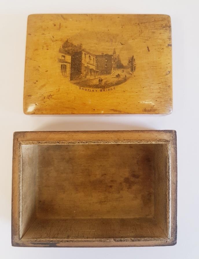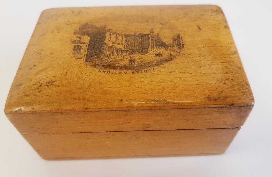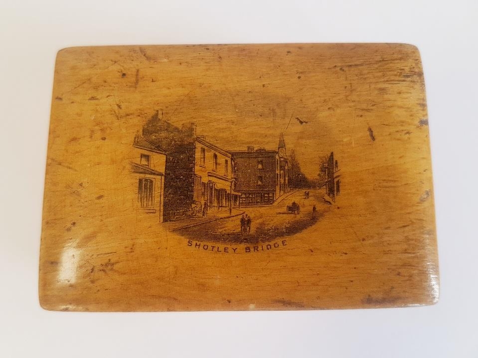 Mauchline Ware Box embossed with Shotley Bridge measuring 3 inches x 2 inches x 1.5 inches