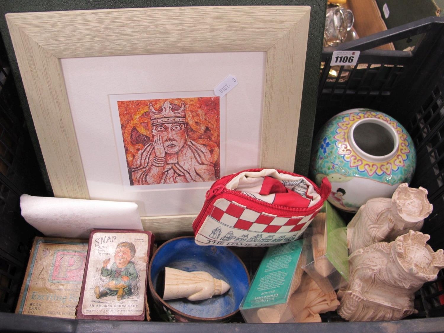 Oriental Ginger Jar, Mulberry hall Jorvik plate, Cloisonne bowl, Lewis Chessman snap, etc:- One Box.