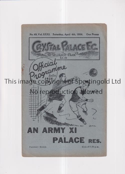 CRYSTAL PALACE Programme for the home Friendly v The Army 4/4/36. Generally good