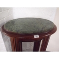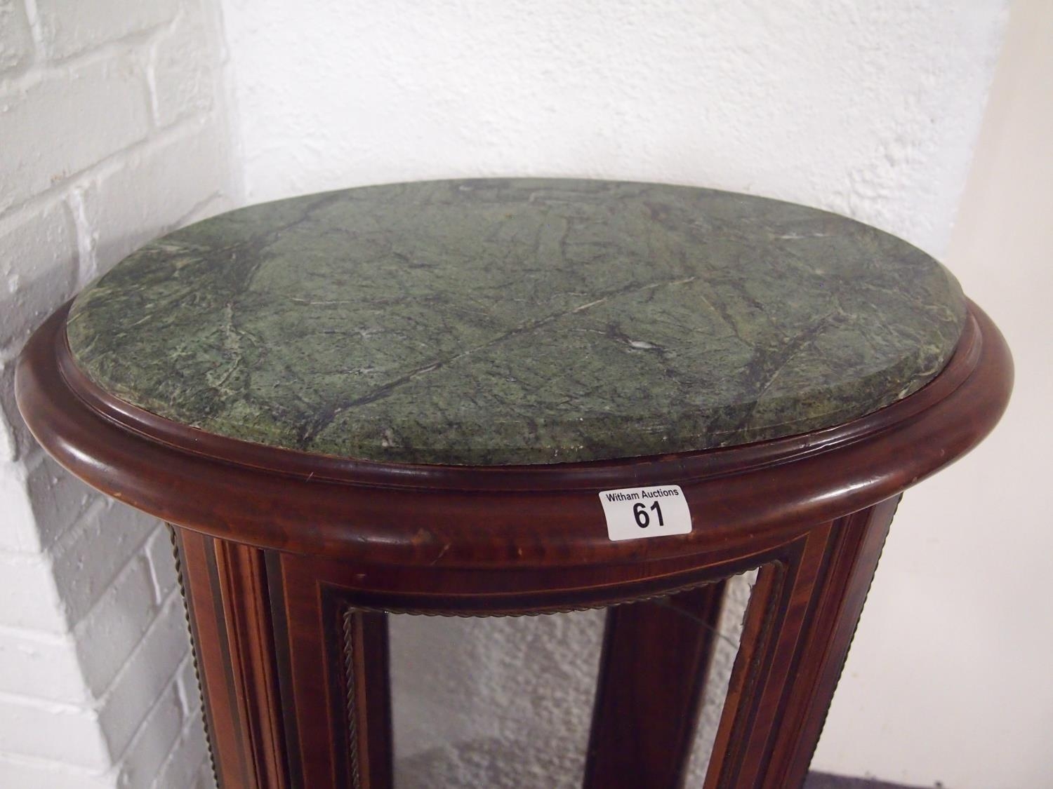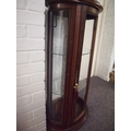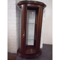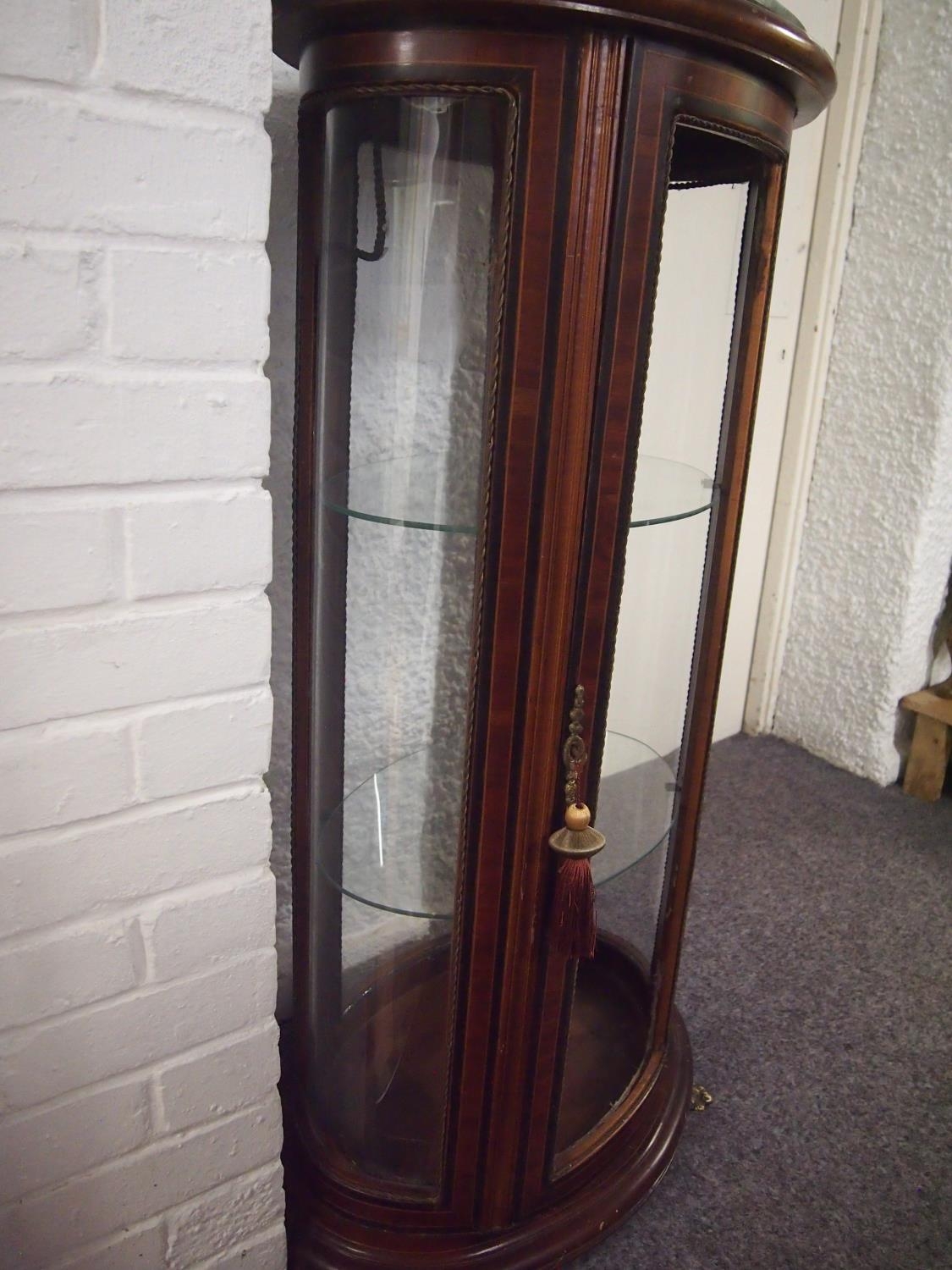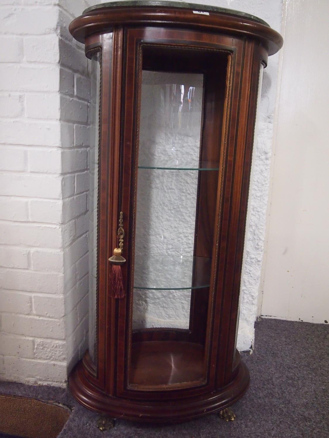 An antique style mahogany oval display cabinet on brass feet, possibly French. Decorative banding and ebonising to outer case, glazed panels, and marble to top (A/F to one panel) with key. Approx. height 115cm width 60cm