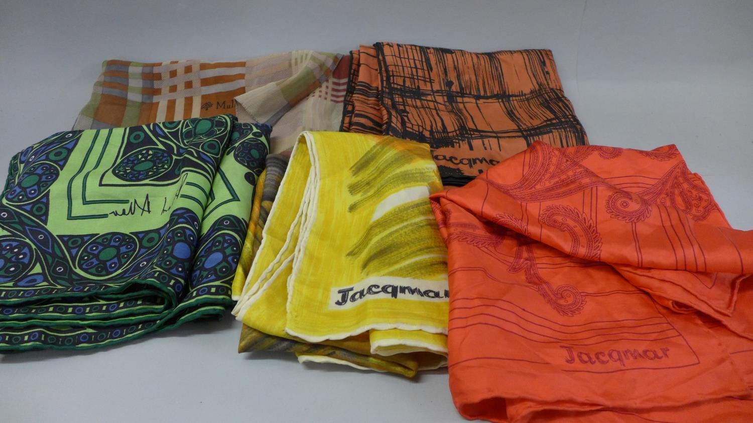 Five silk scarves, three Jacqmar, one Richard Alan and one Mulberry