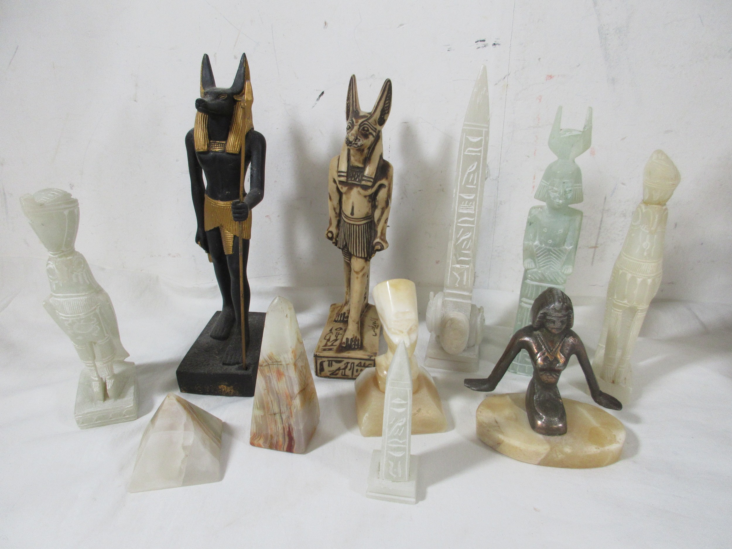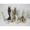 A box containing ornamental items in an Ancient Egyptian style including onyx figures and busts and others of resin
