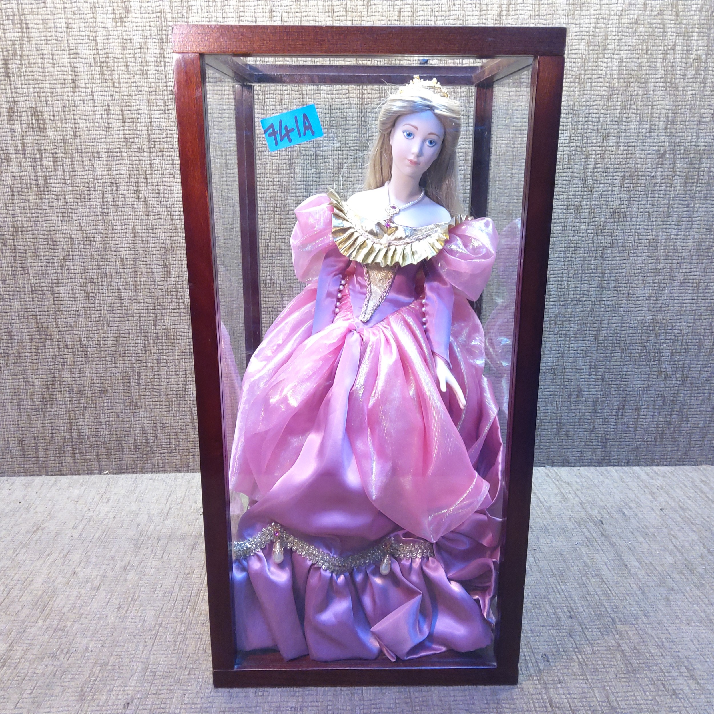Franklin mint Cinderella porcelain doll in wooden and glass display case.