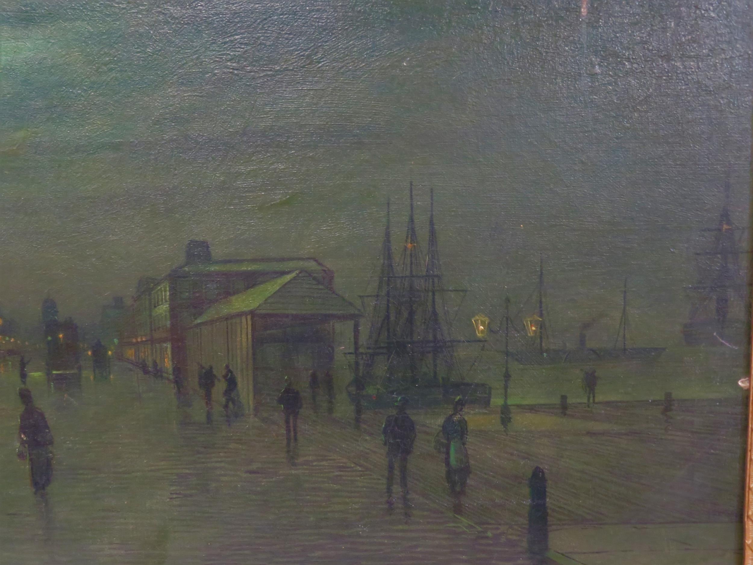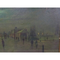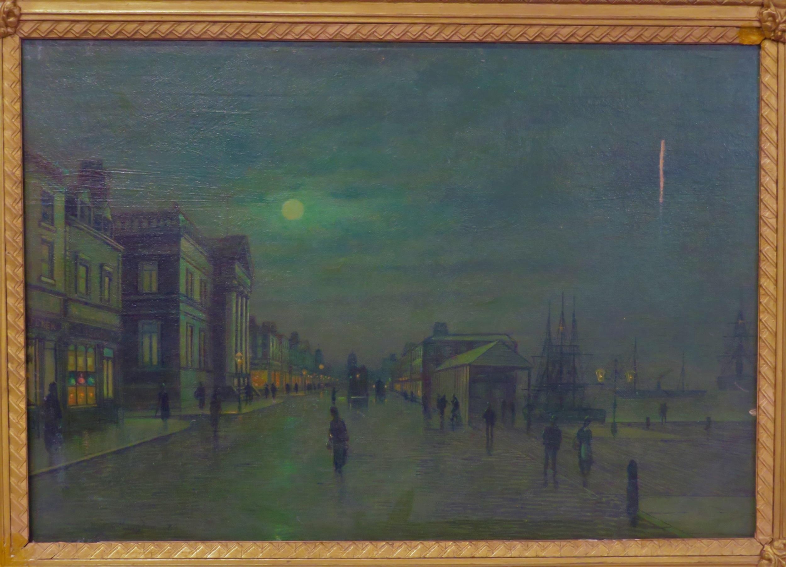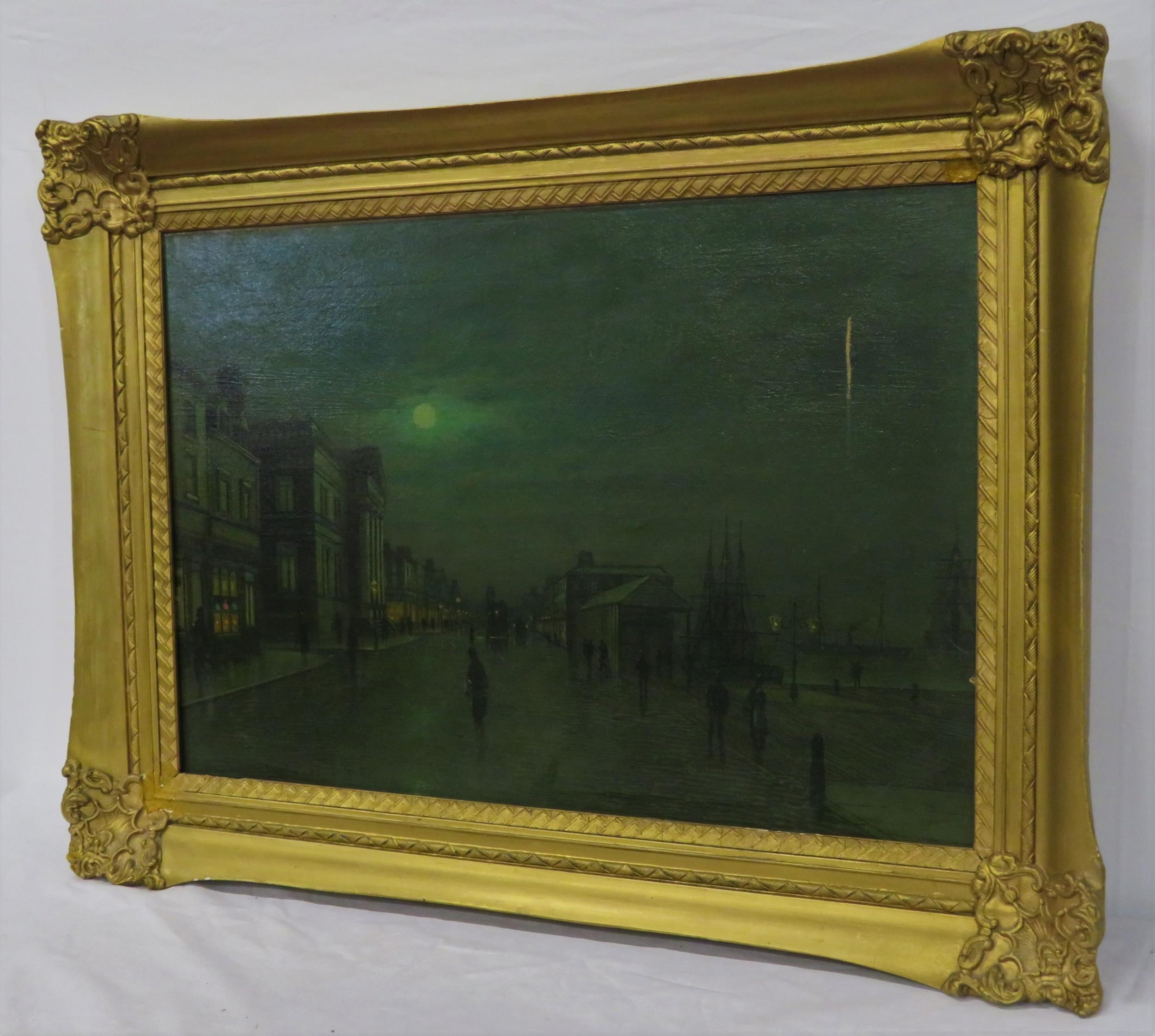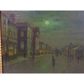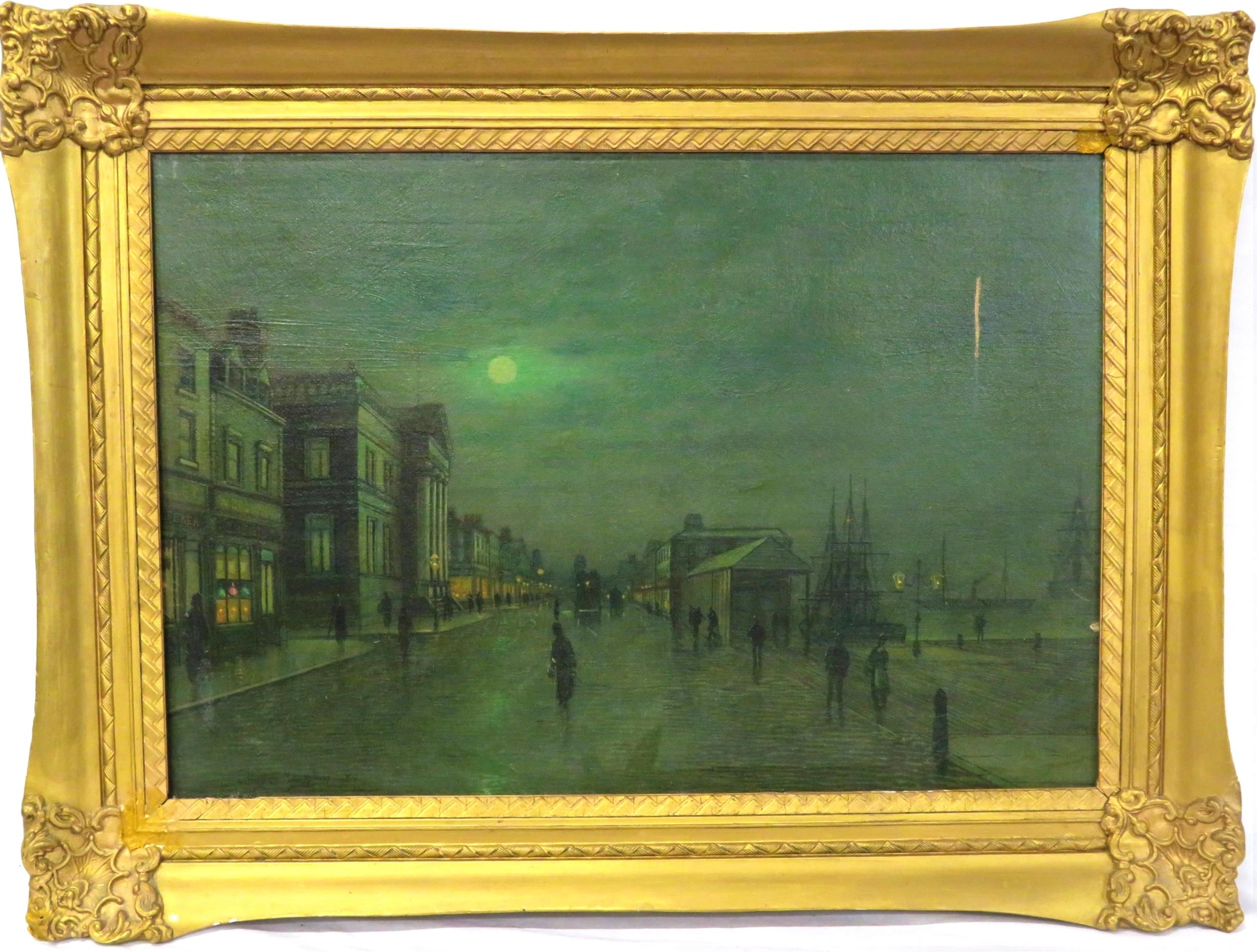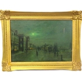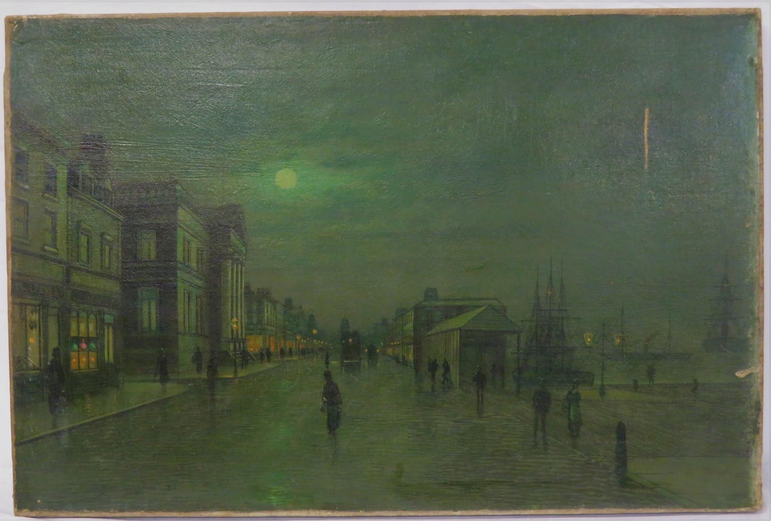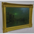 After John Atkinson Grimshaw (1836-1893) 'Moonlight Quayside streetscape with figures' oil on canvas 39x57cm,v signed 'Atkinson Grimshaw 89'