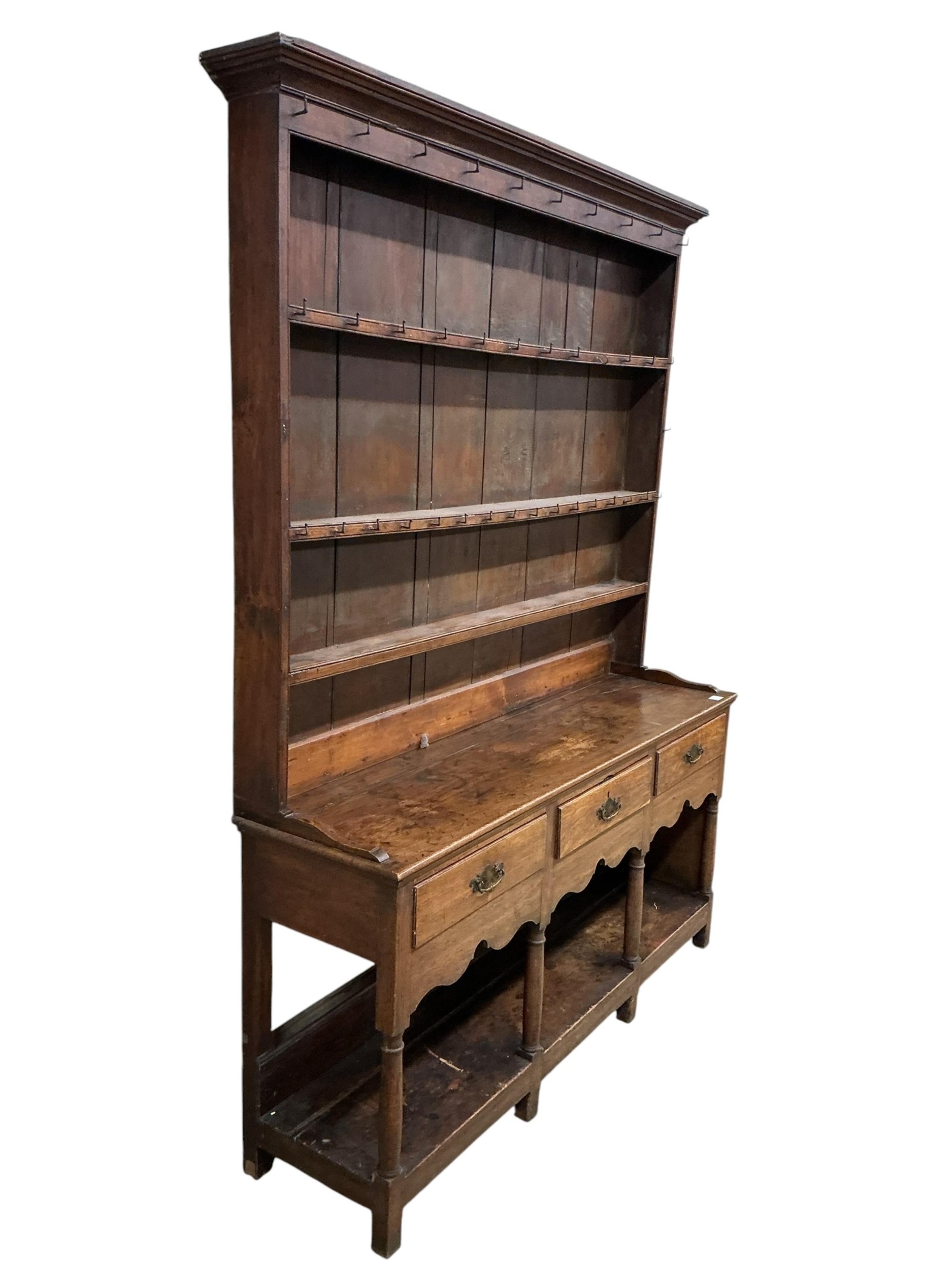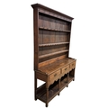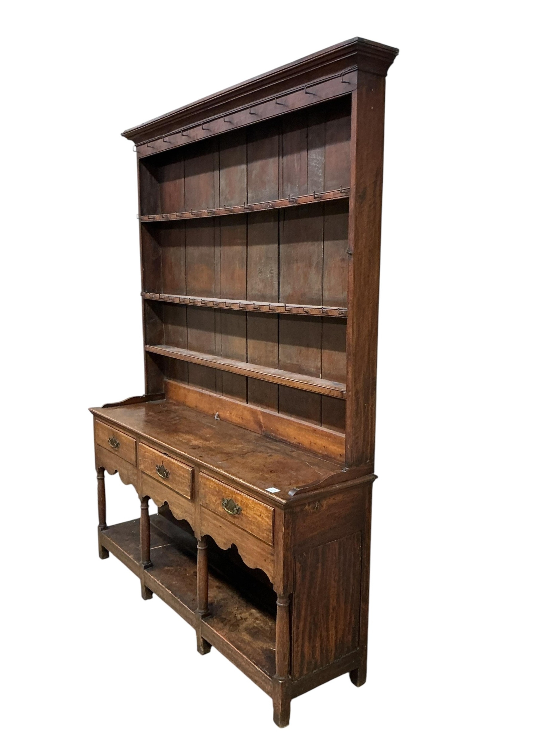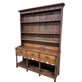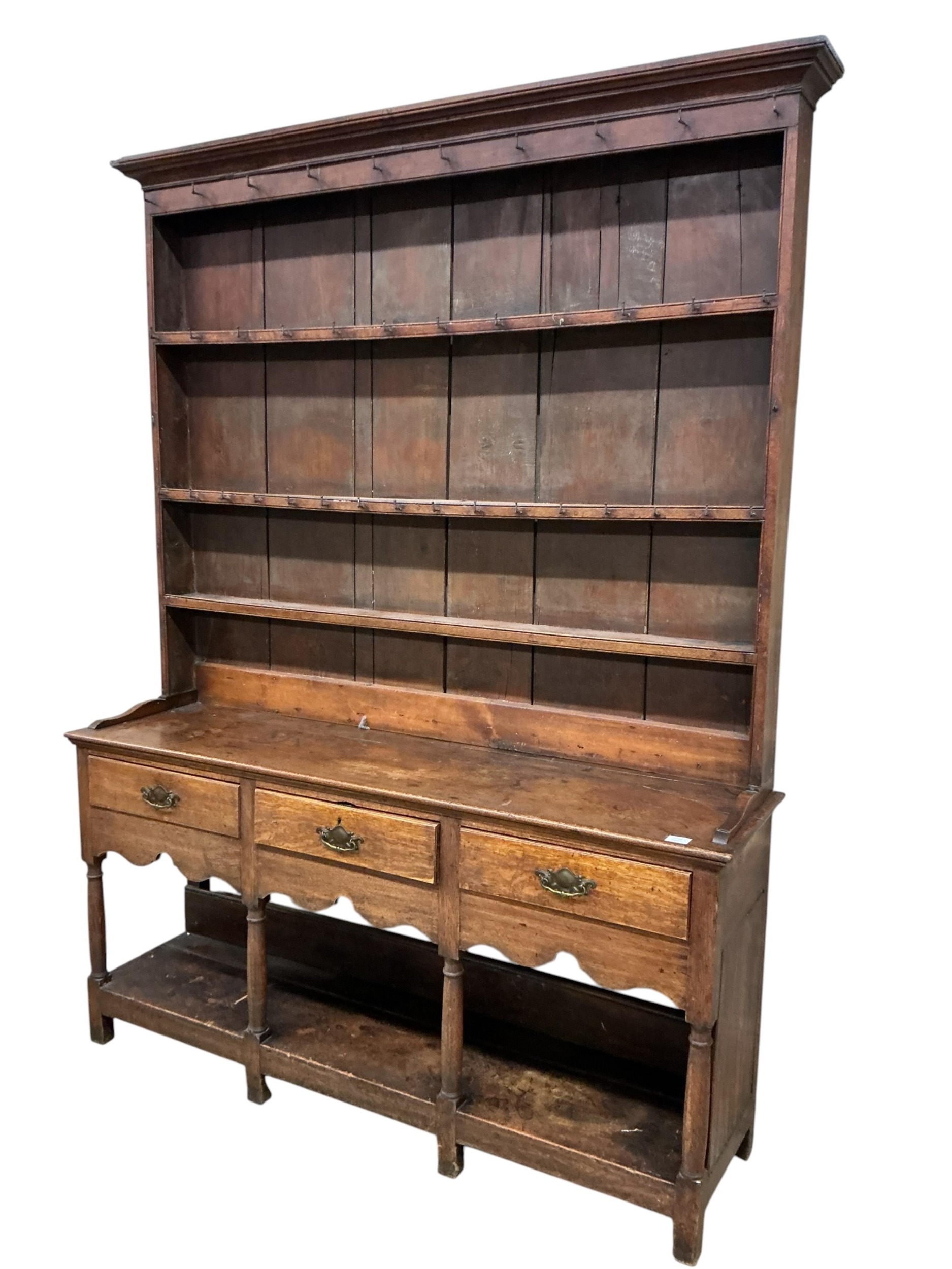 A George III oak potboard dresser with boarded rack, width 164cm, depth 43cm, height 220cm