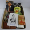 A Henry Cooper signed Brut 33 Aftershave promotional photograph, a pair of field glasses, a Parker 51 pen set, Princess Diana stamps, jewellery boxes, a tin of Rupert the Bear talc, etc.