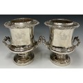 Matthew Boulton - a pair of George III Old Sheffield Plate campana wine coolers, detachable liners, gadrooned flower and leafy scroll borders, conforming carrying handles, pedestal bases, 25.5cm high, double sunburst marks, c.1810