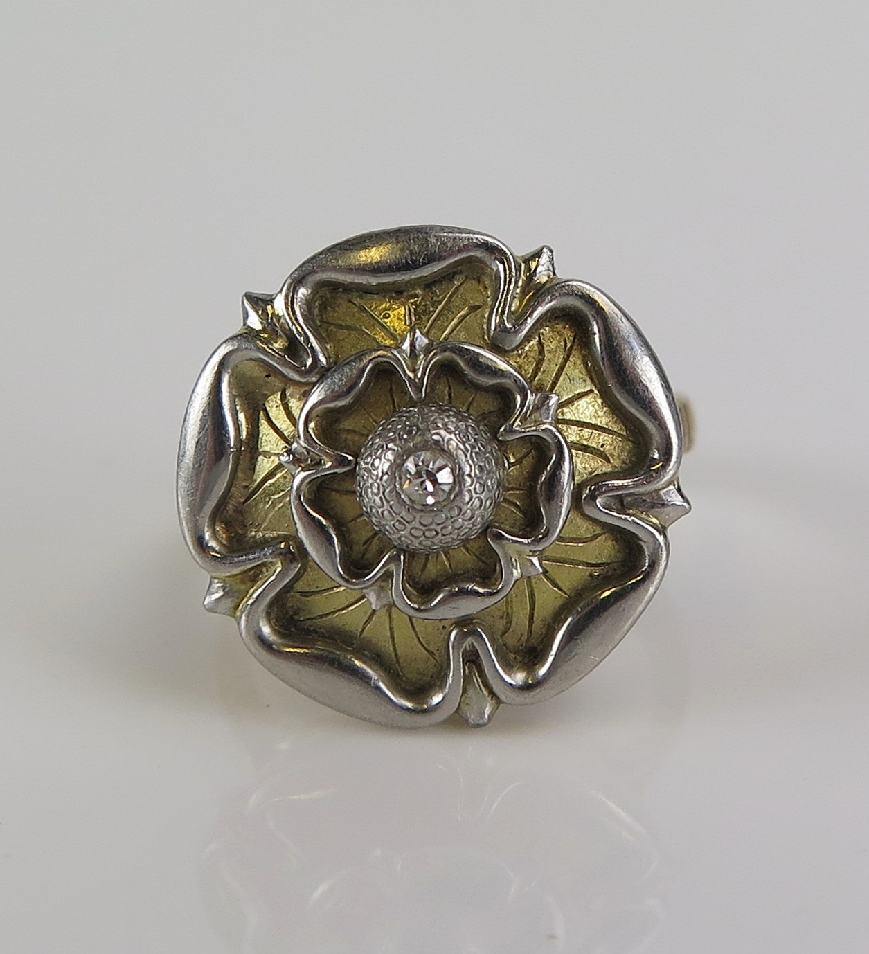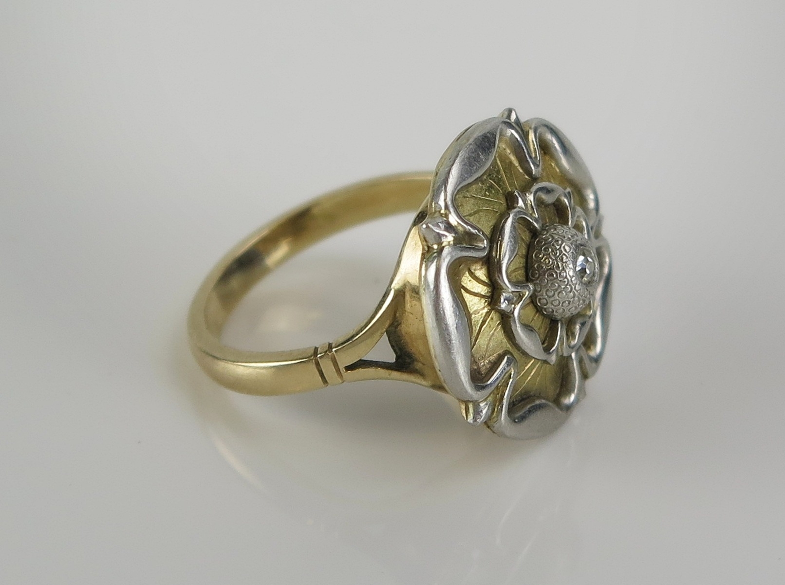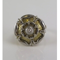 A Tudor rose ring set with an old cut diamond in a precious yellow and white metal setting, 19mm diam., size O, 8g