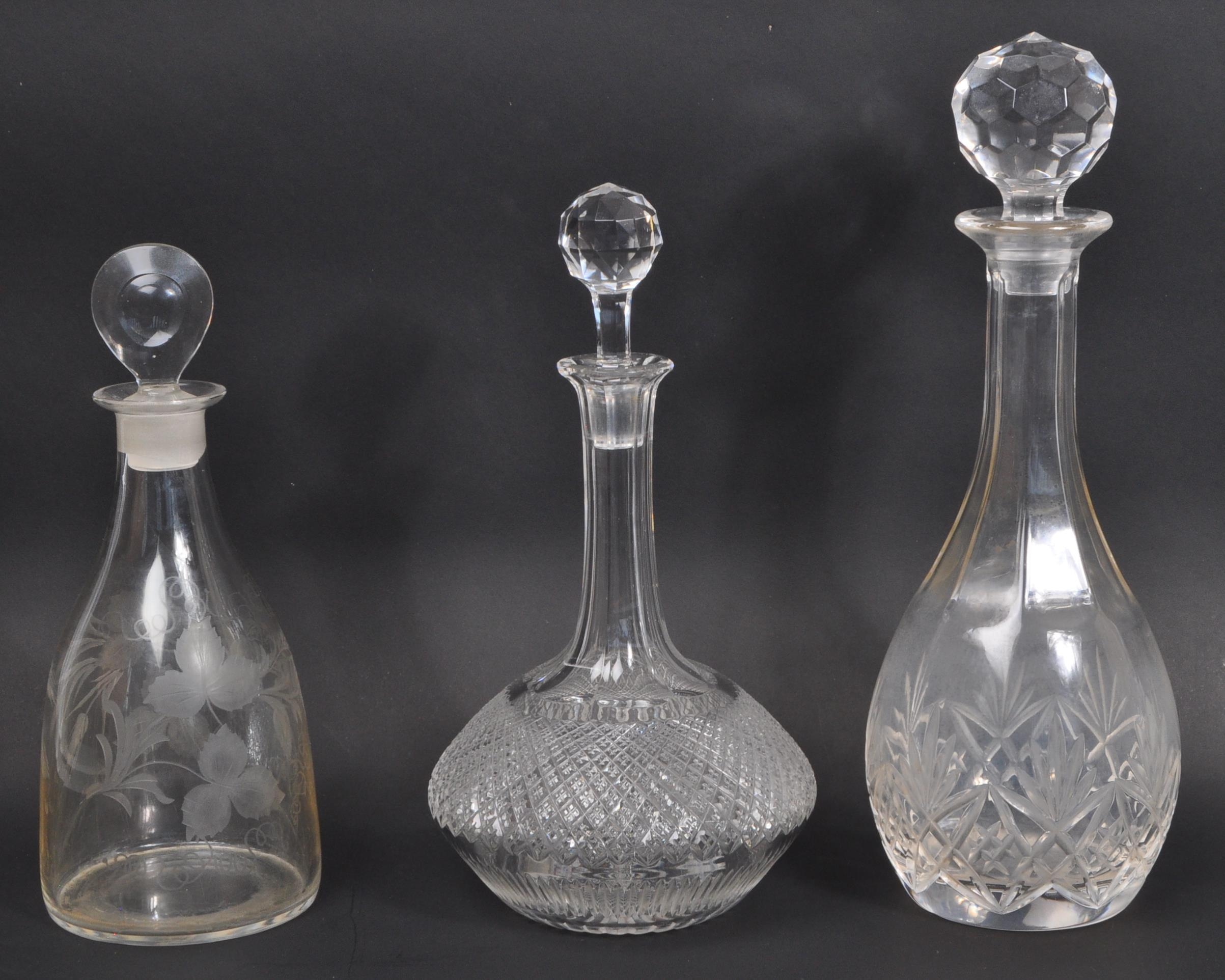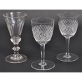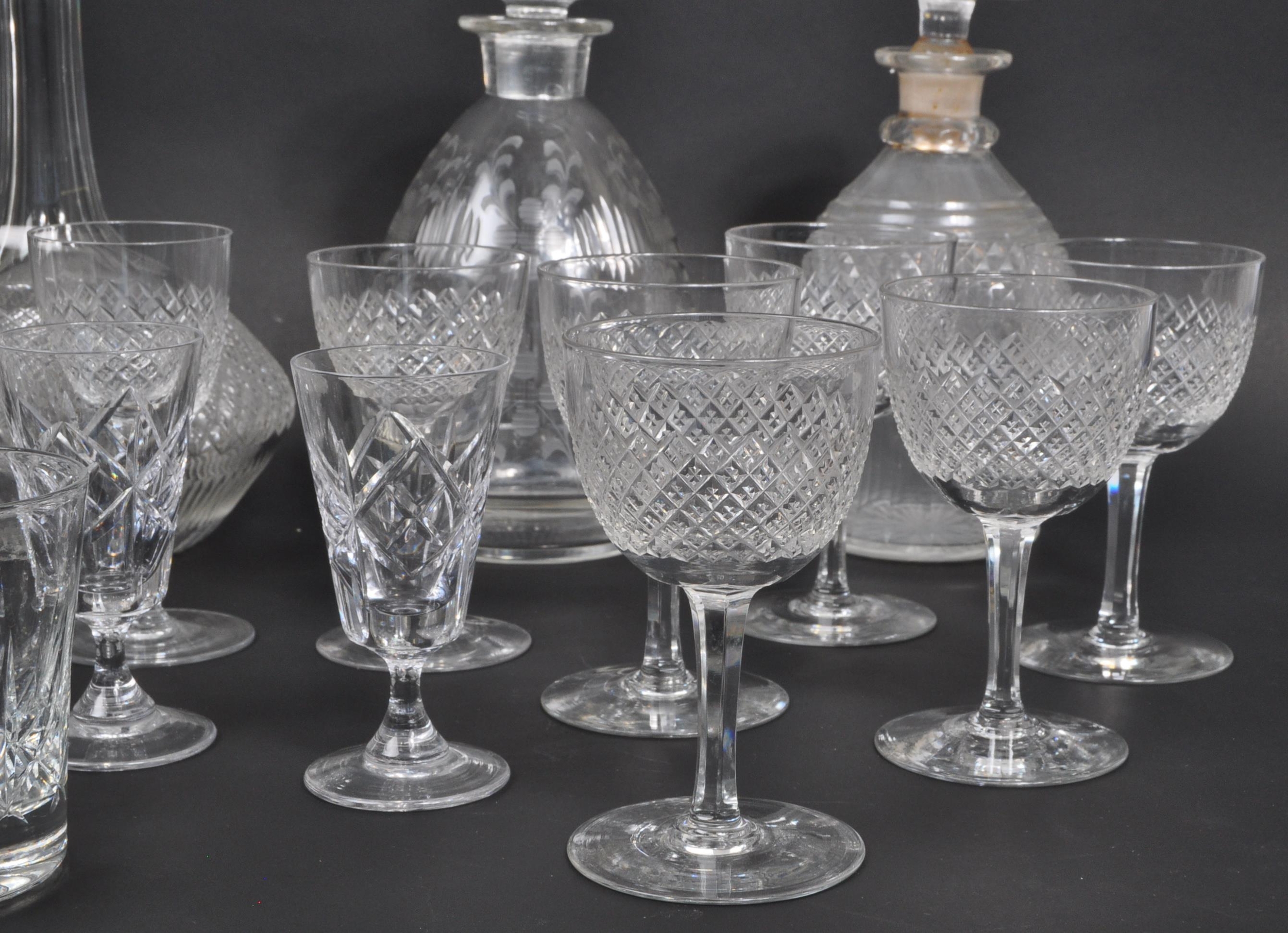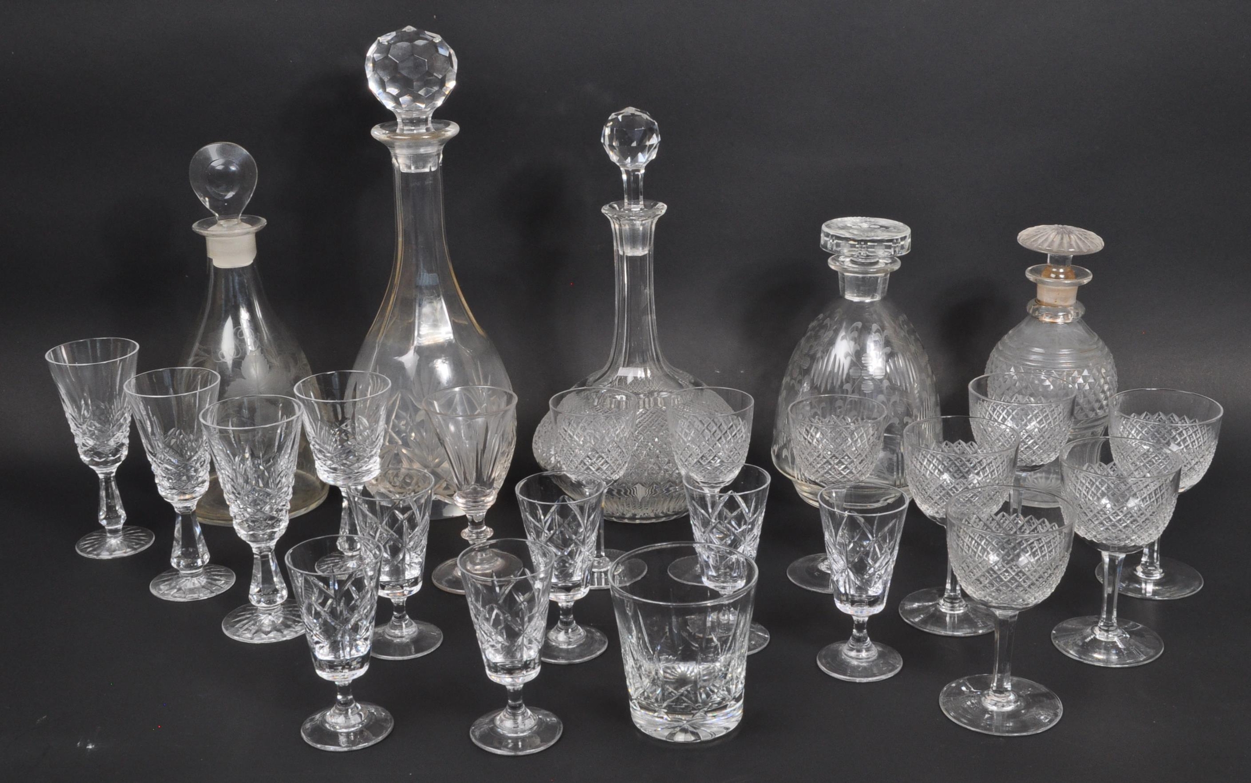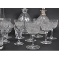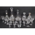 A collection of 19th century and later glass decanters and drinking glasses to include signed Tudor glass, etched glass, crystal glasses in the form of flutes and tumblers. Measures 24cm tall.