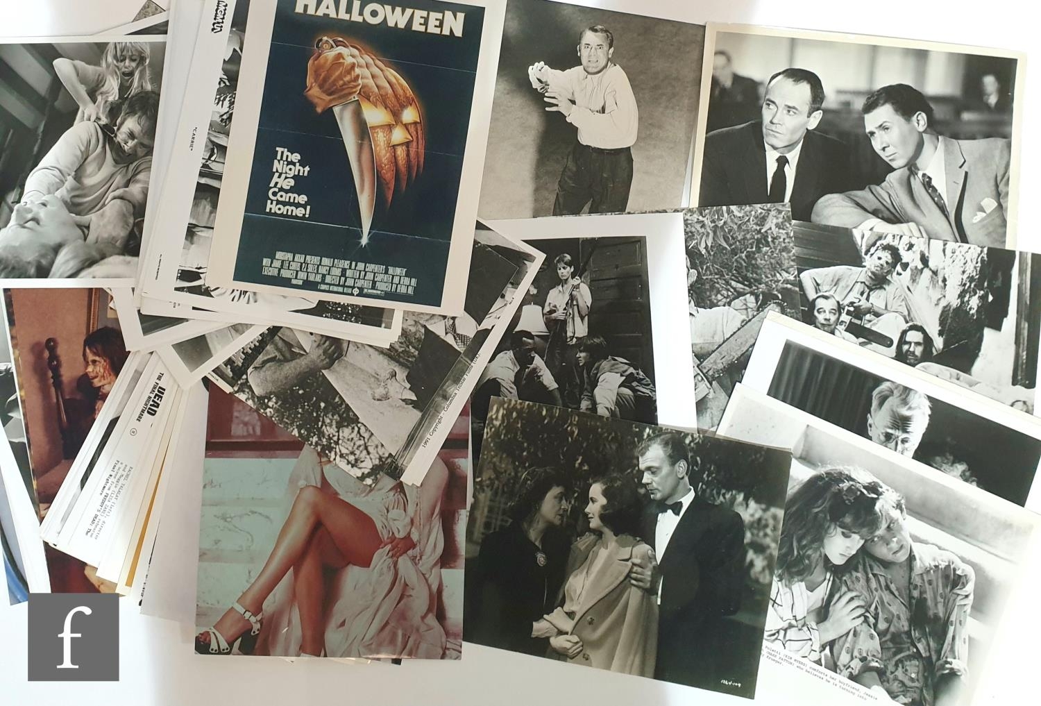 A collection of horror film and Alfred Hitchcock stills and lobby cards to include A Nightmare on Elm Street, Halloween, Carrie, Rope, Texas Chainsaw Massacre etc. (approximately 80)