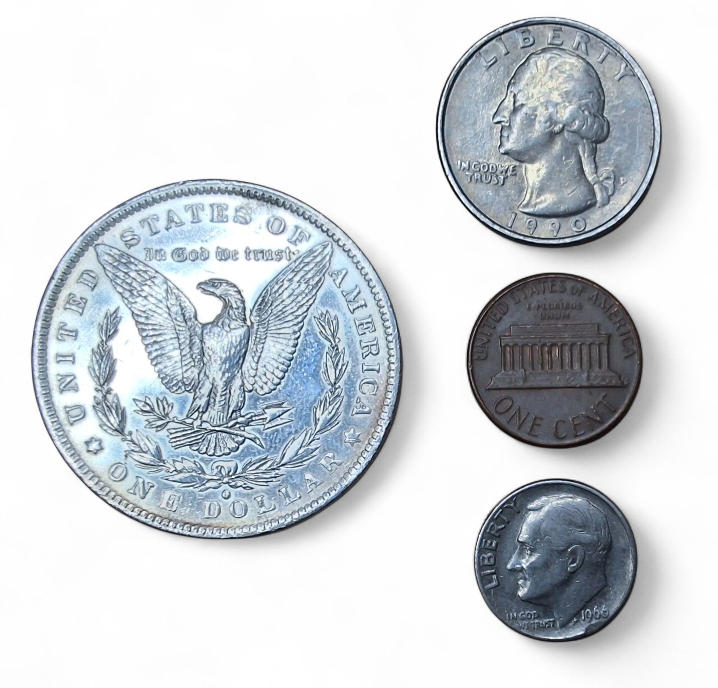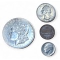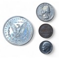 United States of America AR Dollar, dated 1884, New Orleans mint, Morgan type, design by George Thomas Morgan, E • PLURIBUS • UNUM, thirteen stars divided by date below Morgan style Liberty Head / ✶ UNITED STATES OF AMERICA ✶ ONE DOLLAR around, IN GOD WE TRUST above eagle clutching laurel and arrows, laurel sprays around; mintmark below, 26.74gr, 38mm; etc.
