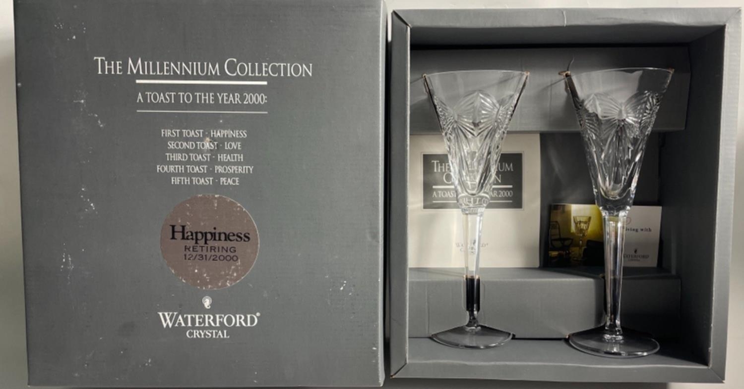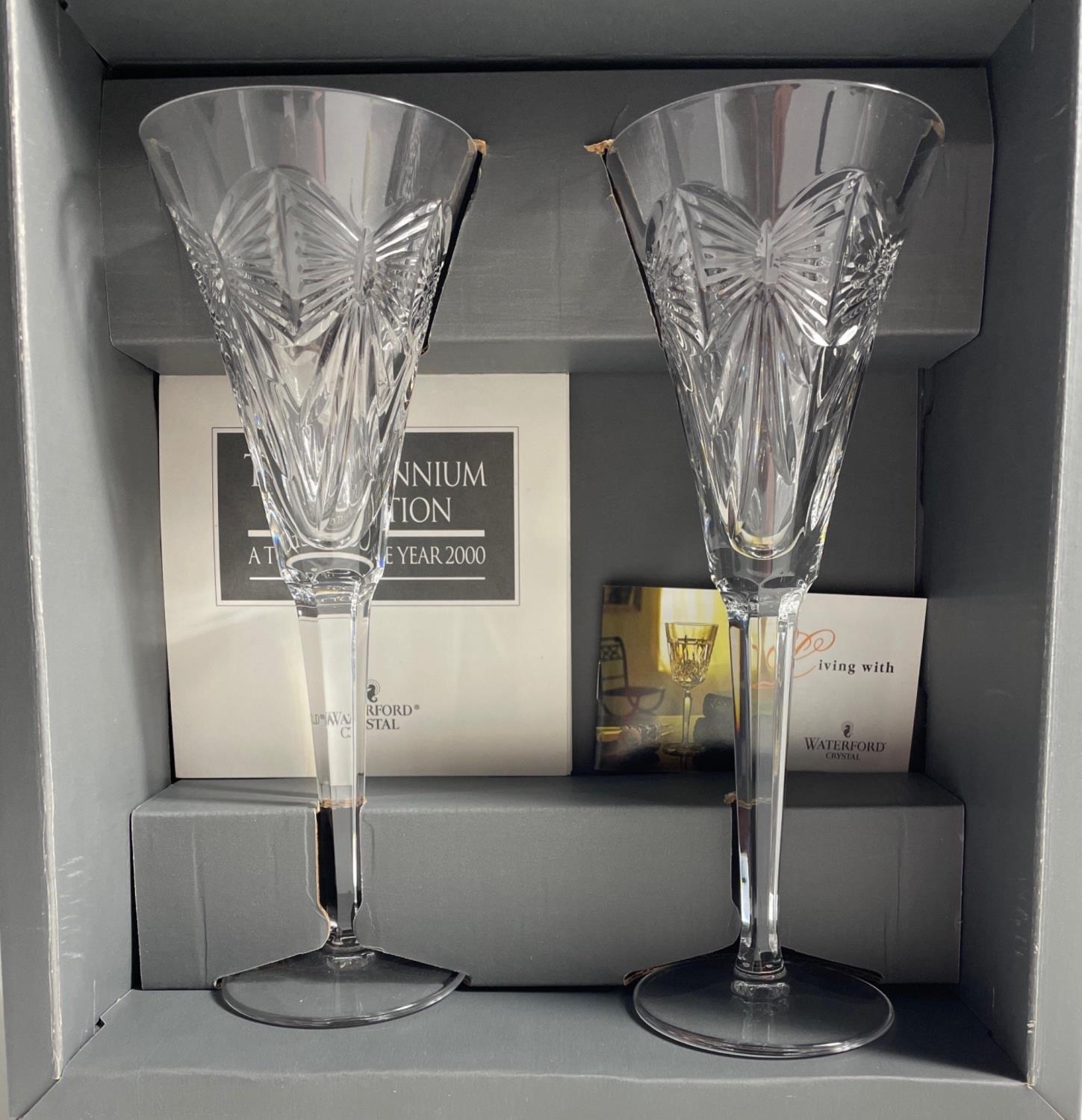 WATERFORD CRYSTAL THE MILLENNIUM COLLECTION TWO LARGE CHAMPAGNE FLUTES in original gifting box. Engraved with just bows on both glasses. Label to side says 'Happiness'