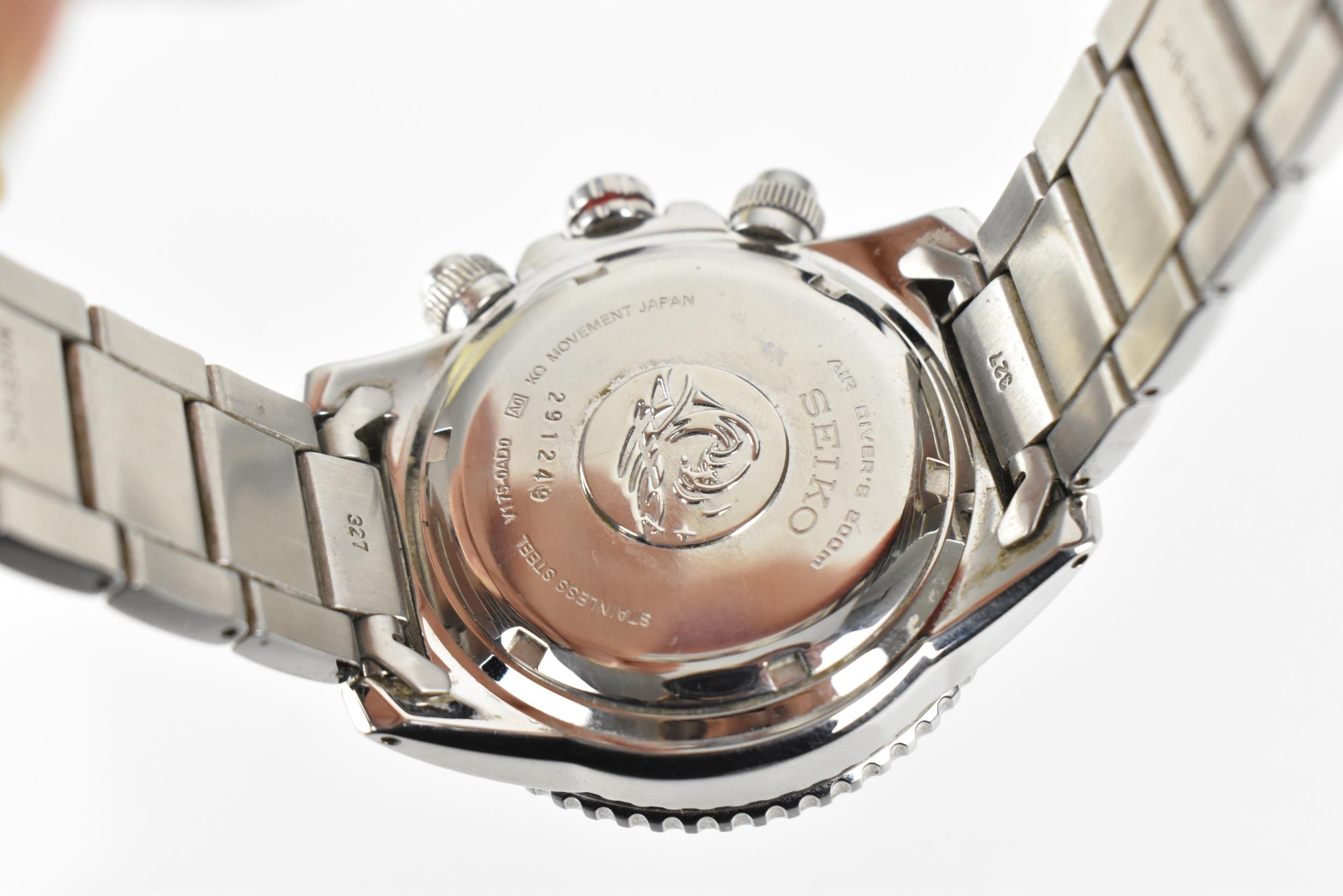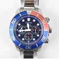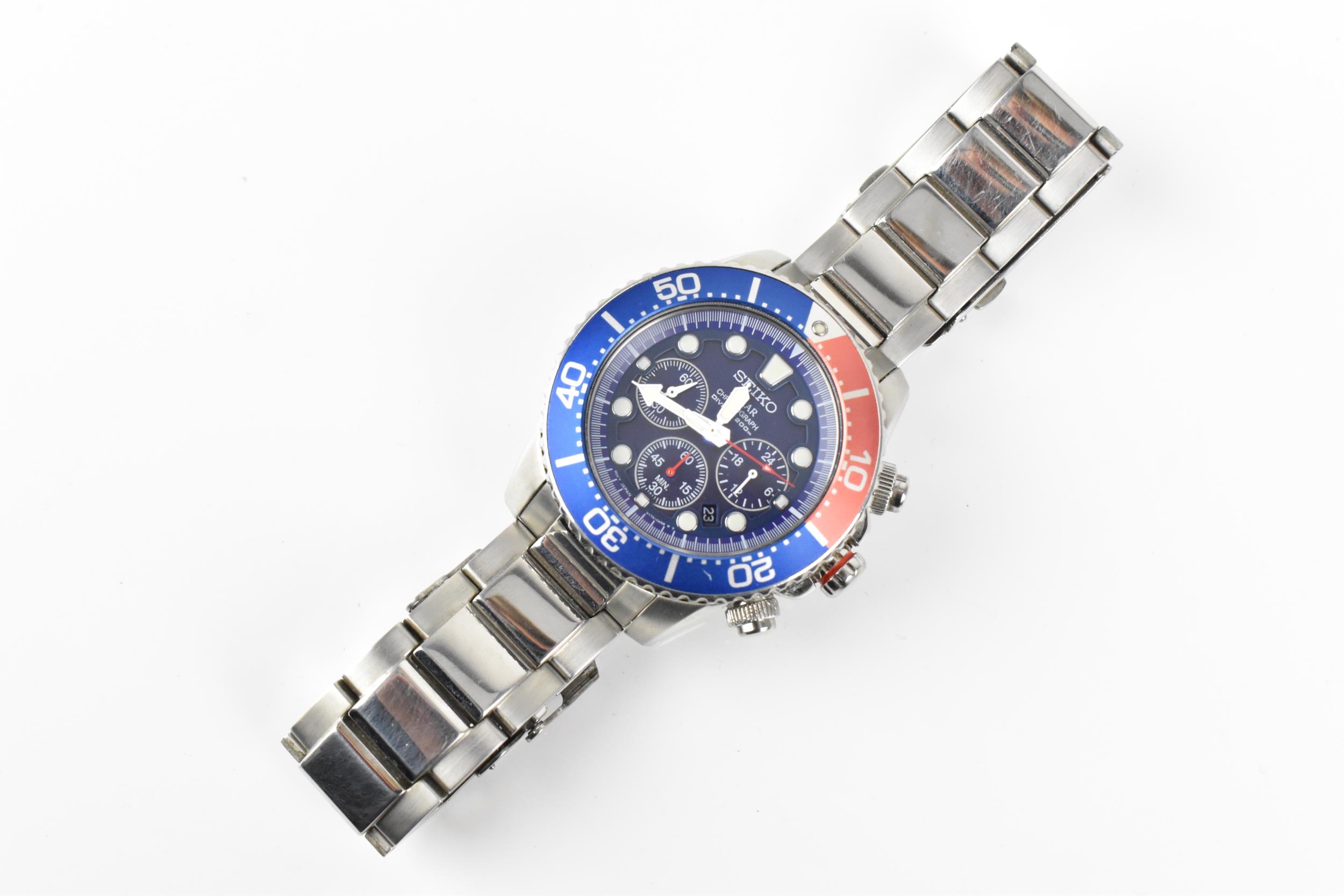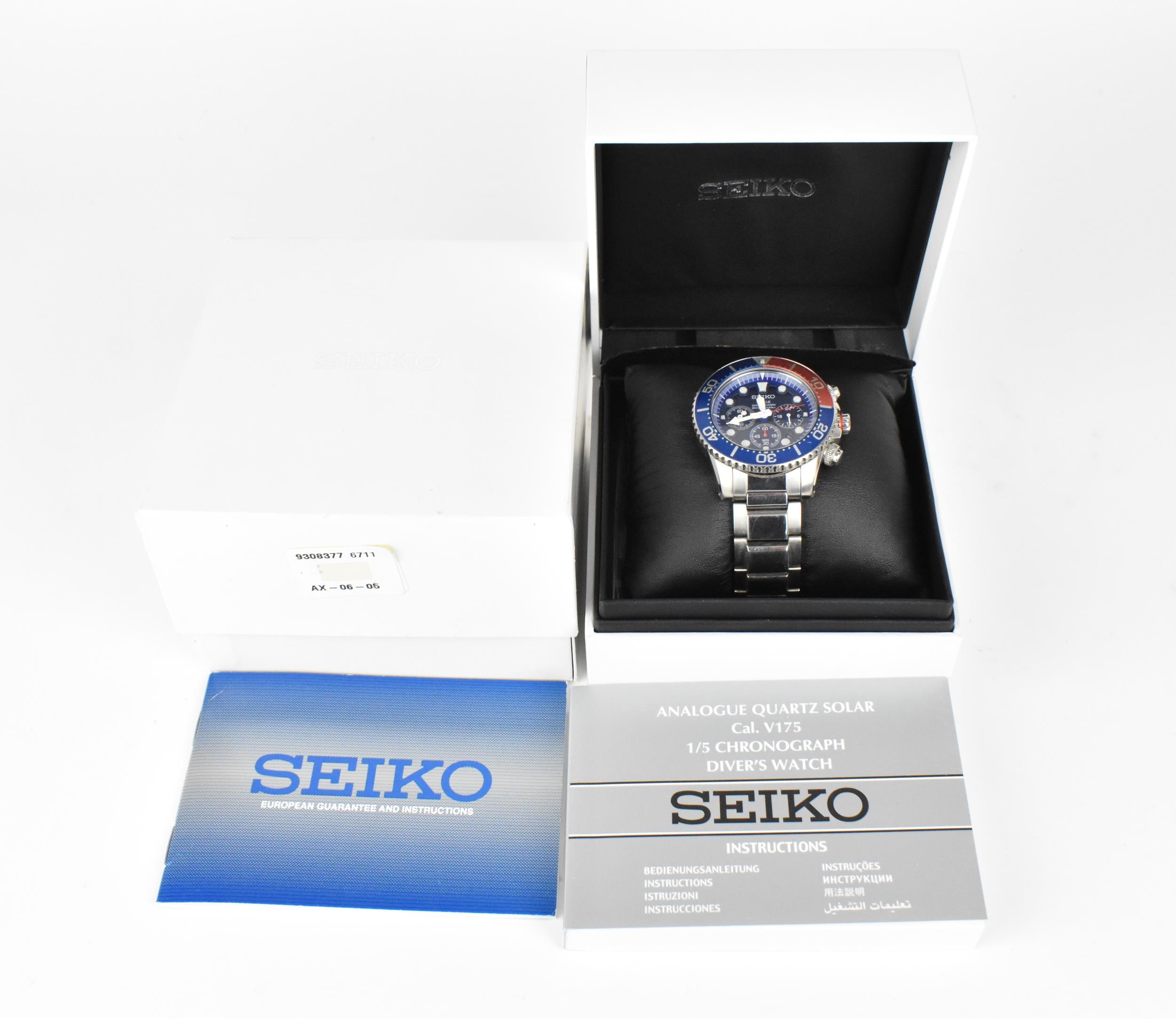 A Seiko Solar chronograph, gents, stainless steel Air Diver's 200m wristwatch, circa 2016, serial number 291 243, having 'Pepsi' bezel, blue dial with luminous markers, subsidiary dials, case back numbered 291249, on stainless steel bracelet, with original box and paperwork, 45mm