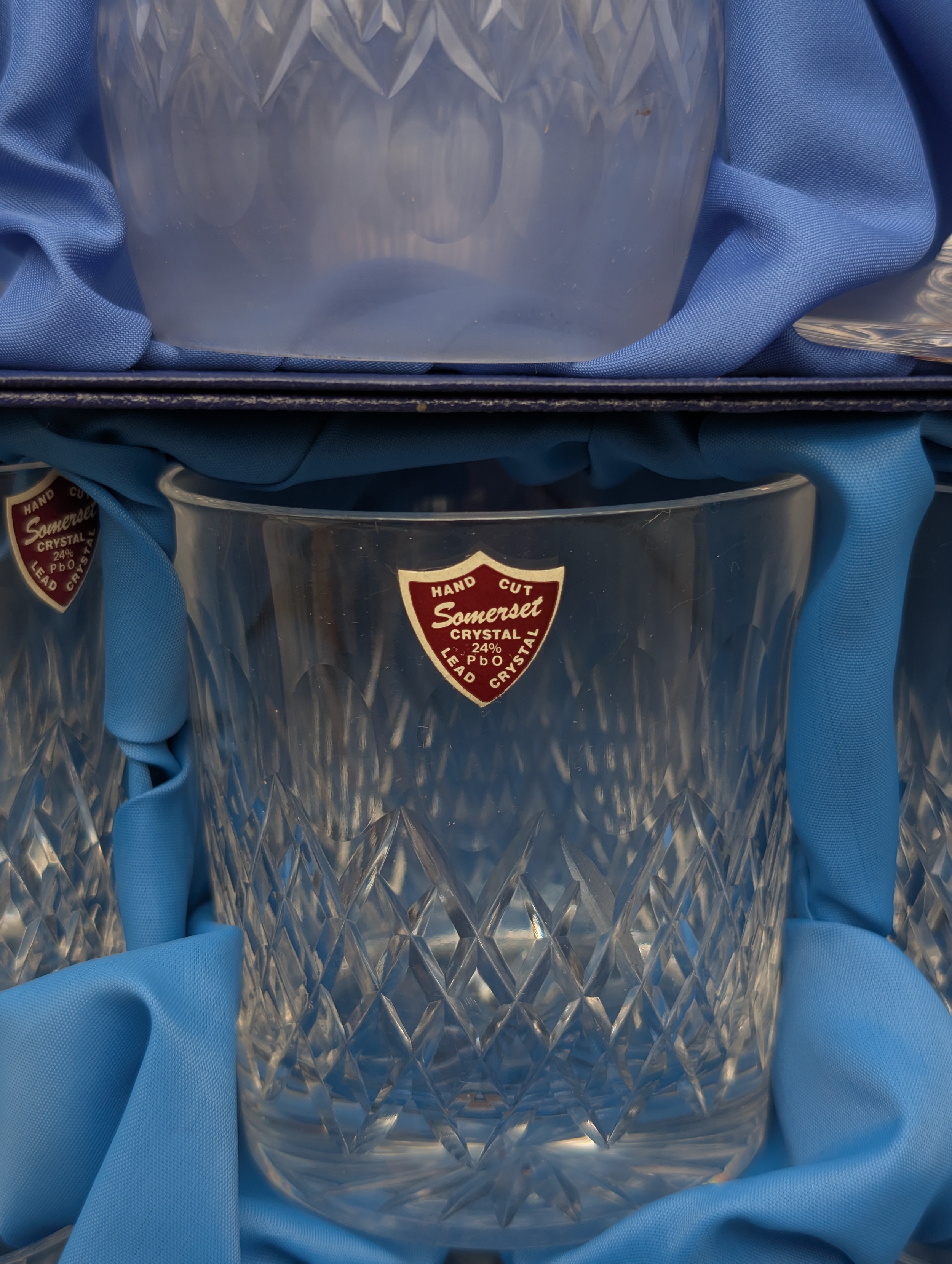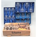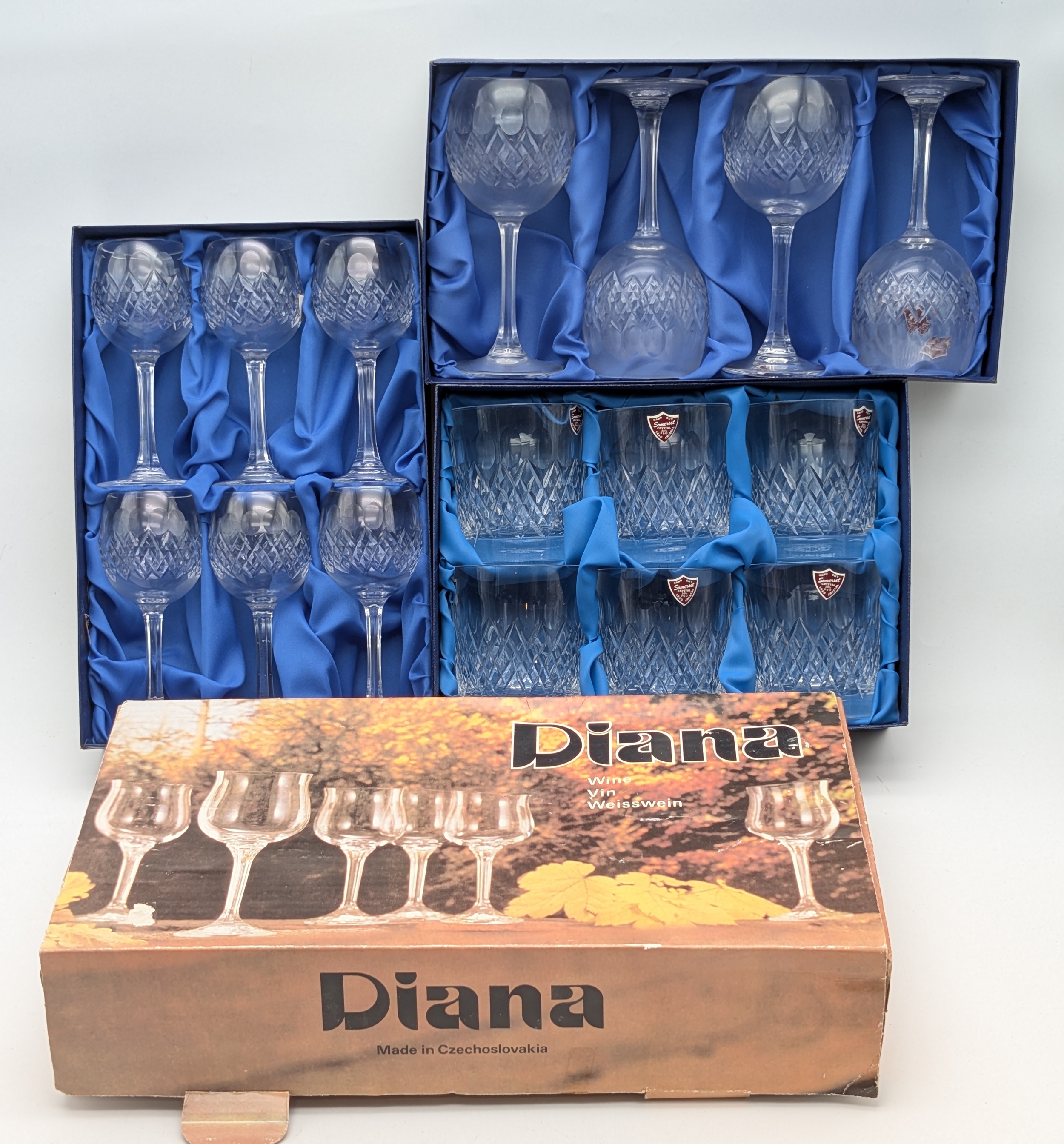 Three boxed Bohemian lead crystal glassware sets, comprising one “Diana” and two “Somerset” suites, Czechoslovakia Including a “Diana” pattern wine glass set and two matching Somerset Crystal sets of cut lead crystal tumblers and stemware, all 24% PbO, with original fitted presentation boxes and labels. [Contents appear unused; minor wear to boxes]