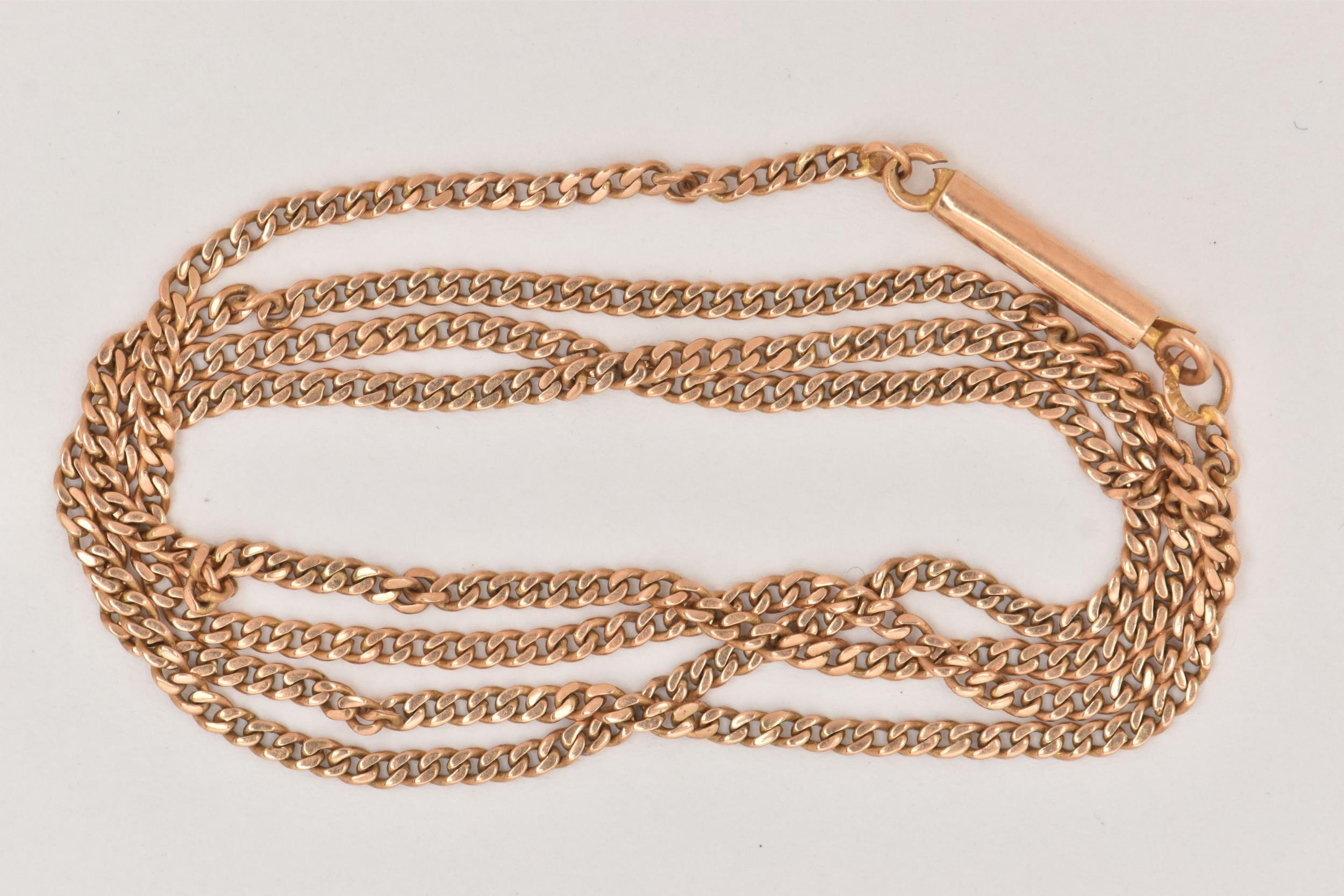 A YELLOW METAL CHAIN NECKLACE, a fine curb link chain, fitted with a cylinder clasp, approximate length 435mm, stamped 15ct, approximate gross weight 3.2 grams, (condition report: general moderate wear, overall condition good)