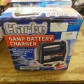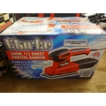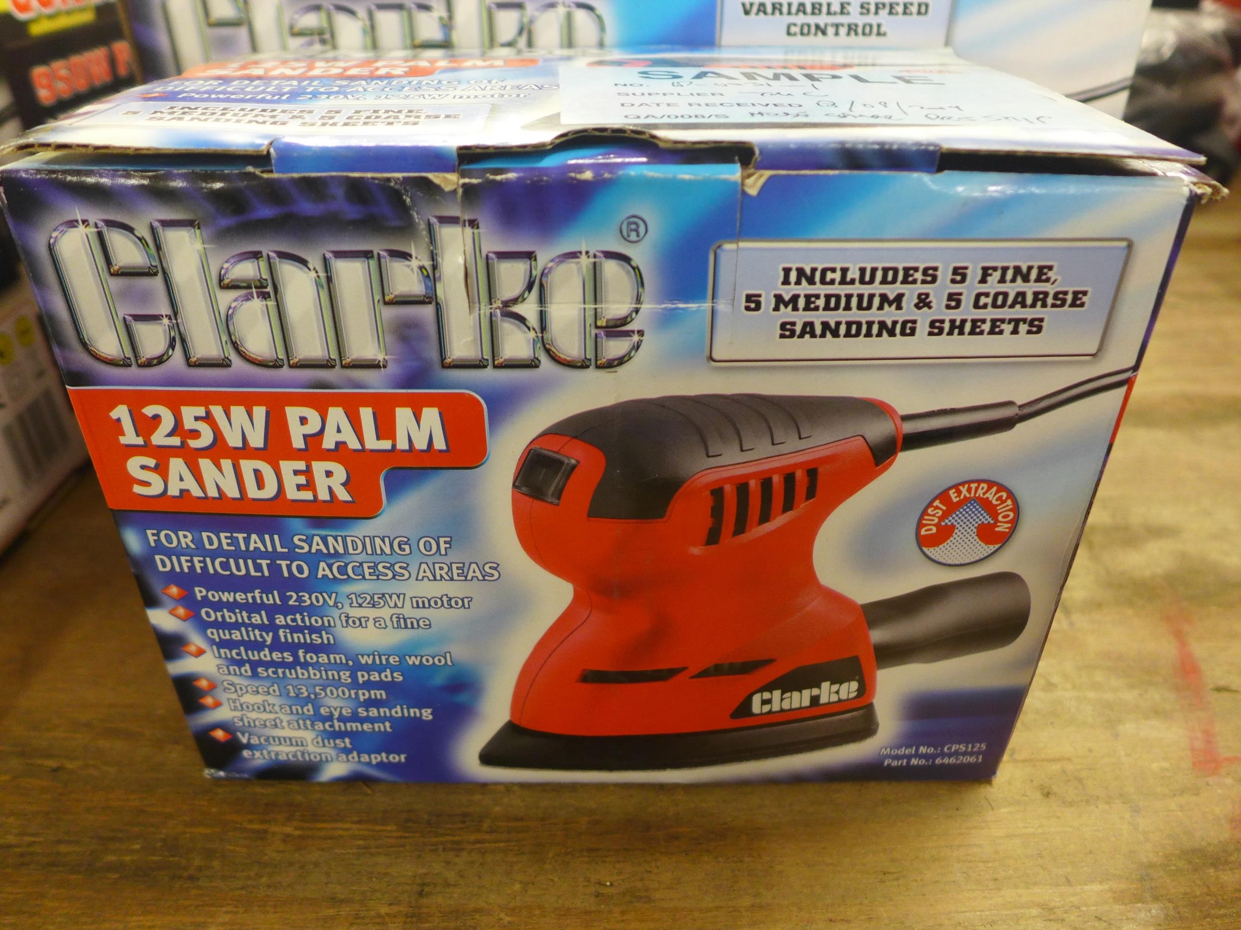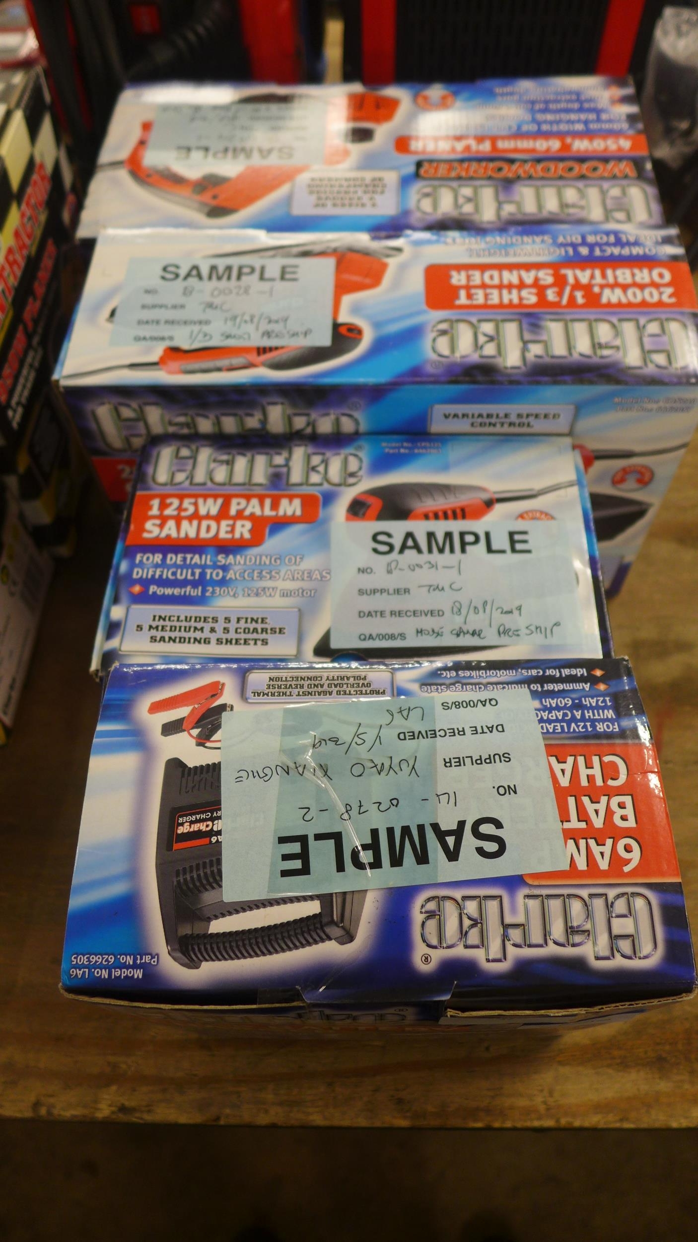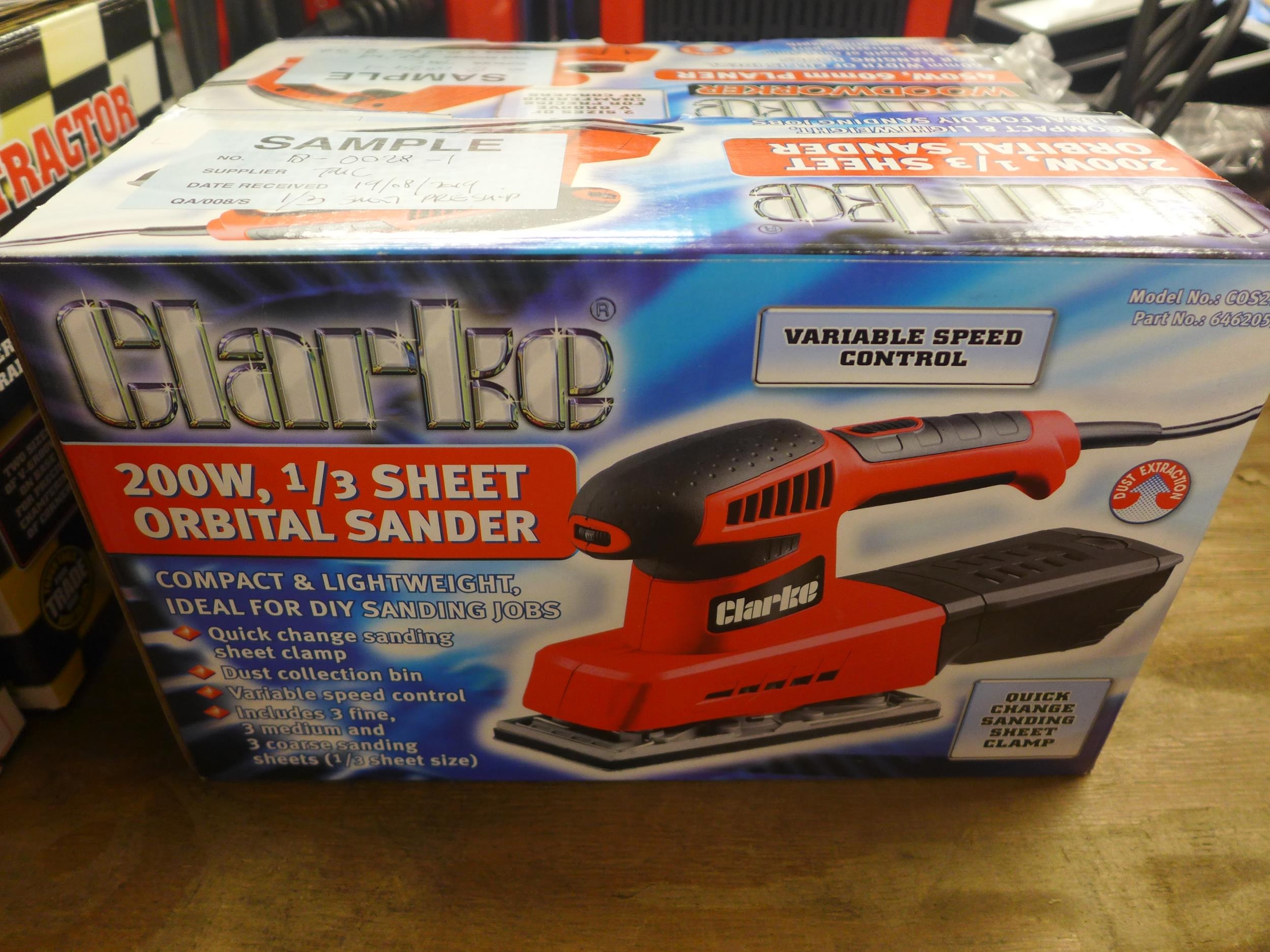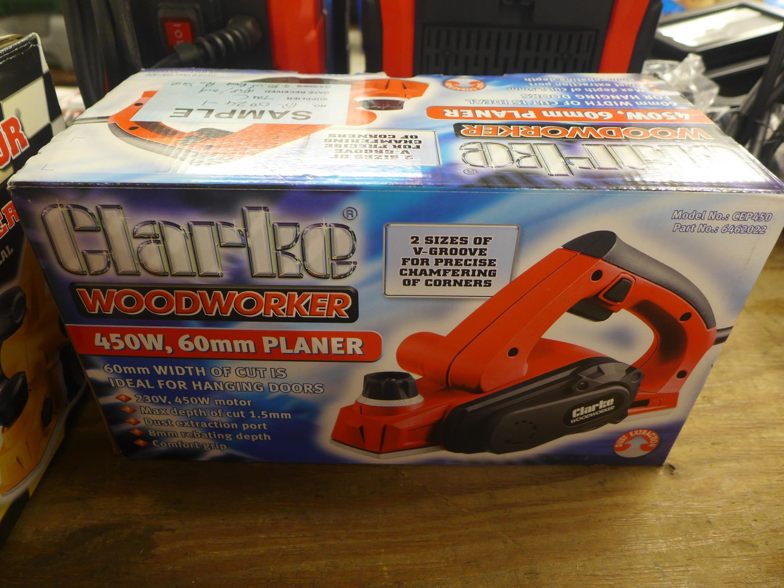 Four boxed Clarke items including a 6 amp battery charger, a 125w palm sander, a 200w 1/3 sheet orbital sander and a 450w 60mm planer *This lot is subject to VAT