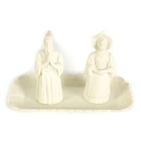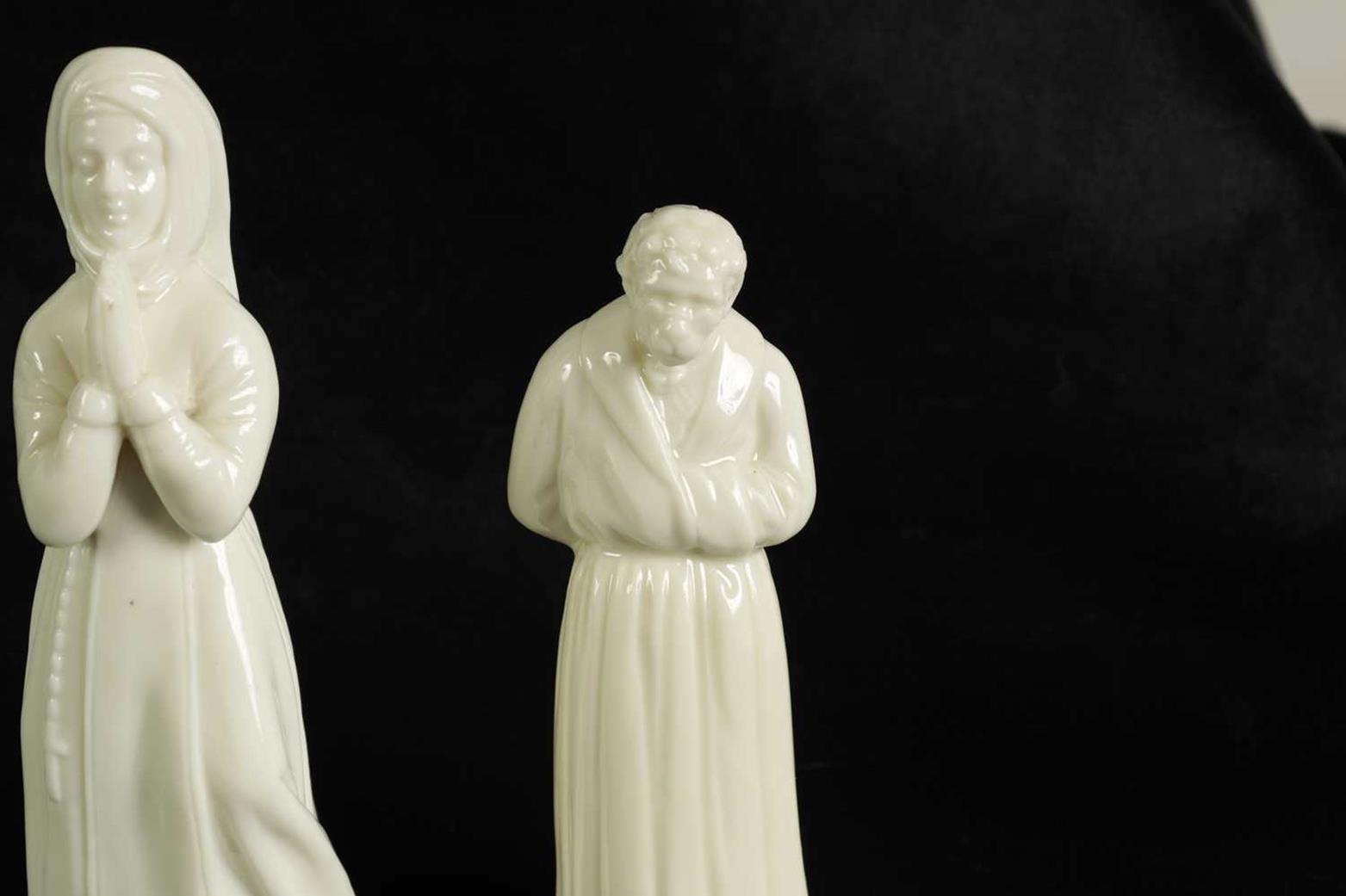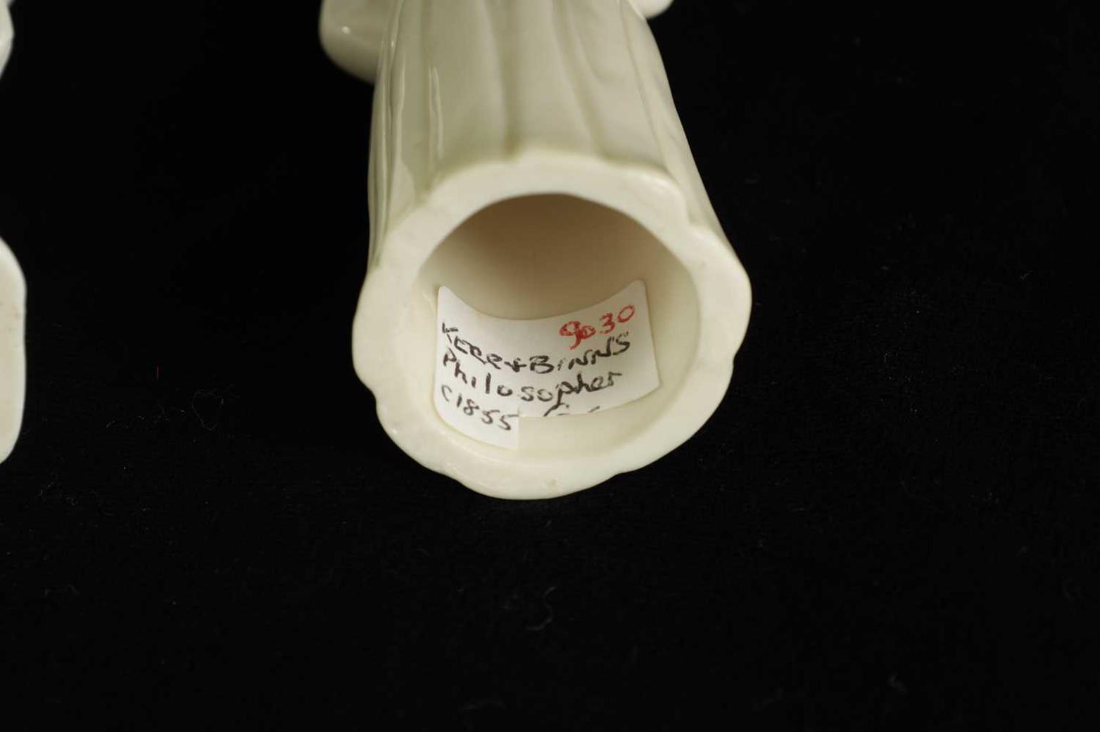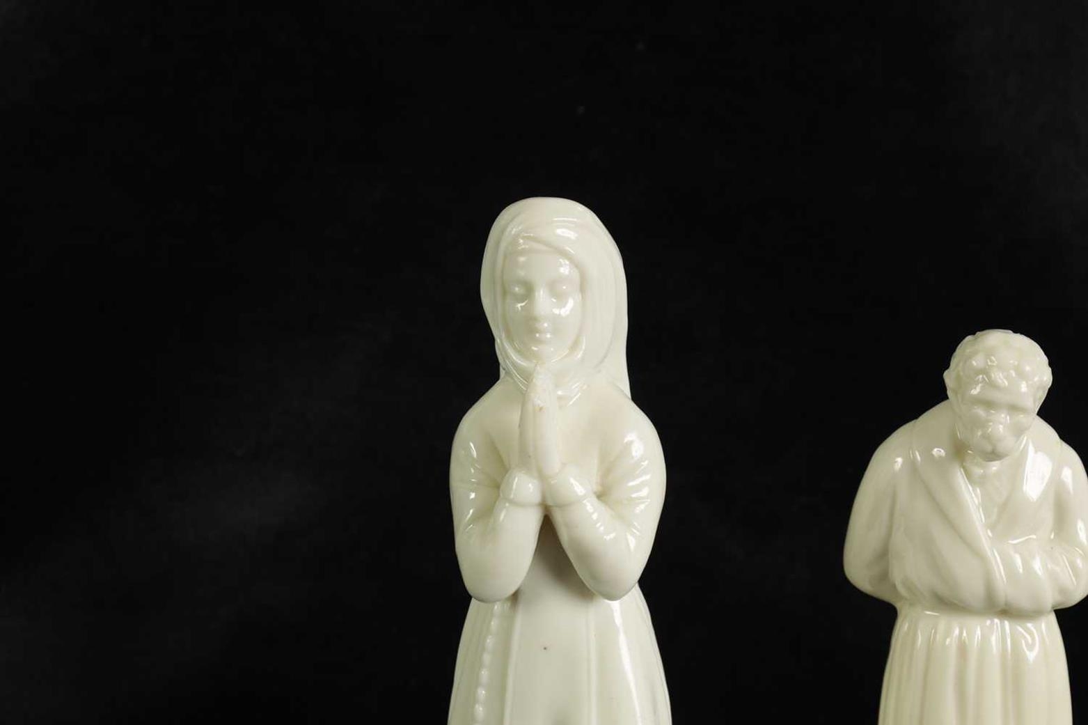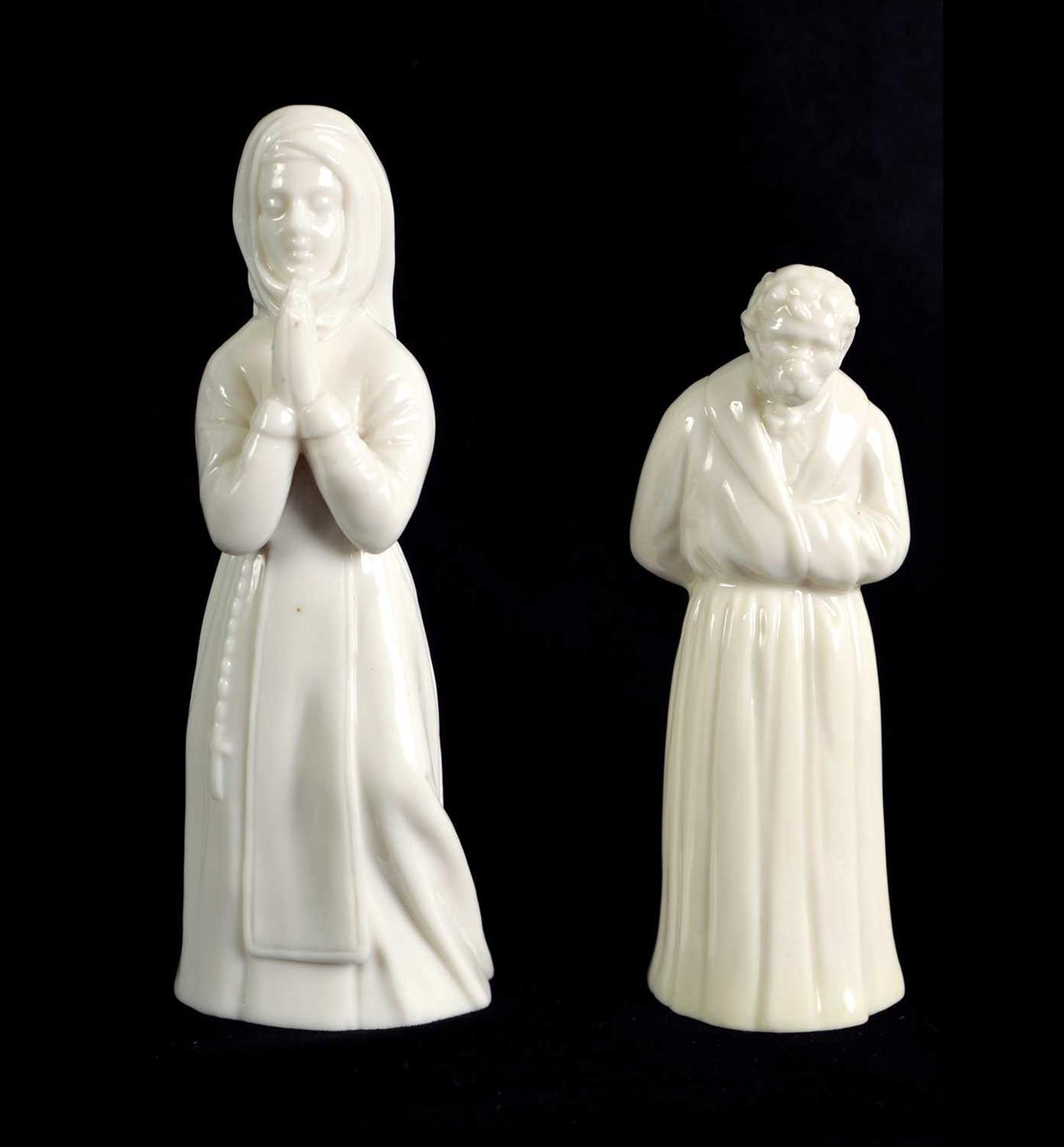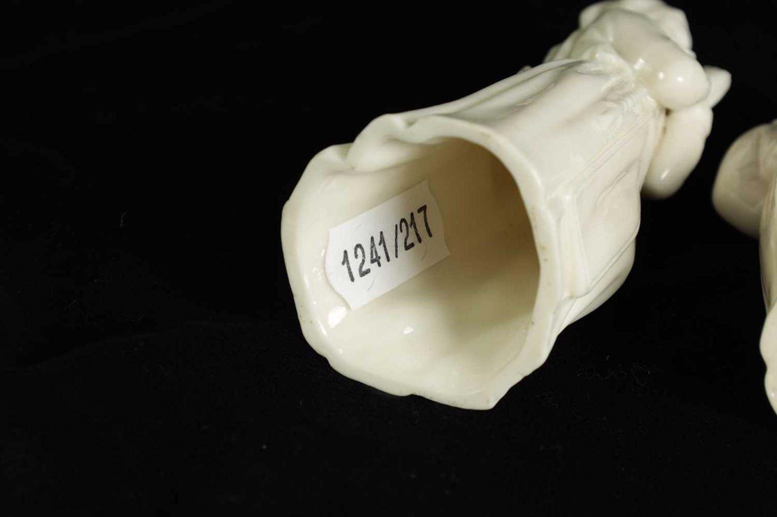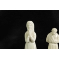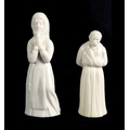 TWO RARE KERR & BINNS PORCELAIN CANDLE EXTINGUISHERS CIRCA 1855, The praying Nun, also known as Sister of Mercy, finely modelled and white-glazed, in a flowing habit and wimple, her hands raised in prayer together with THE PHILOSOPHER with hand tucked in gown (2) - illustrated on pages 22 and 30 of Distinguished Extinguishers by Tony Horsley. (Praying Nun 11cm high)