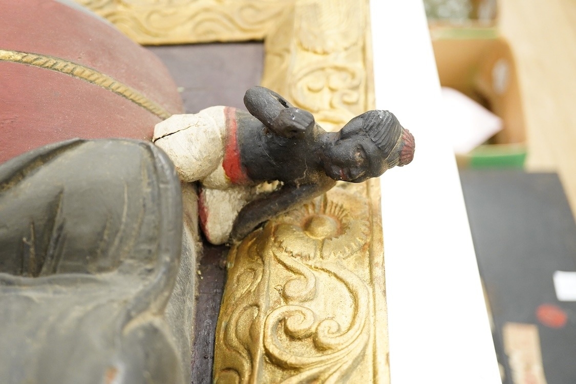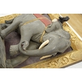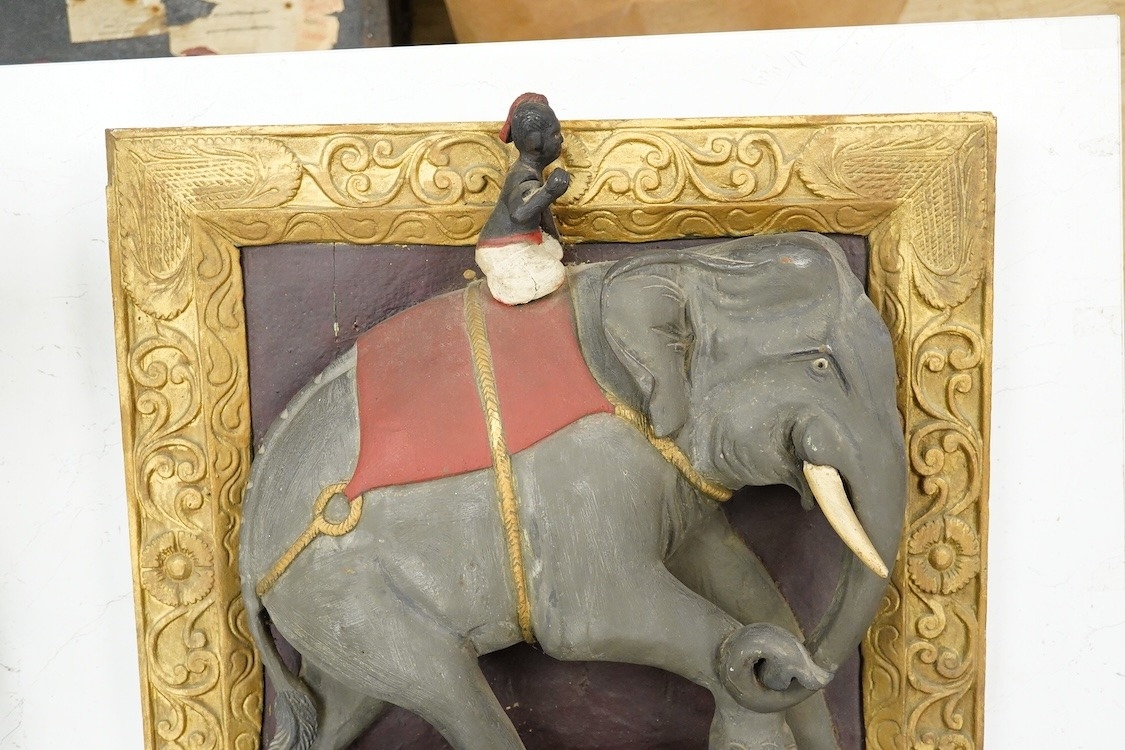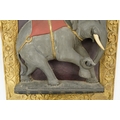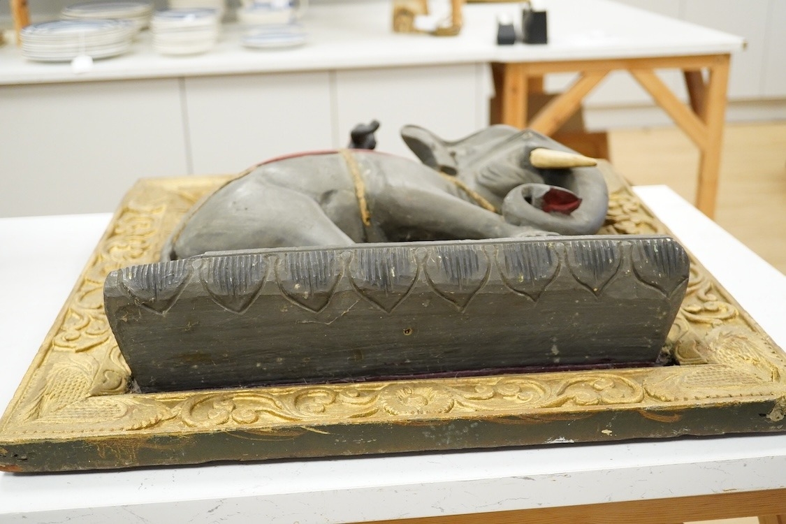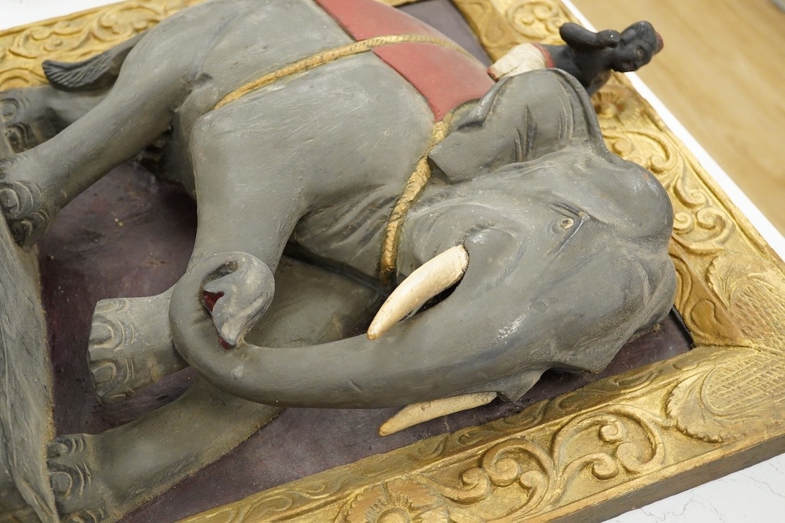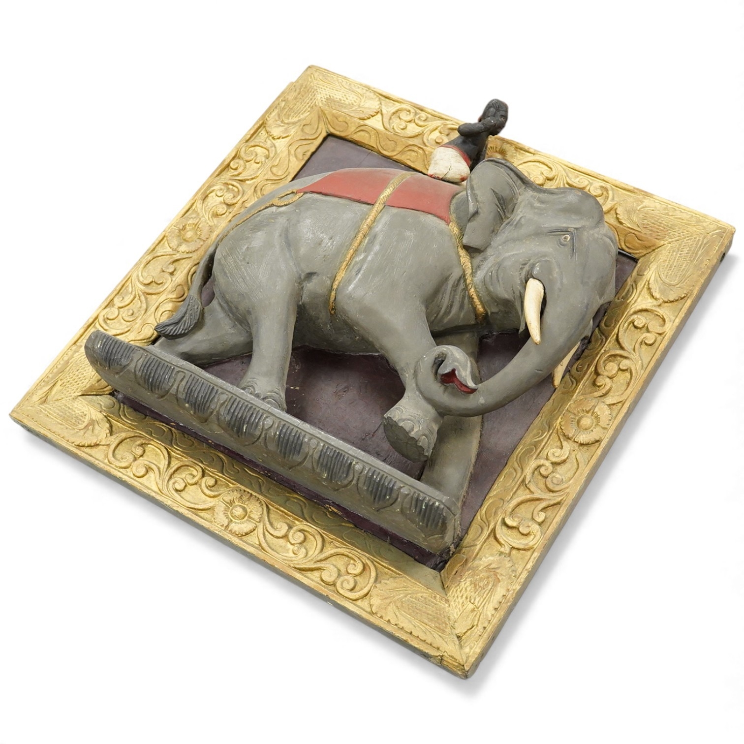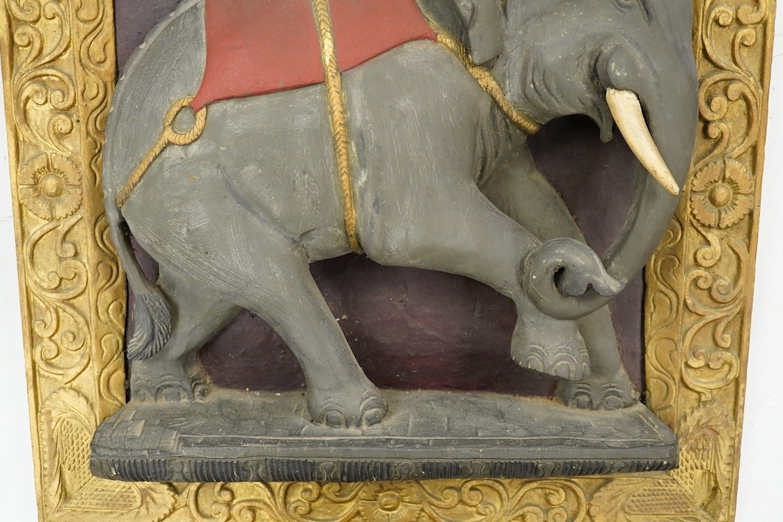A giltwood panel with a carved elephant relief, 54cm x 53cm
