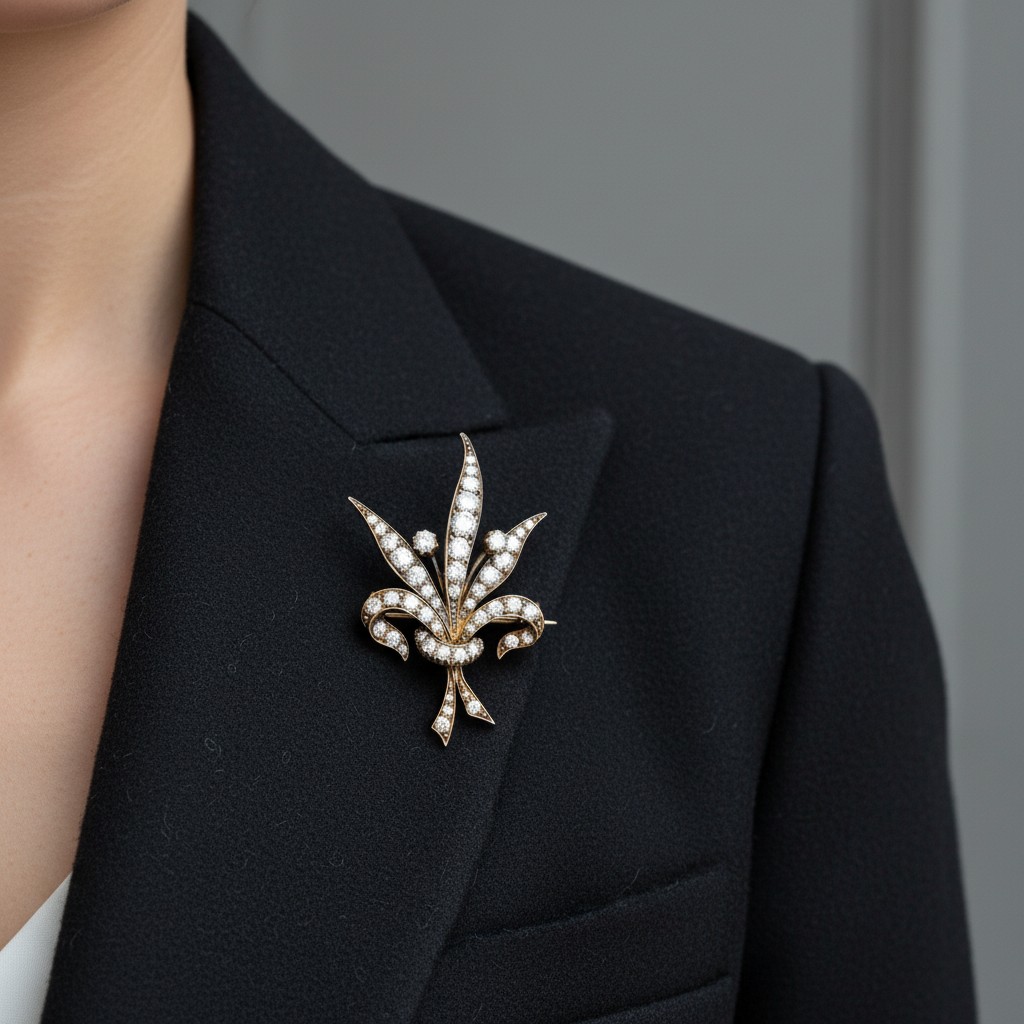 An Antique Diamond Brooch in yellow gold and silver in foliate form, set with old cut diamonds weighing approx. 3.0ct with the largest stone approx. 0.28ct.