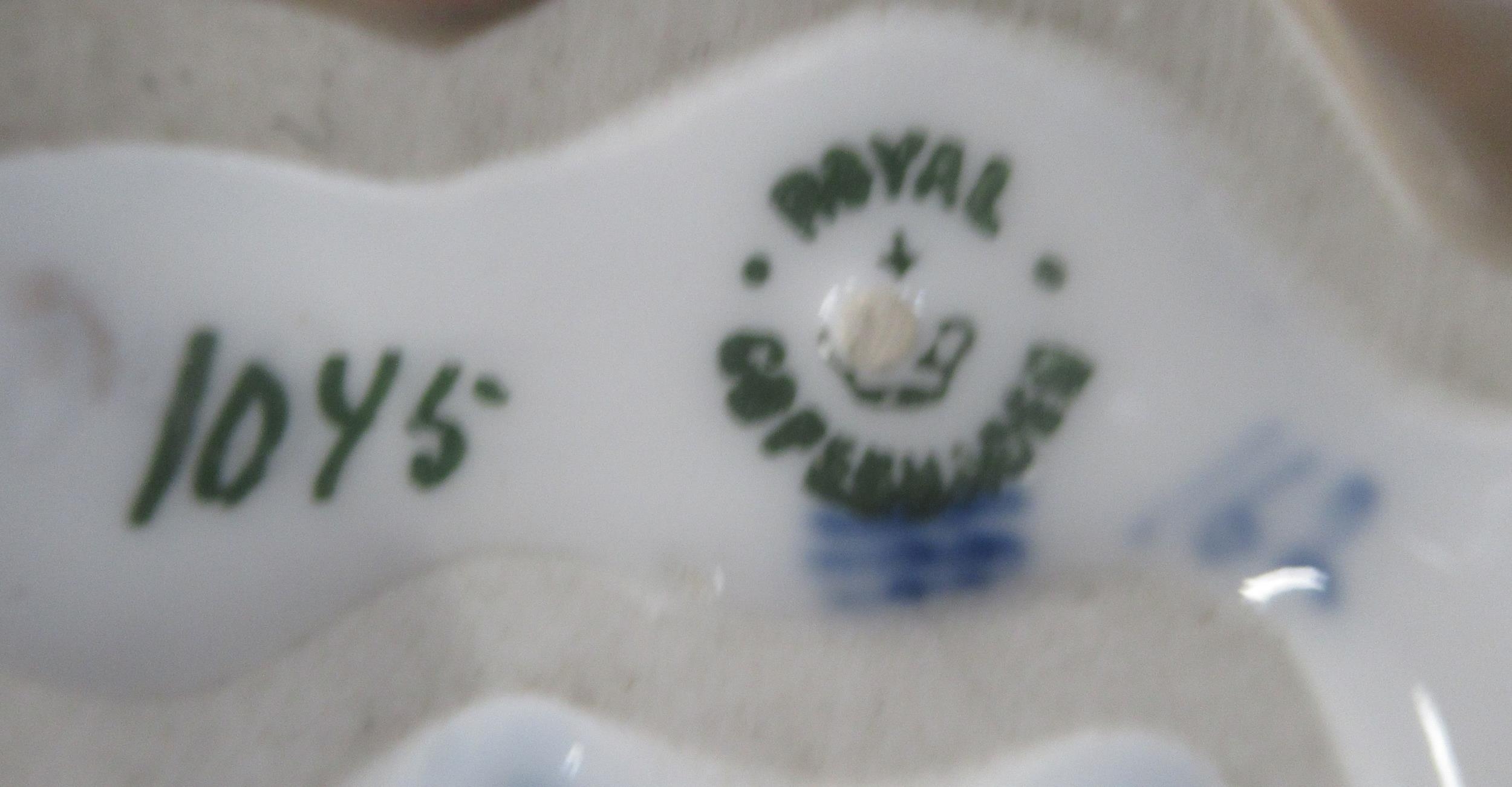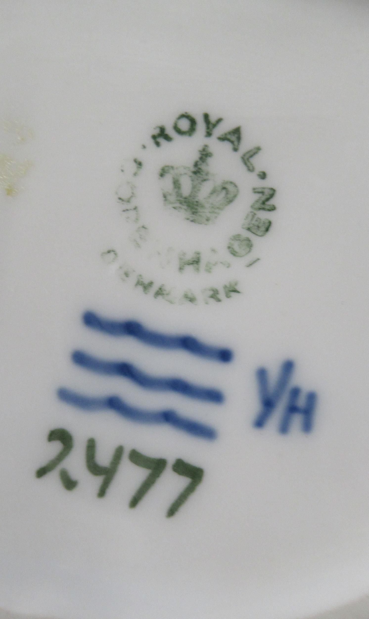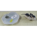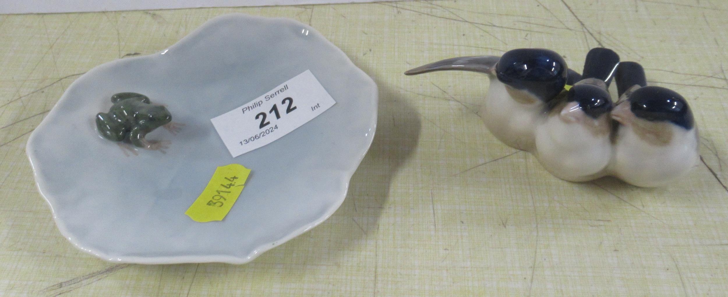 A Royal Copenhagen model, of three birds, No 1045 made before 1927, together with a frog on a dish No 2477