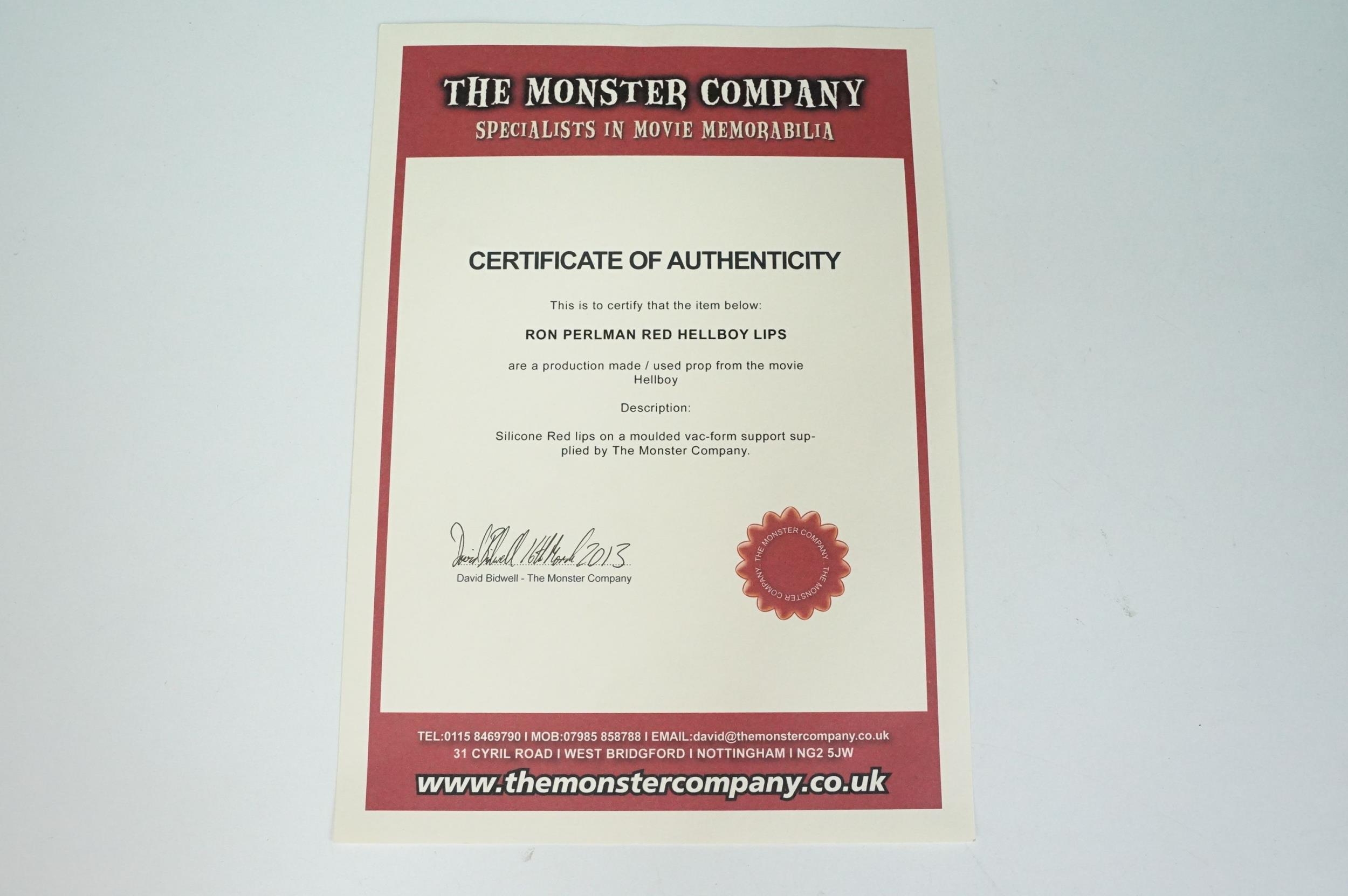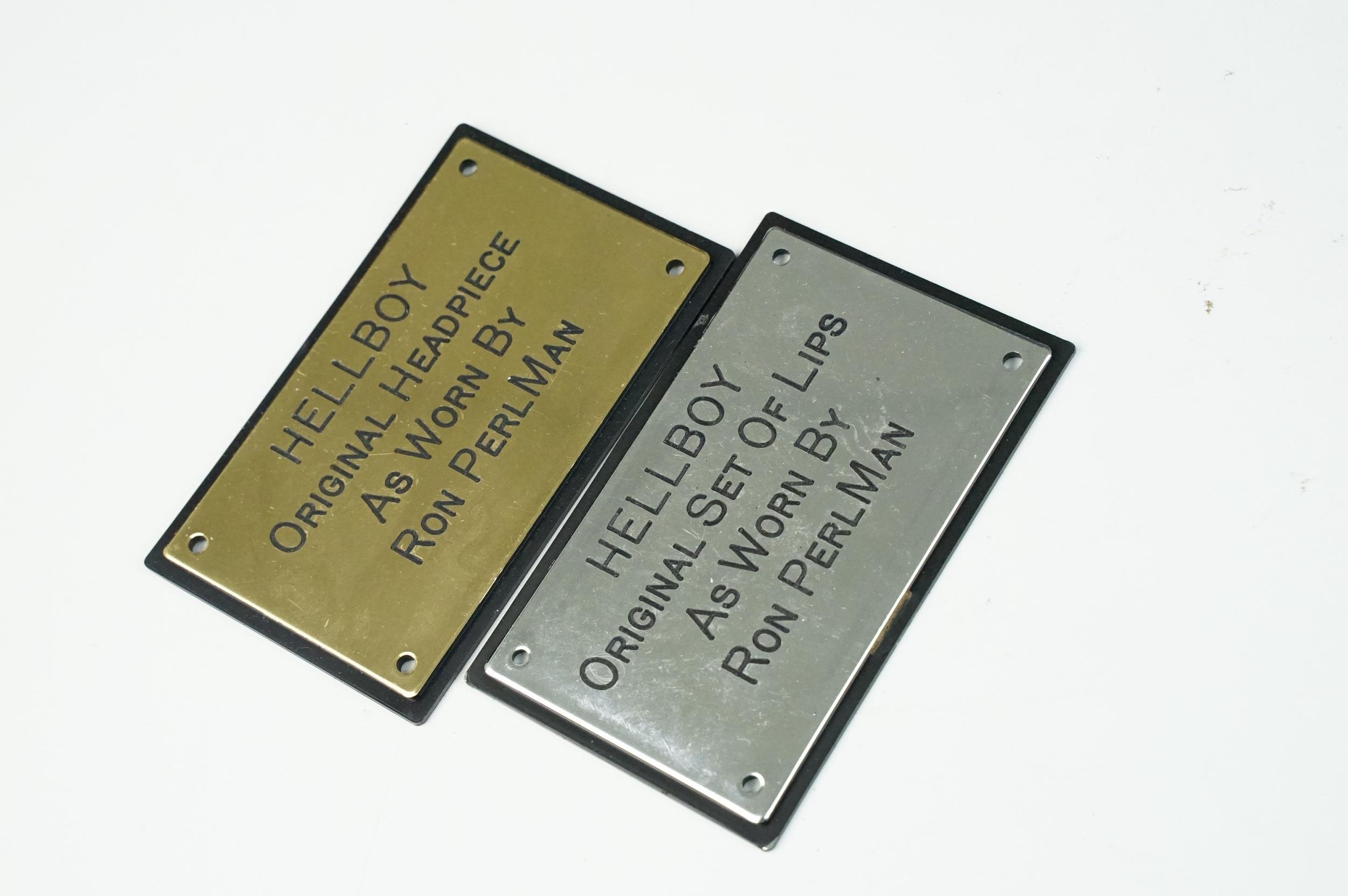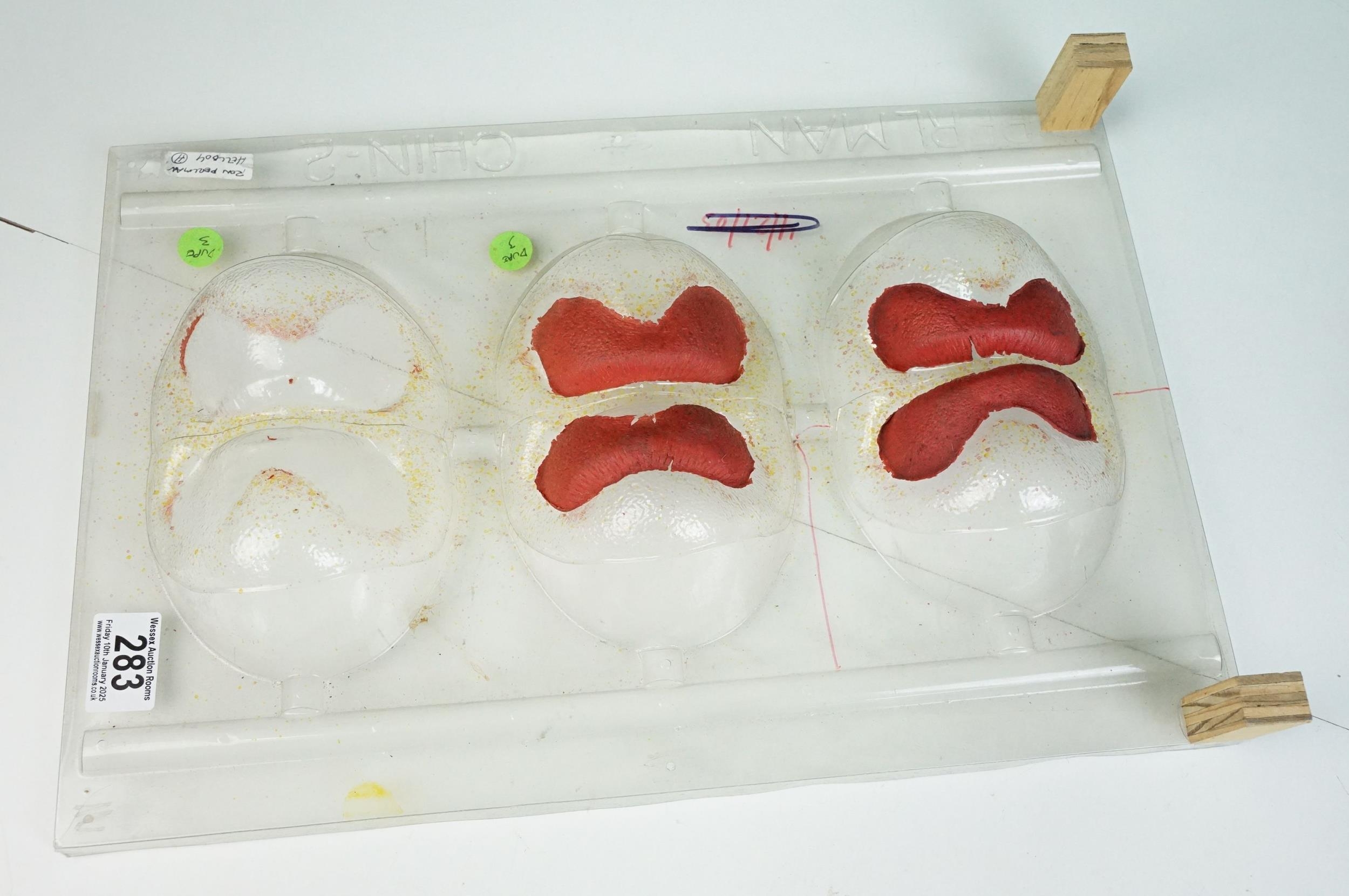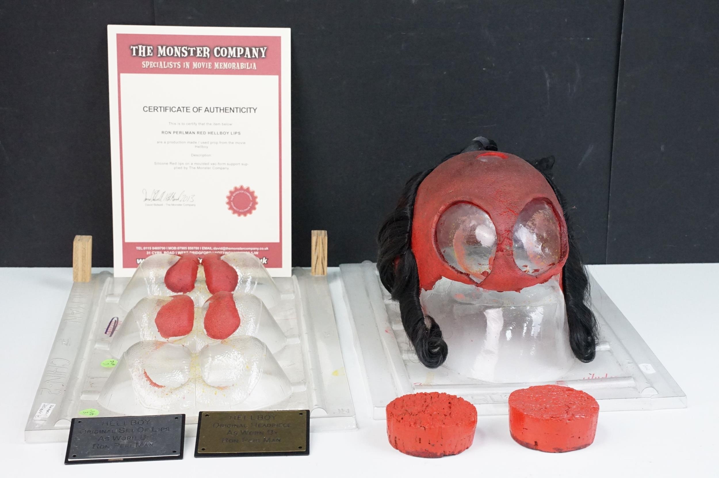 Film props - Collection of original Ron Perlman Hellboy movie props to include headpiece residing on a vacuform plastic mould with “Perlman” cast into the plastic, 2 x sets of lips residing on vacuform mould with 'Perlman Chin 2' cast onto plastic, and 2 x horn stubs, plastic moulds feature small stickers/pen note from production,