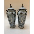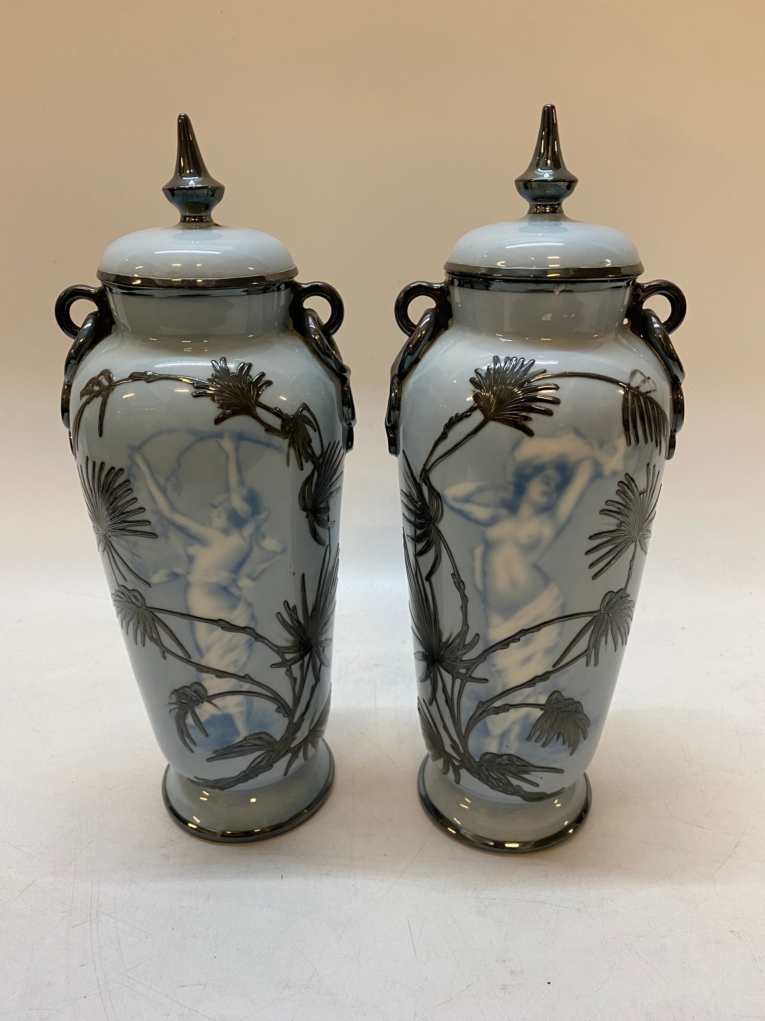 A pair of Rosenthal Copenhagen pate sur pate style vases and covers decorated with semi nude females and applied handles and flower and leaf decoration to the bodies - 11in. high