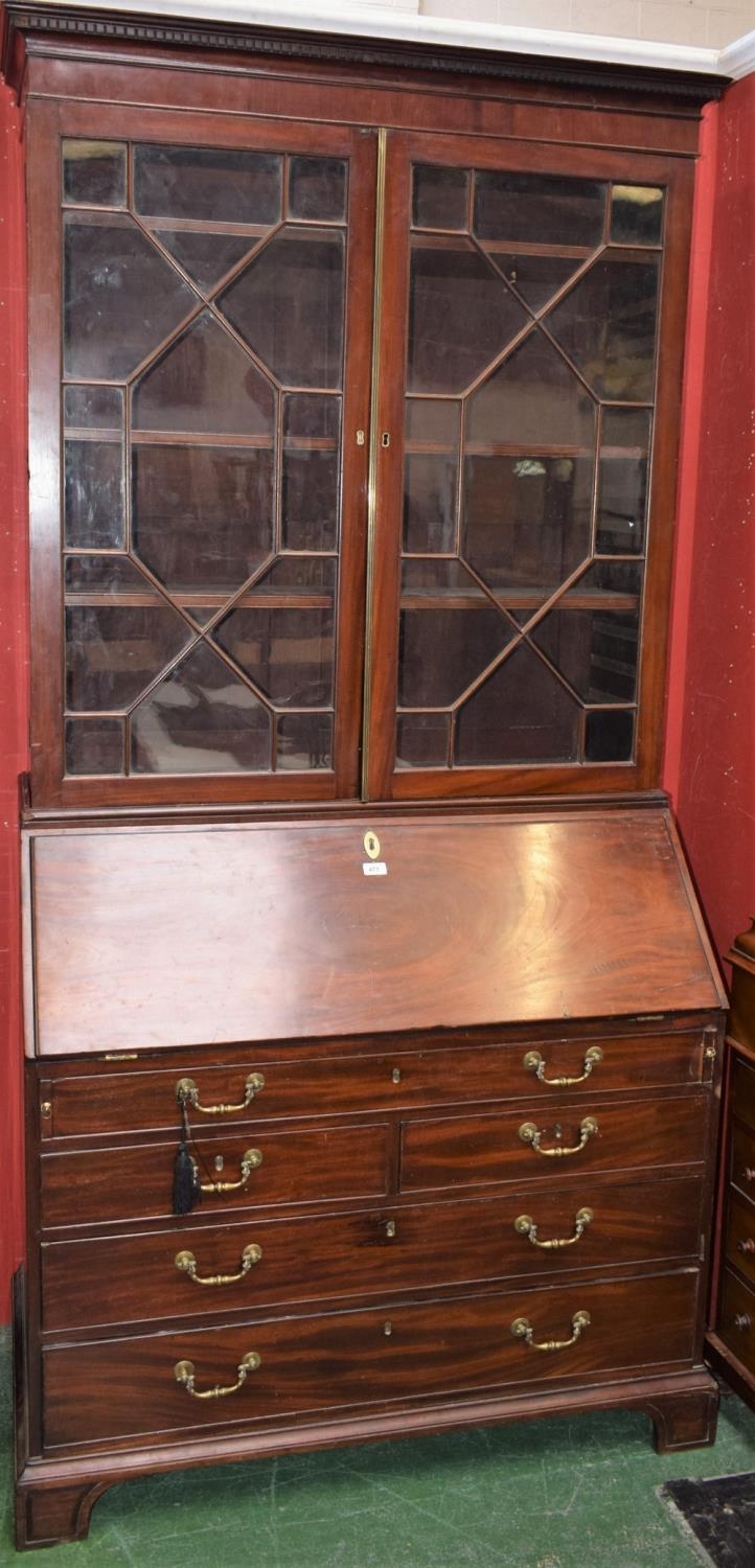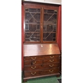 A 19th century mahogany bureau bookcase, outswept dentil cornice above a pair of glazed doors enclosing three adjustable shelves, the base with a fall front enclosing an arrangement of pigeon holes and small drawers above an arrangement of further cockbeaded drawers, brass swing handles, bracket feet, 228cm high