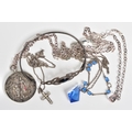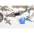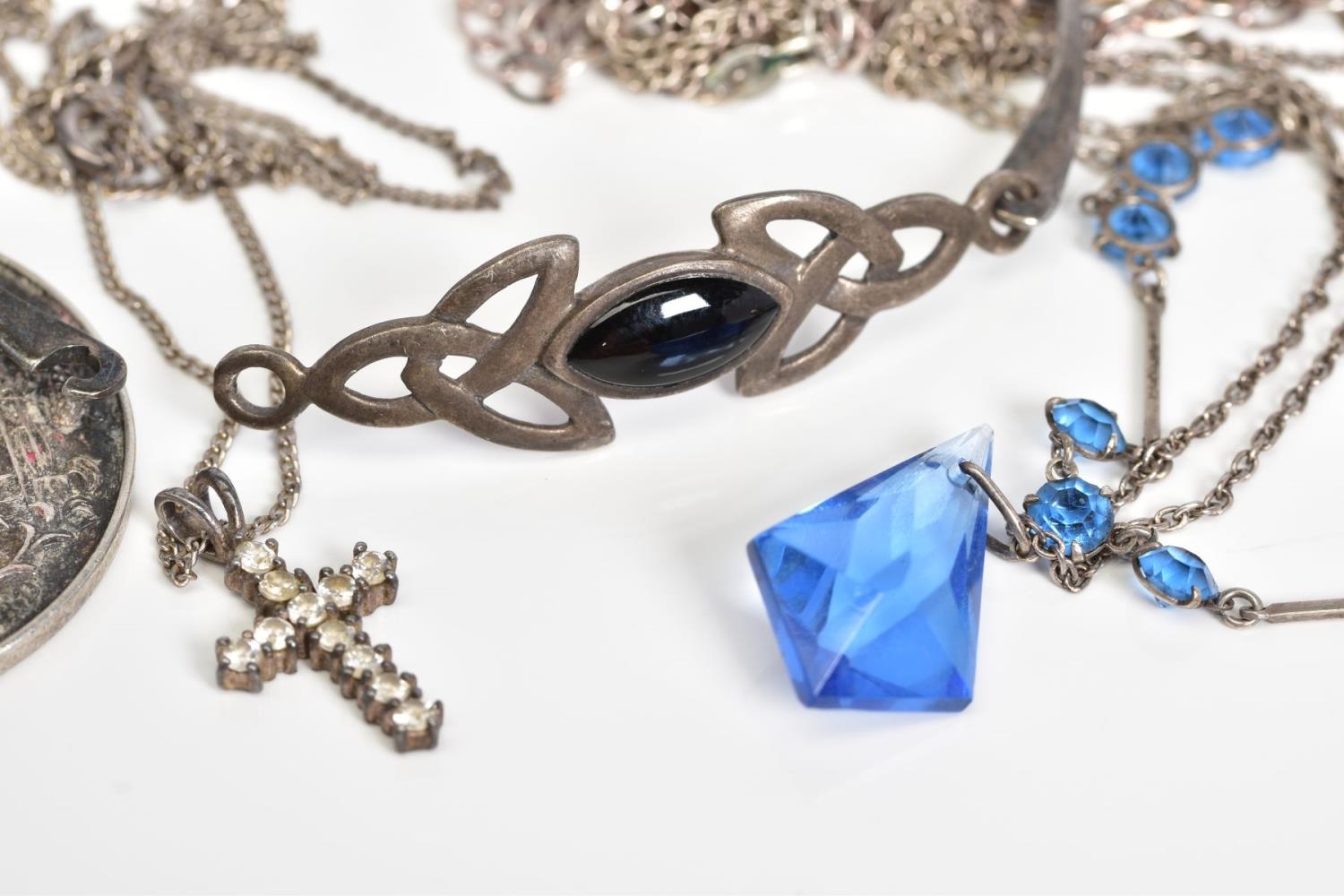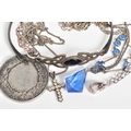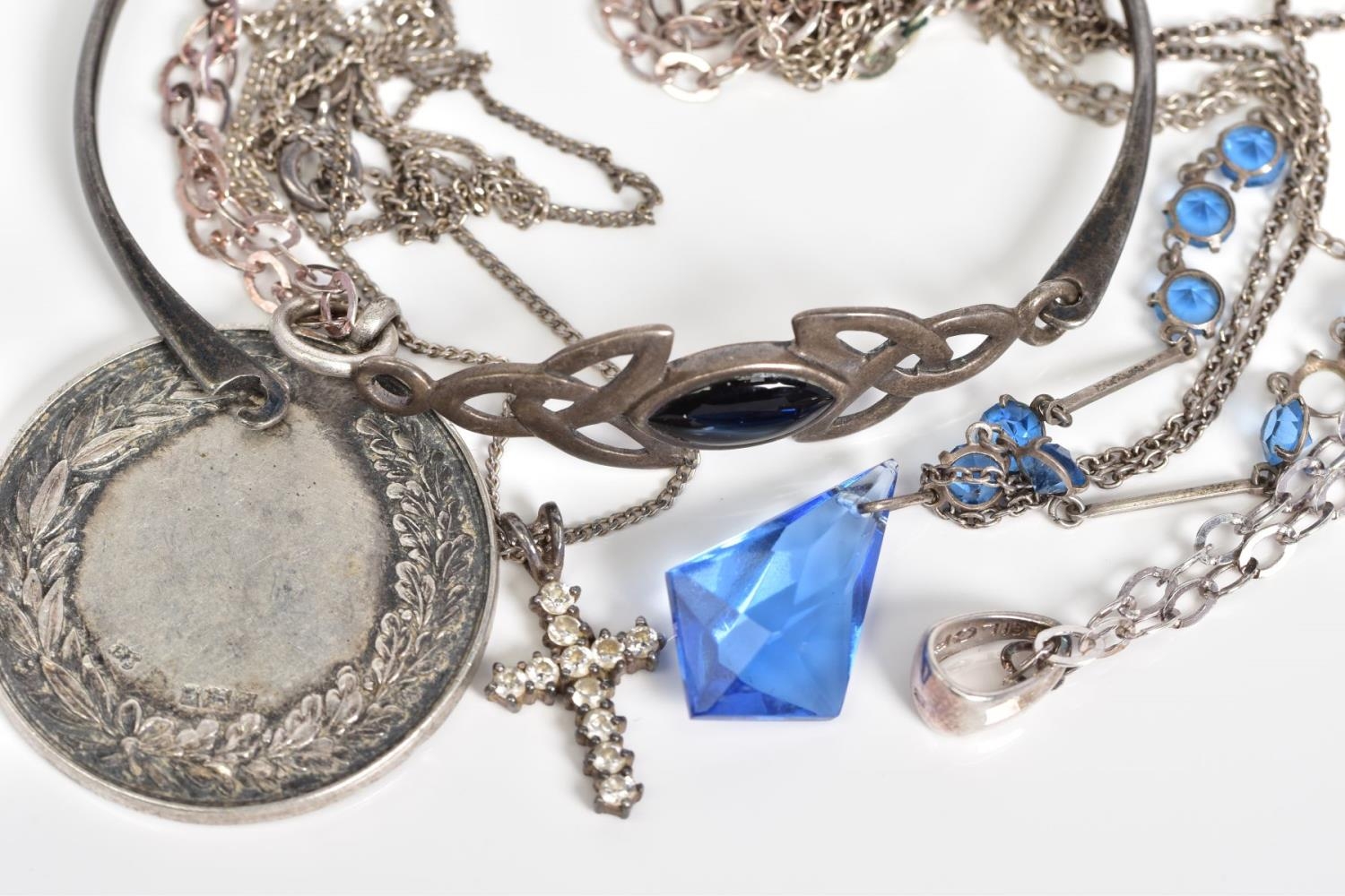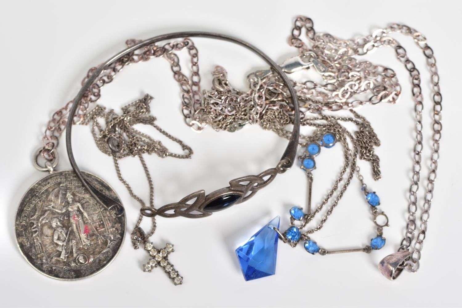 A SELECTION OF JEWELLERY, to include a Celtic silver hinged bangle with a black enamel panel to front, a circular silver medal of the 'National Smallbore Rifle Association' with a Birmingham hallmark, suspended from a curb link chain, together with three curb link chains most with marks to indicate silver, approximate gross weight 37.4 grams