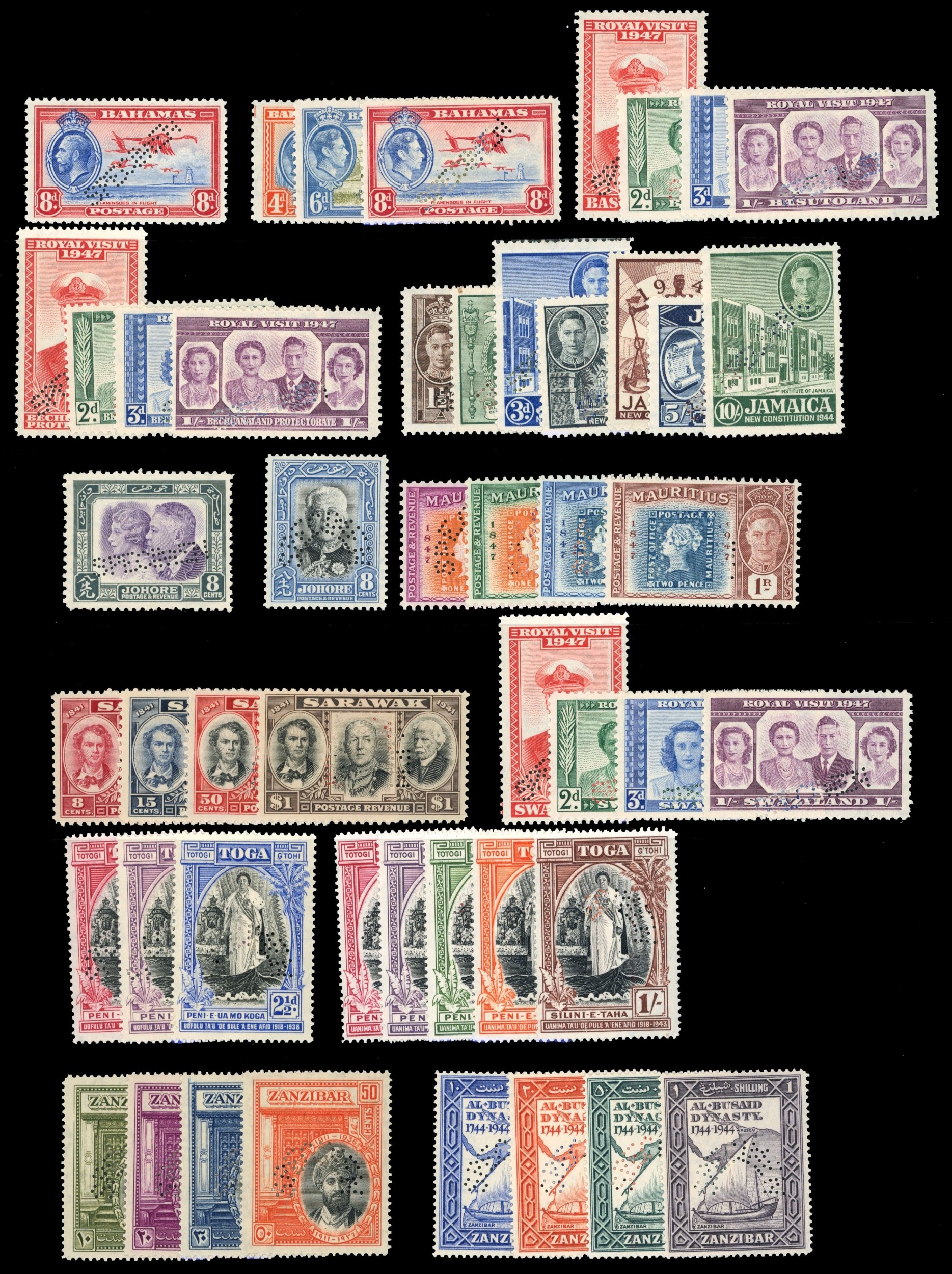 KGVI era Specimens, fine large part o.g. unless stated. Bahamas 1935 8d, 1938 Pictorial 4d - 8d, Basutoland Royal Visit (unmounted), Bechuanaland Royal Visit, Jamaica New Constitution, Johore 1935 8c (short perf, no gum), 1940 8c, Mauritius Stamp Centenary, Sarawak (unmounted, acceptable toning), Swaziland Royal Visit (unmounted, 1s with perfin misplaced down across bottom perfs), Tonga 1938 trio (offsets on reverse of 2d and 2½d), 1944 Jubilee set, Zanzibar 1936 Jubilee (usual gum, hinged remainders) and 1944 Al-Busaid. All are genuine