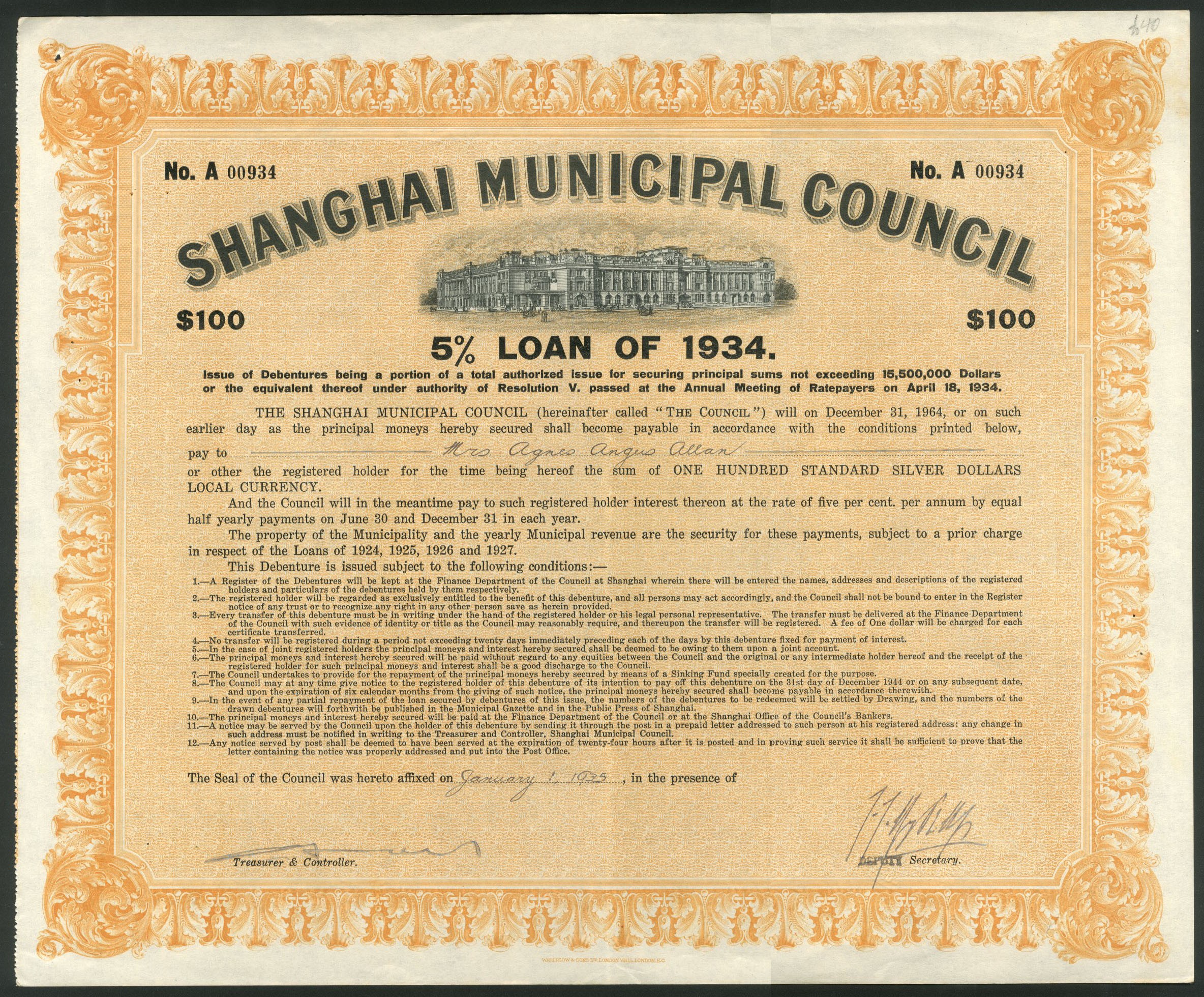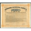 China: Shanghai Municipal Council, 5% Loan of 1934, $100 debenture, #A00934, grand Municipal offices at top, yellow and black, printed by Waterlow & Sons. AEF.