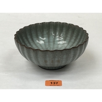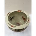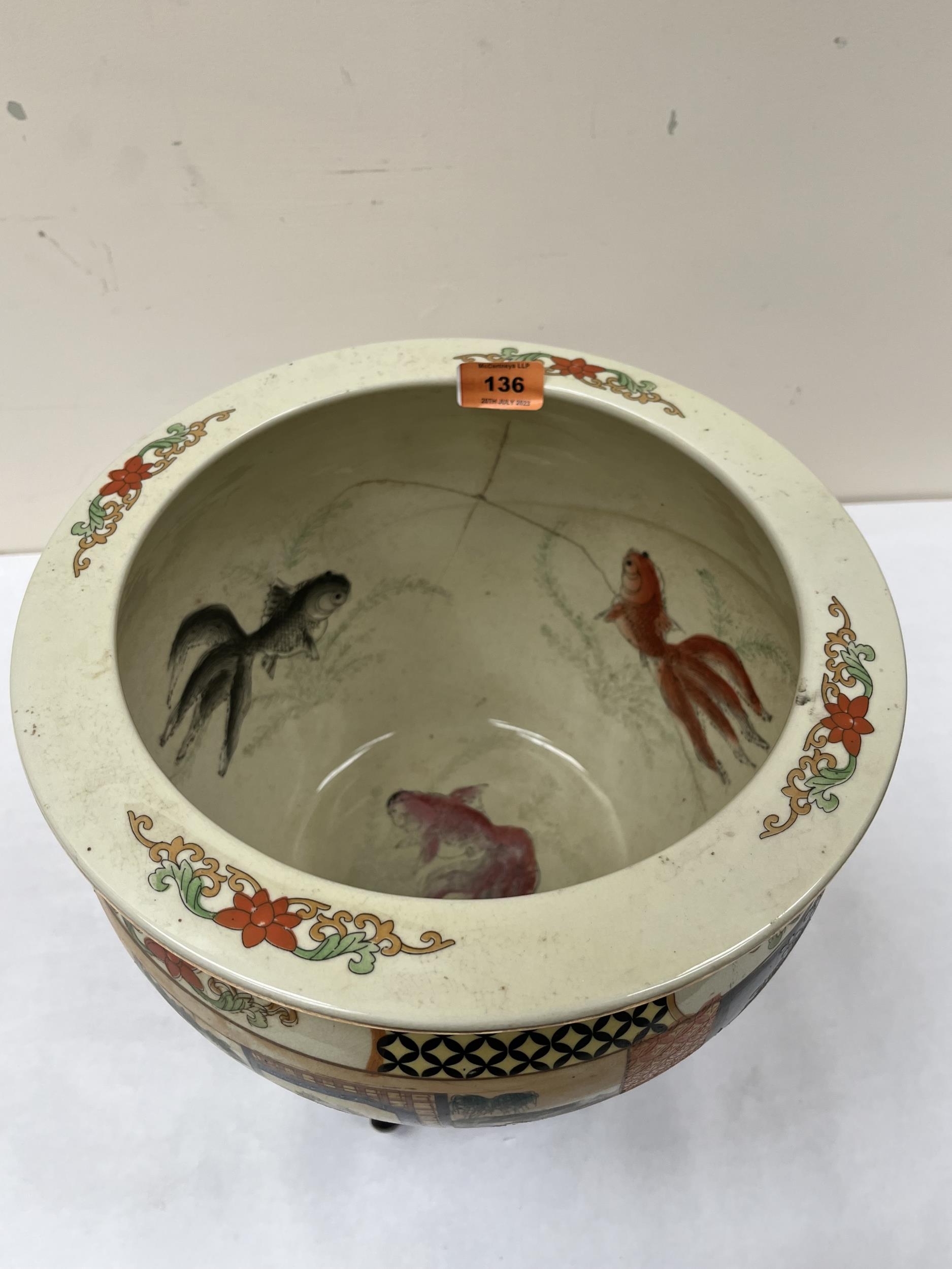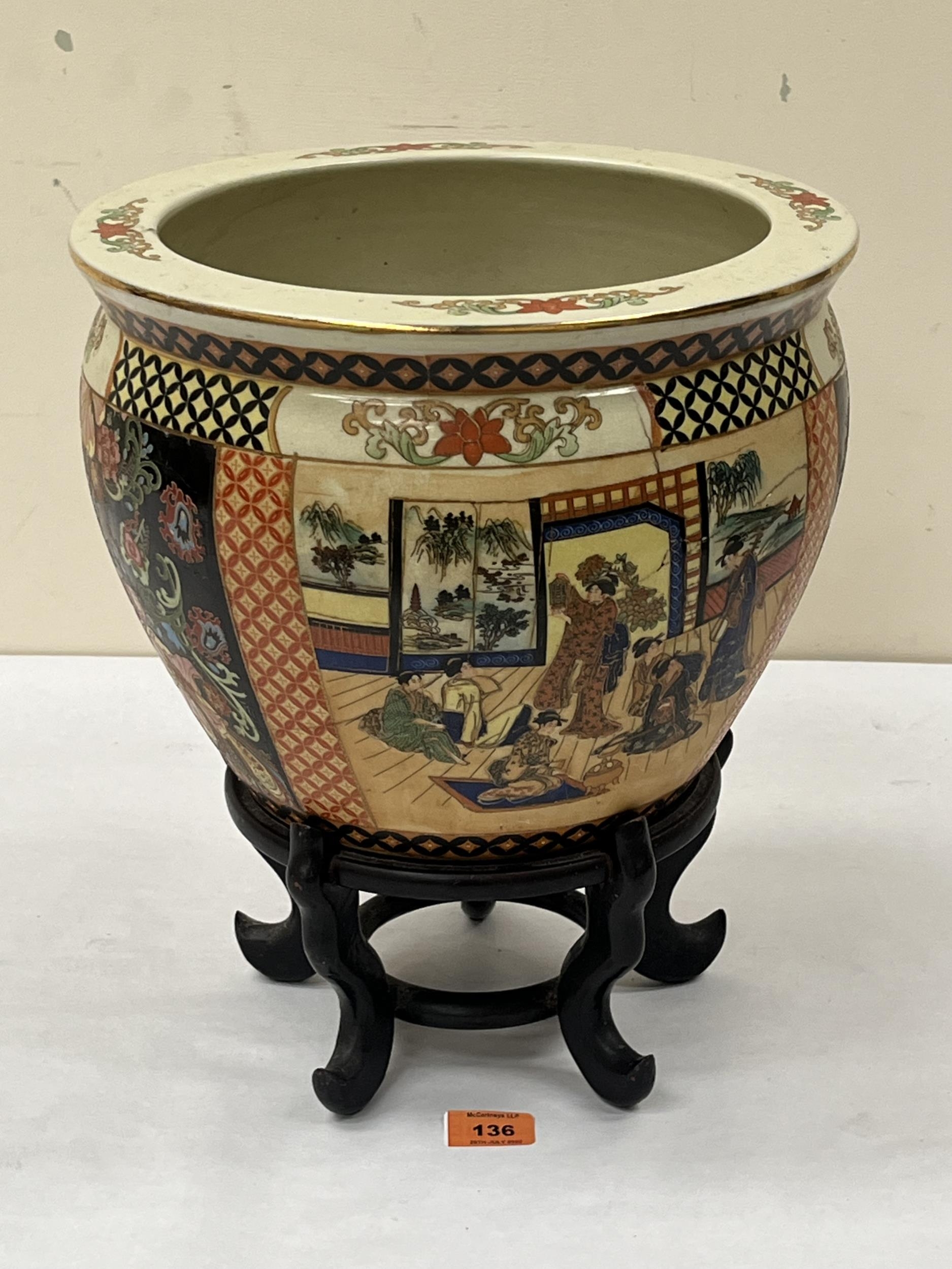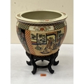A Japanese fish bowl on wood stand, decorated with figure or foliate scenes in four reserves. 12¼' diam. Cracked