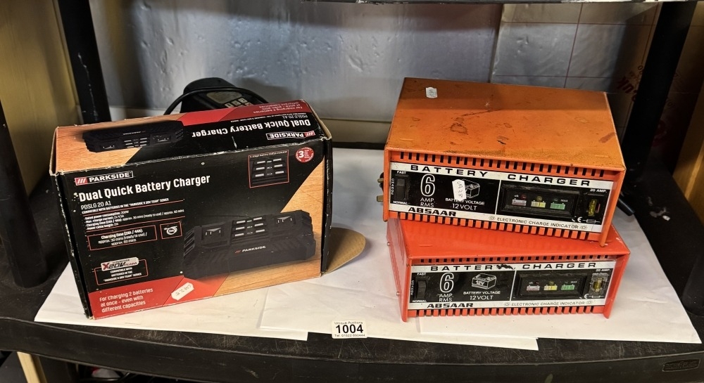 2 Car battery chargers, A boxed dual quick battery charger (Parkside) & A rechargable battery with charger