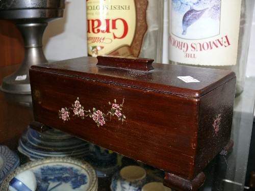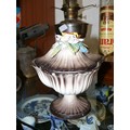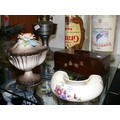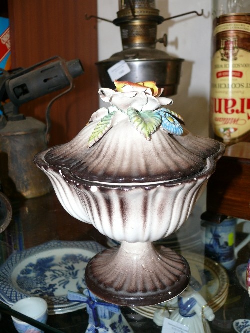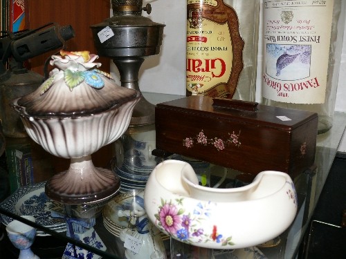 A CAPODIMONTE LIDDED BOWL, AXE VALE POTTERY POSIE HOLDER AND A DECORATIVE WOODEN BOX.