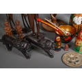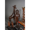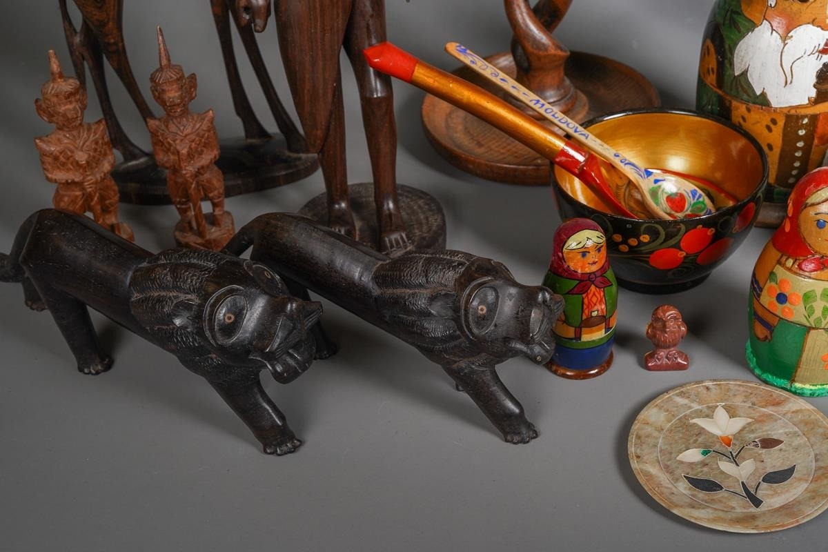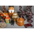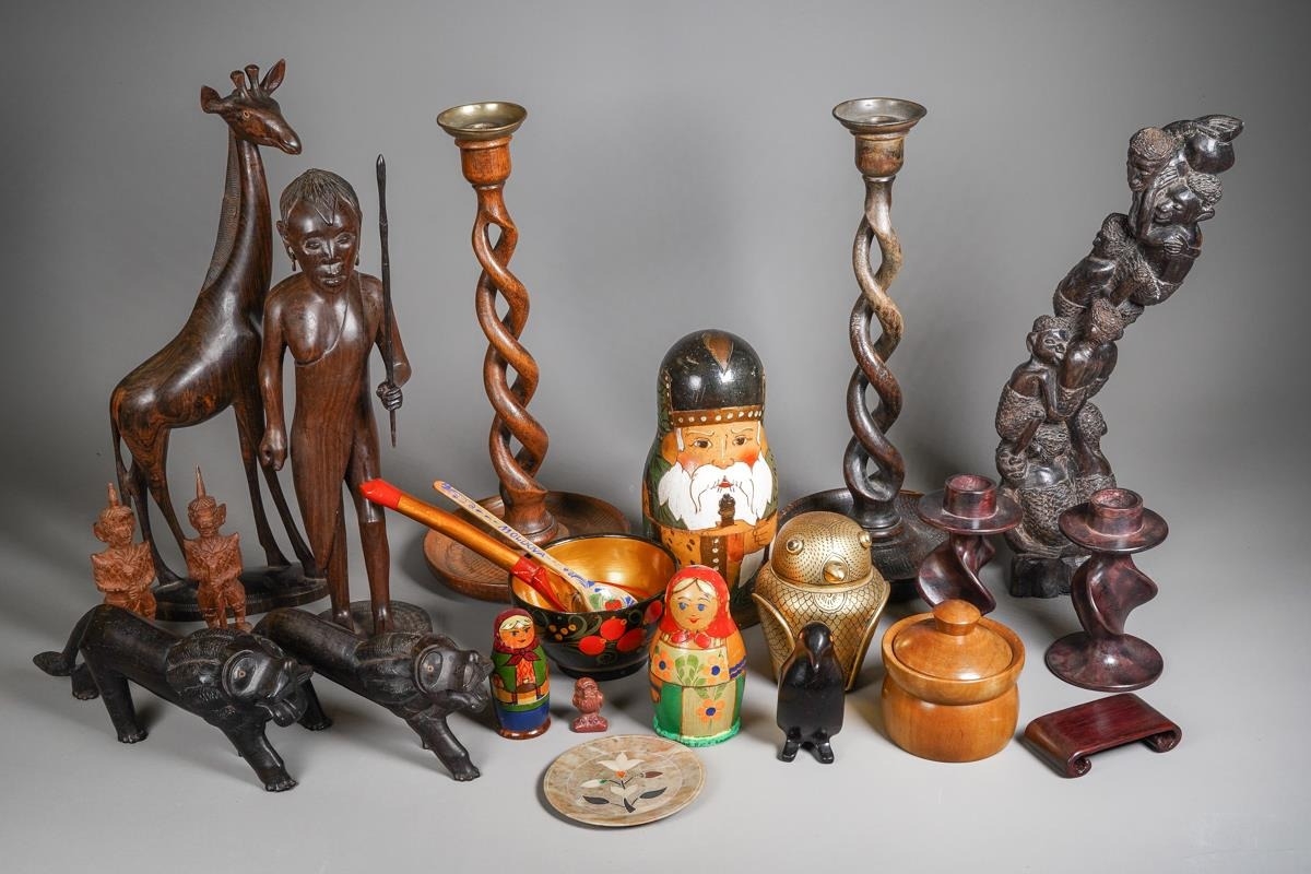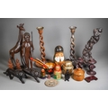A box of African tribal carvings, a pair of early 20th century oak barley twist candlesticks, three Russian nesting doll sets, a gilt decorated lacquer canopic syle jat, a pair of carved stone candlesticks, etc (1 box)