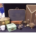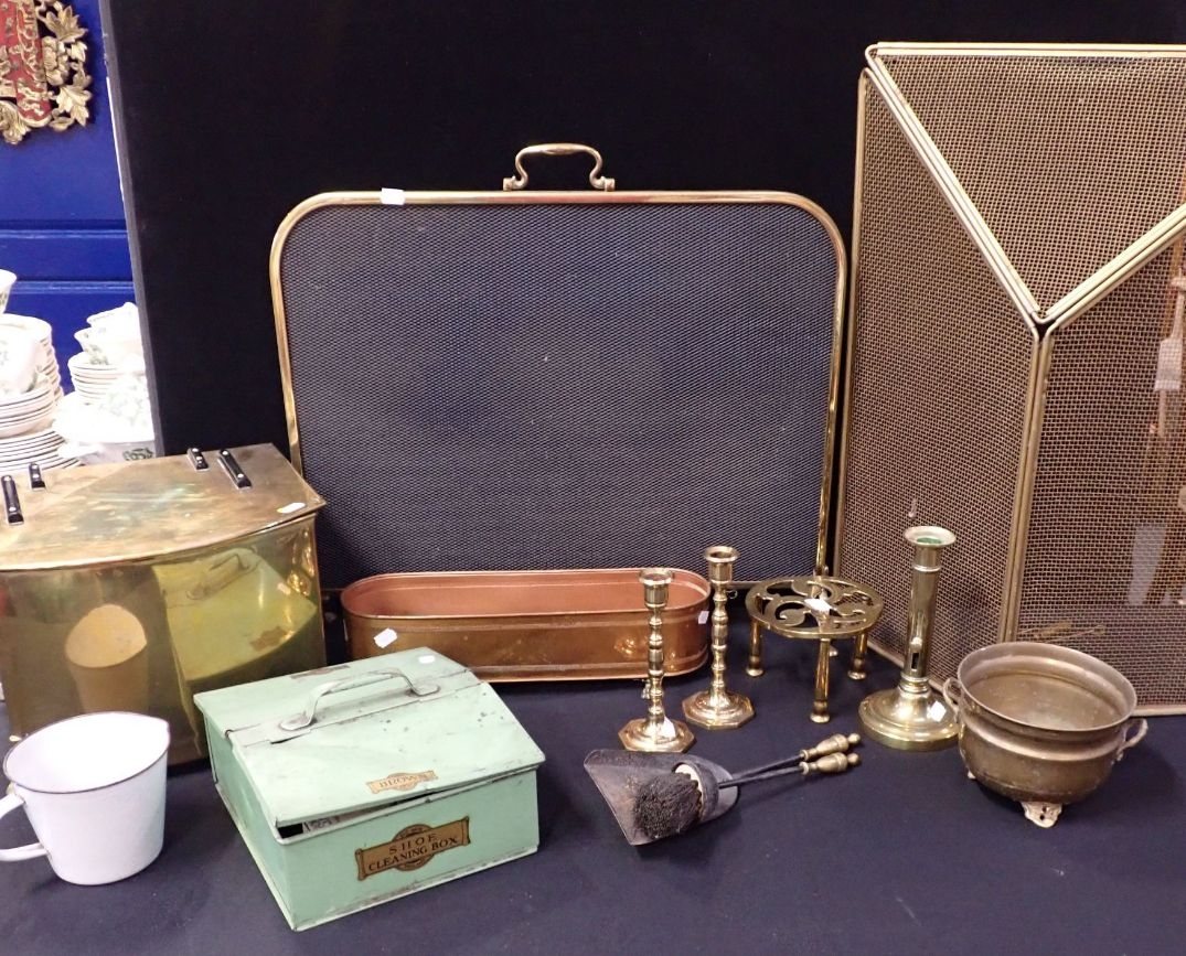 A BRASS COAL BOX, CANDLESTICKS fire guards and other items