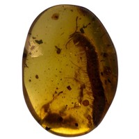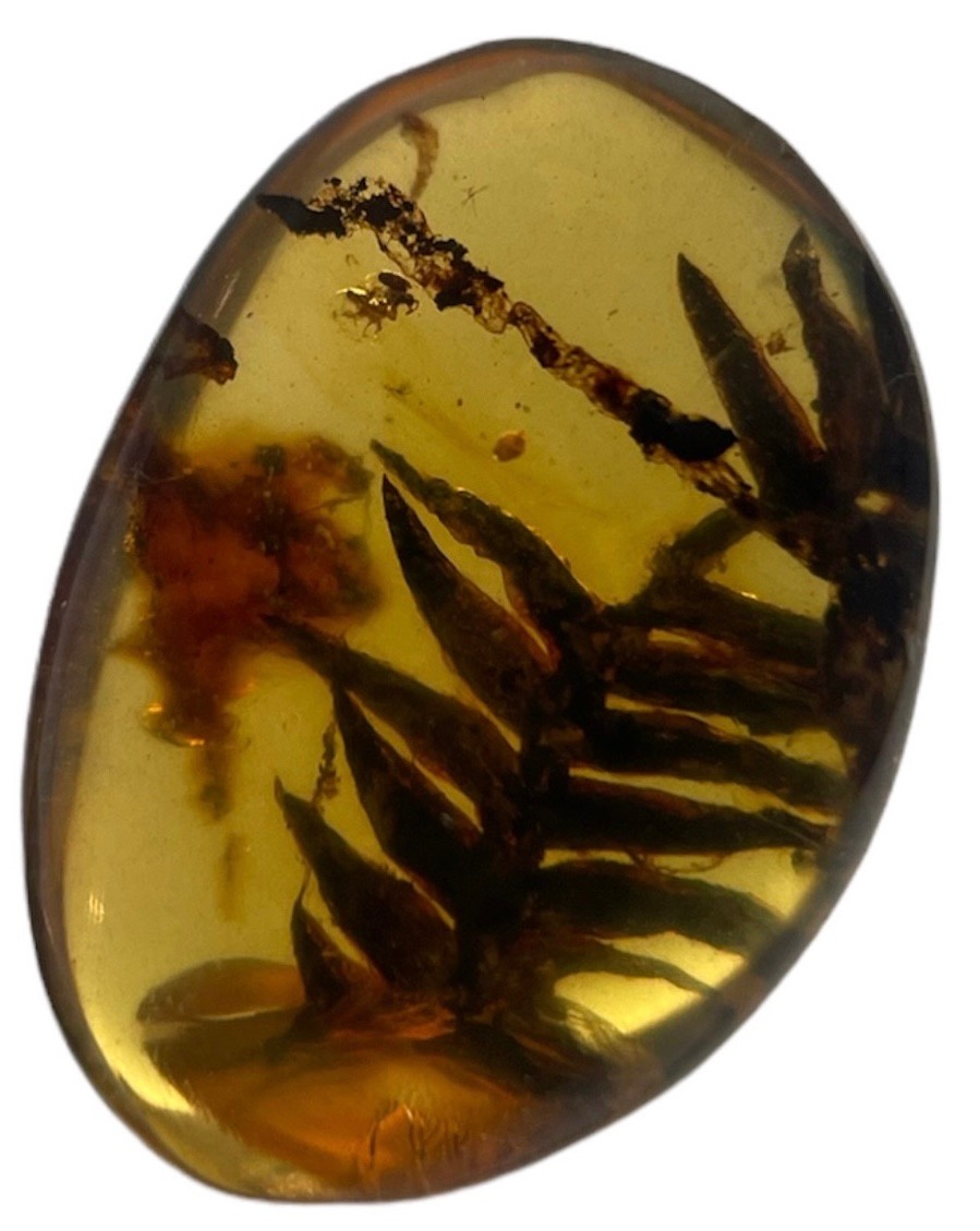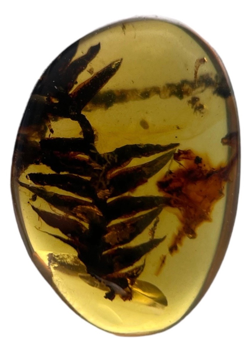 A fossilised fern frond in dinosaur-aged Burmese amber. From the mines of Kachin, Myanmar. Cretaceous circa 99 million years ago.