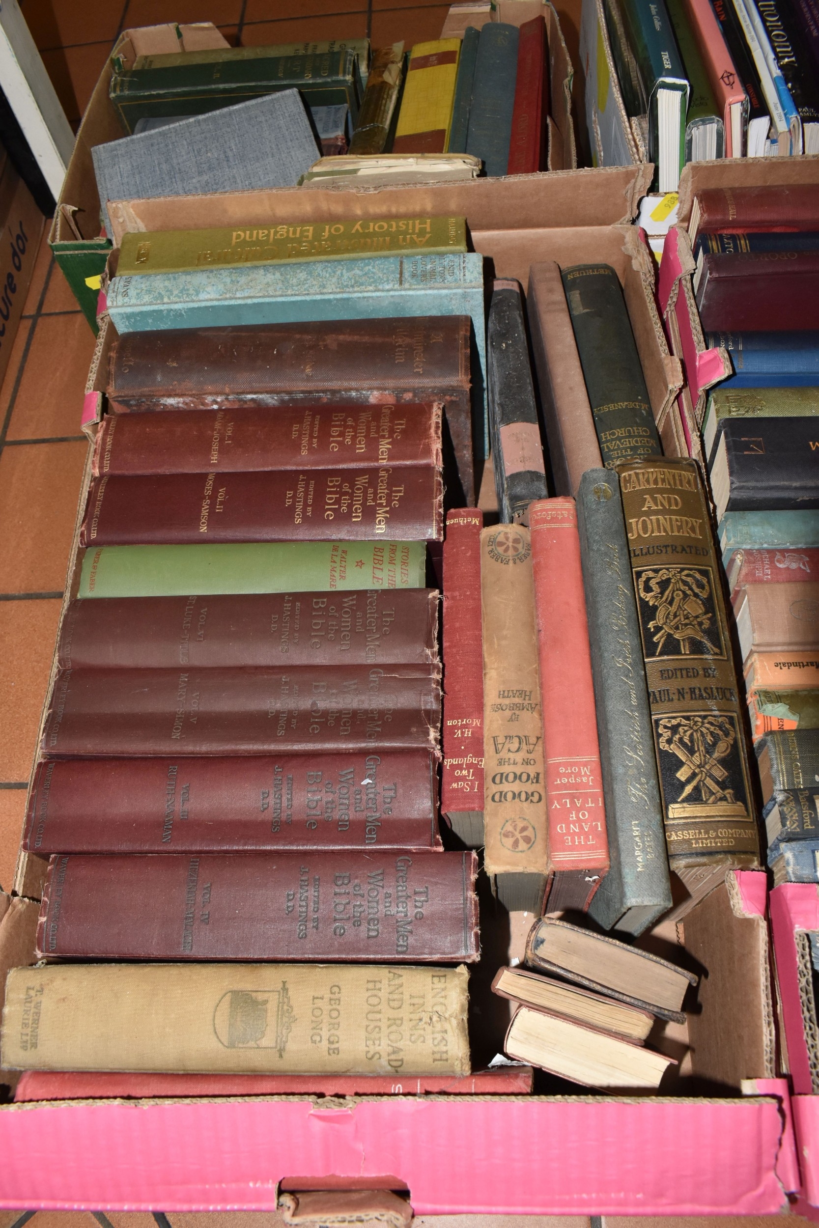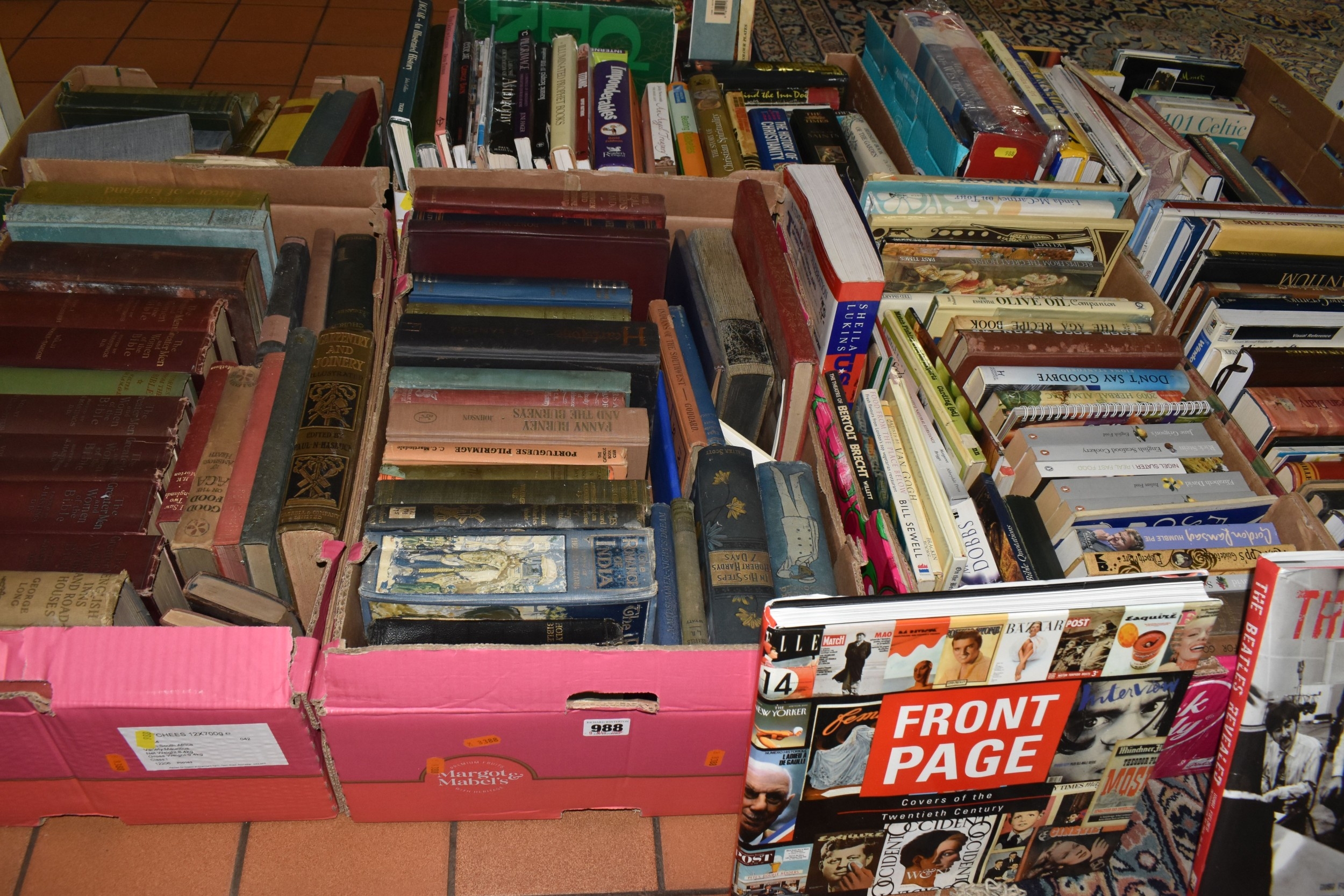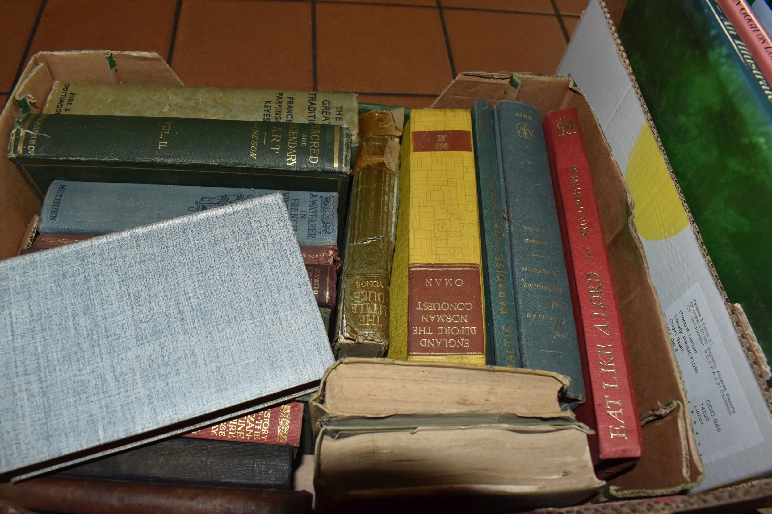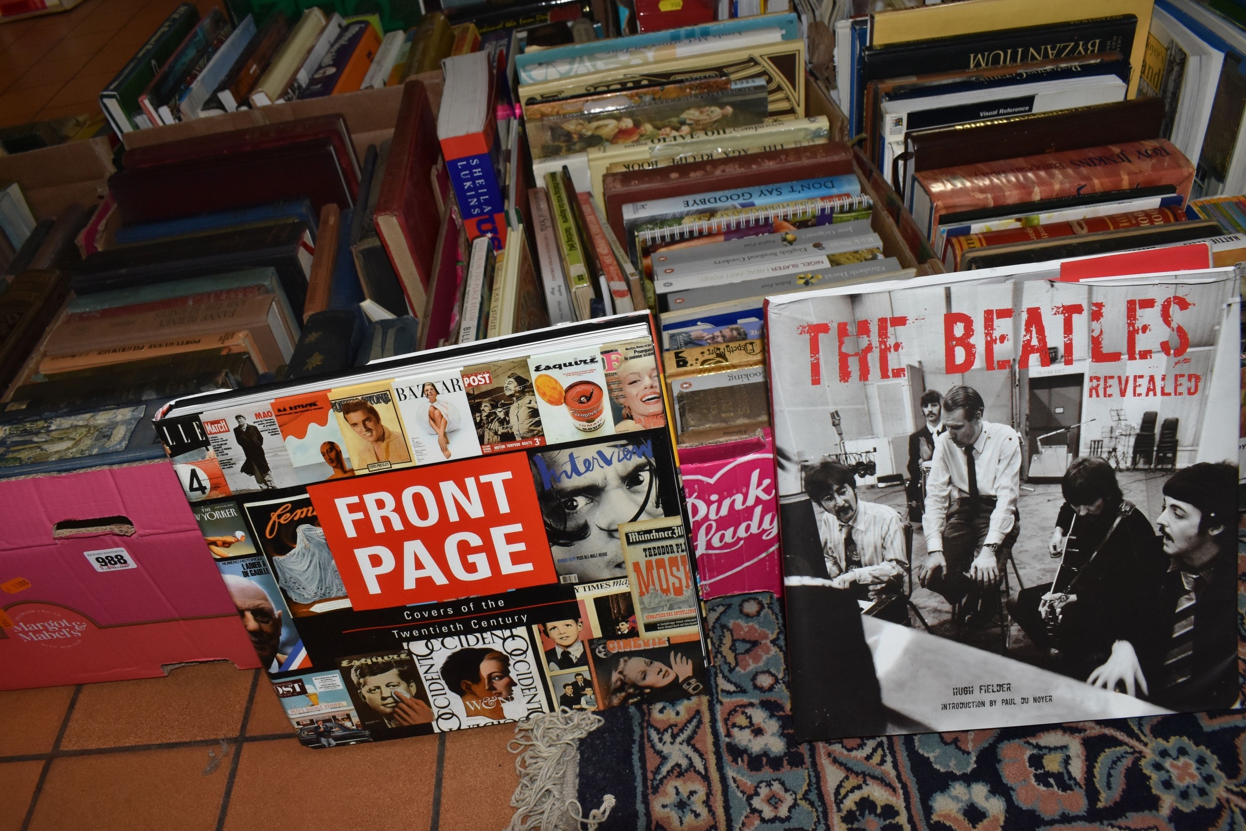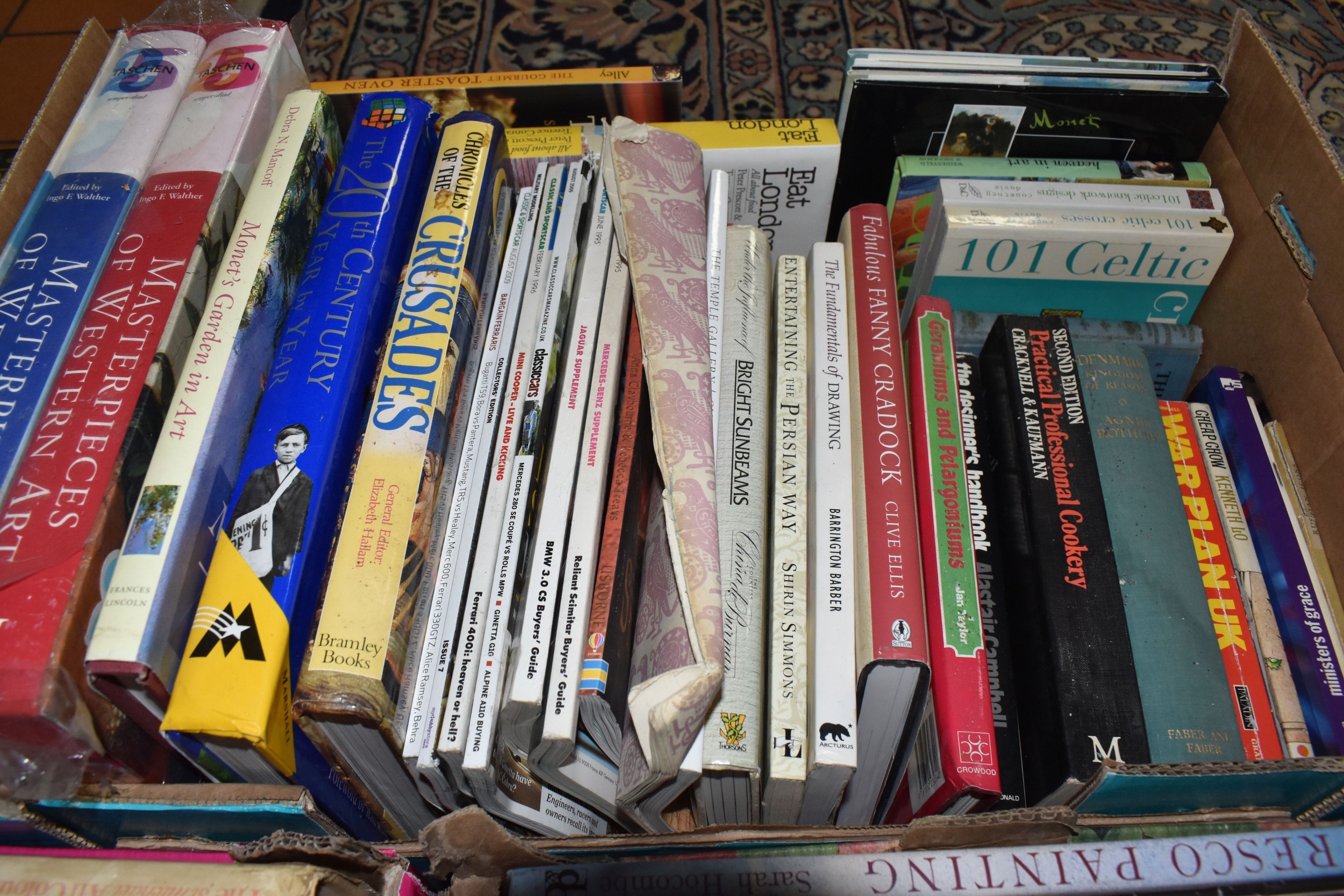 SEVEN BOXES AND LOOSE BOOKS, approximately one hundred and thirty titles in hardback and paperback formats, subjects to include history, Christianity, cookery, antiquarian and vintage titles, art, motoring, travel, etc, 'The Beatles Revealed' by Hugh Fielder, Taschen Masterpieces of Western Art in two volumes, etc (7 boxes + loose) (sd)