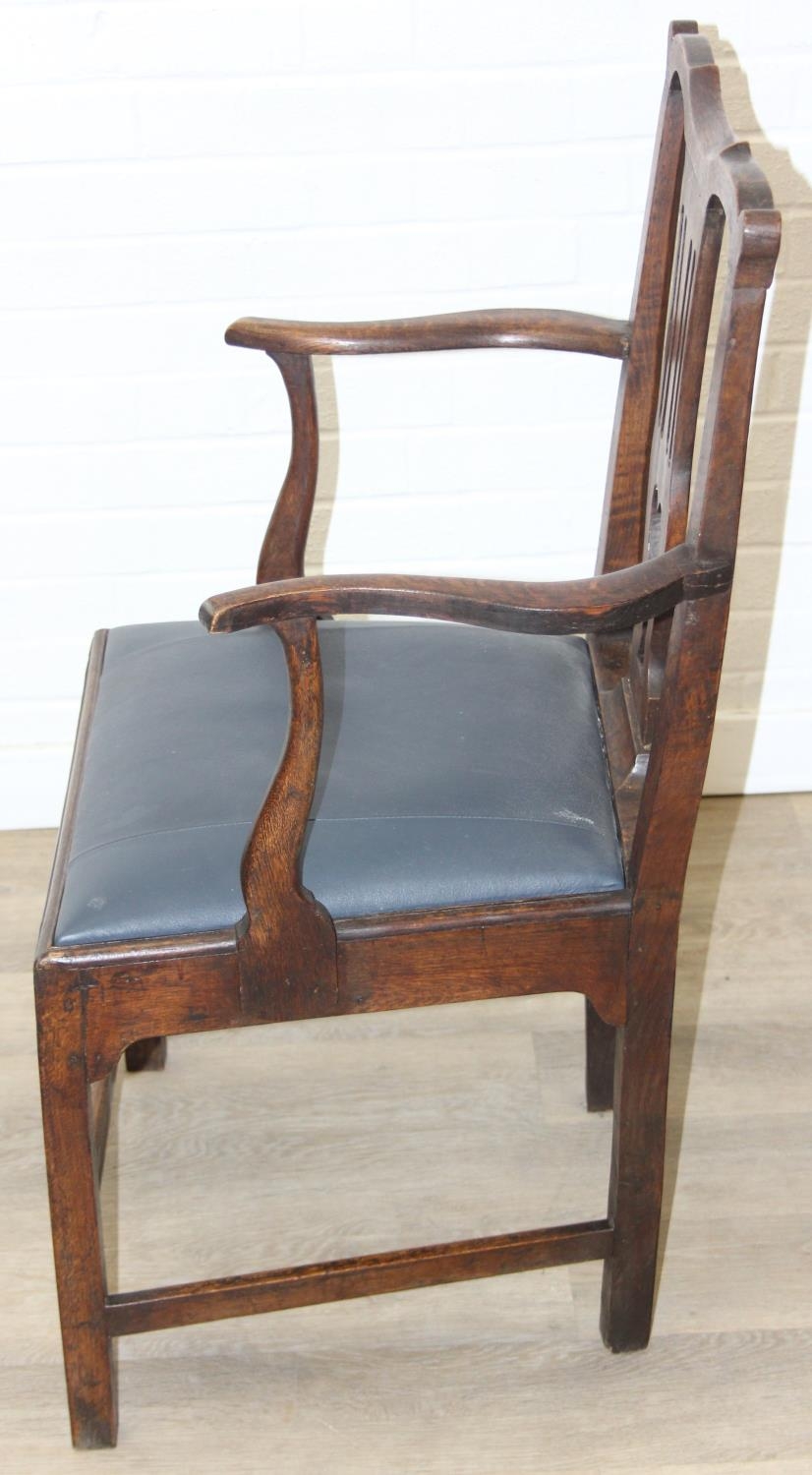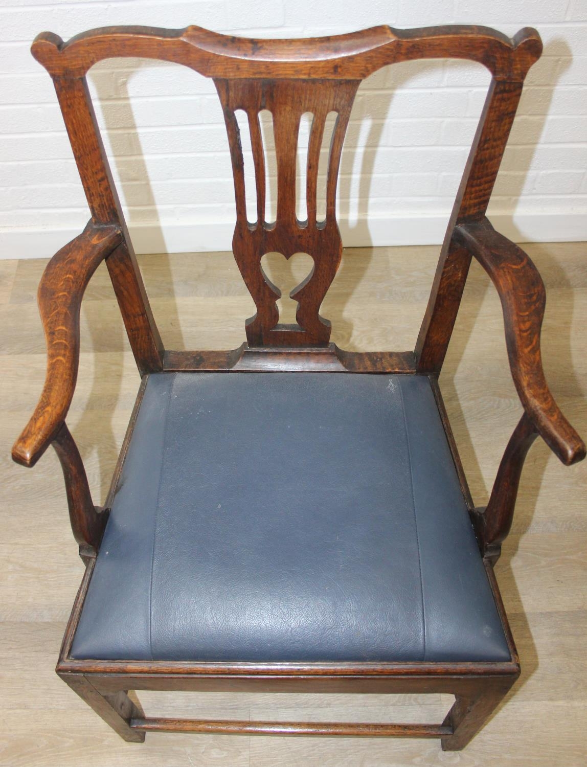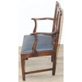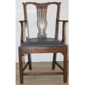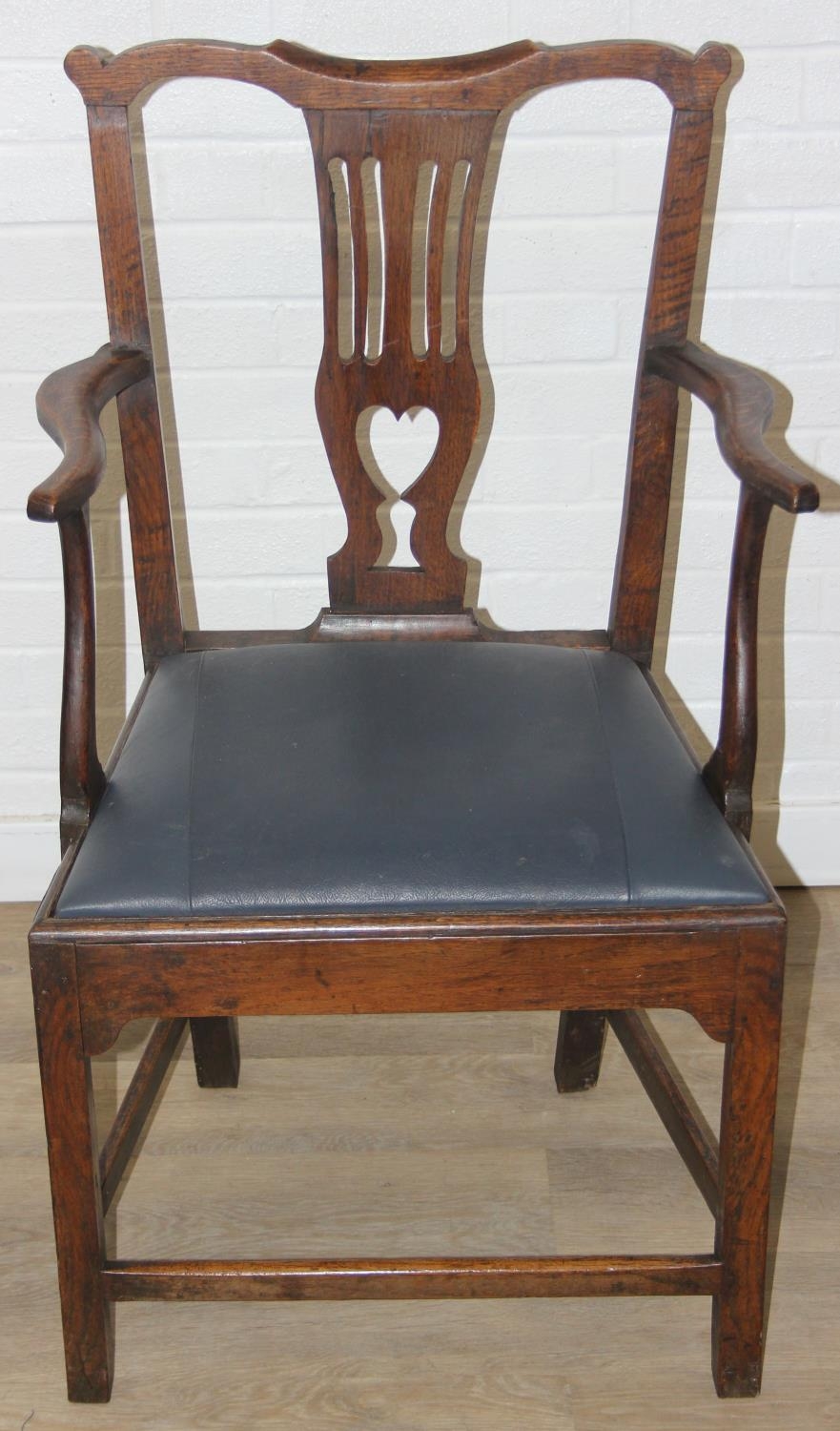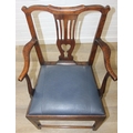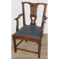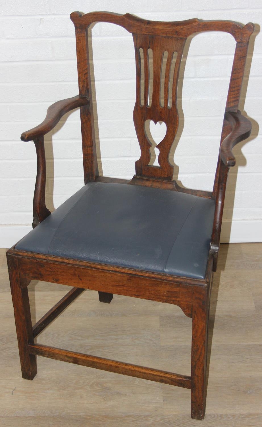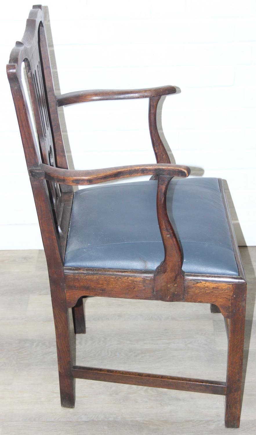 Georgian oak elbow chair with pierced splat and petrol blue leather upholstery, 60cm wide x 98cm tall